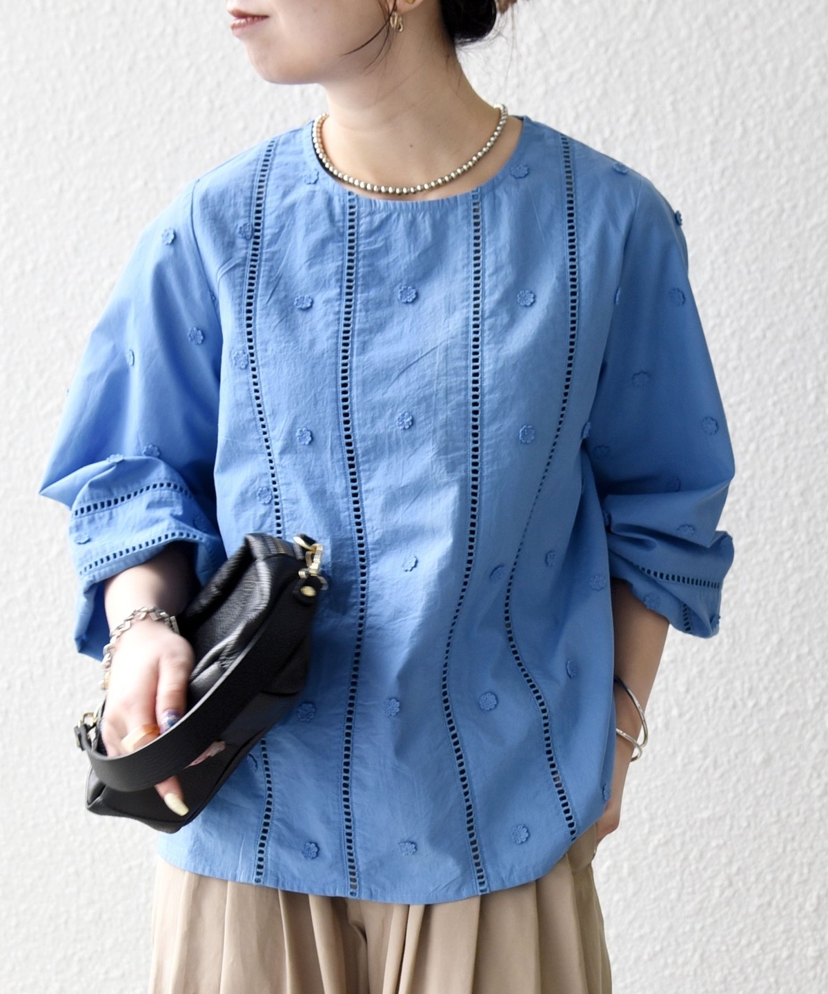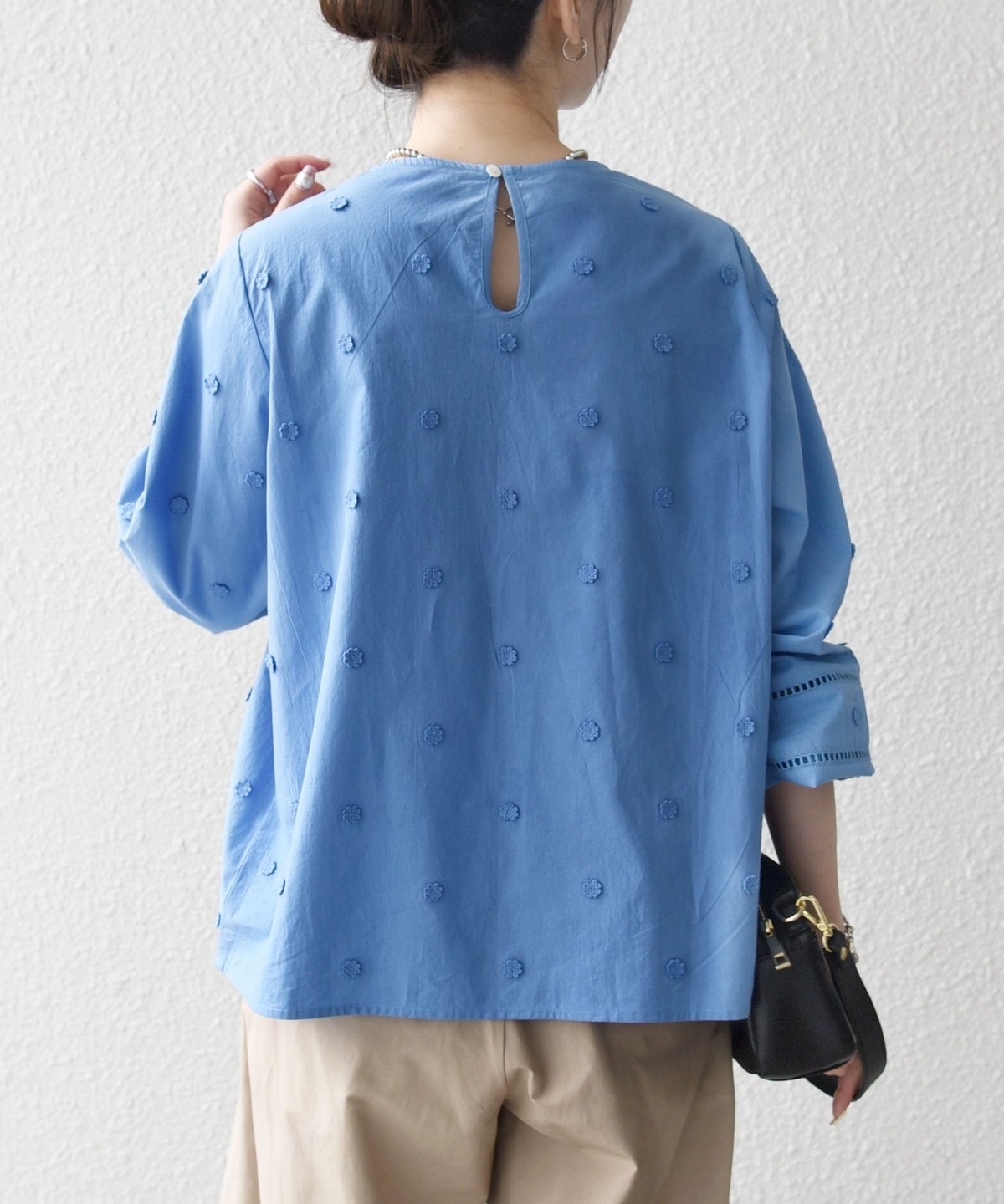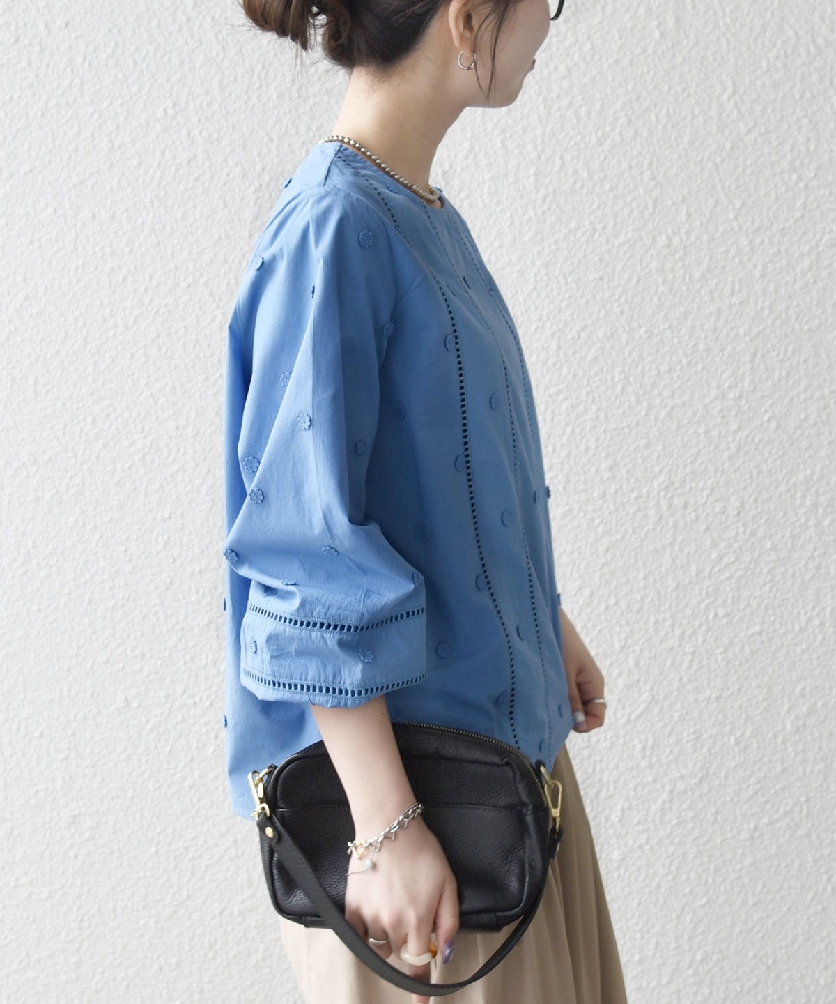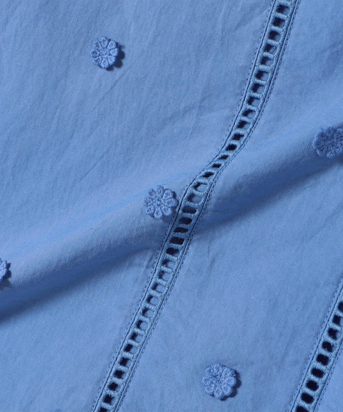 小さなお花のモチーフが散りばめられたノーカラーブラウス。