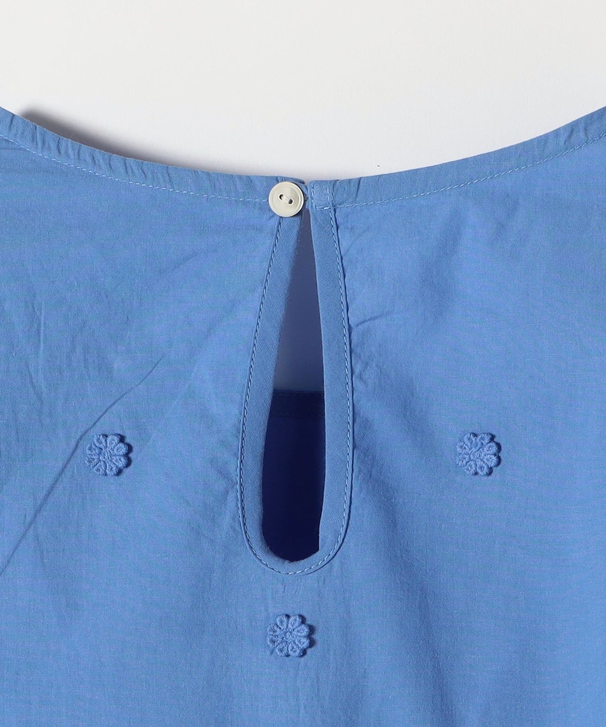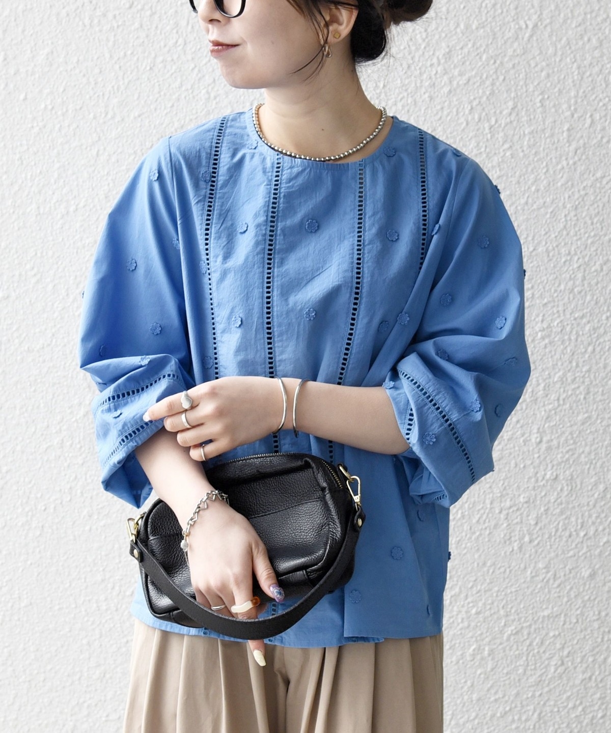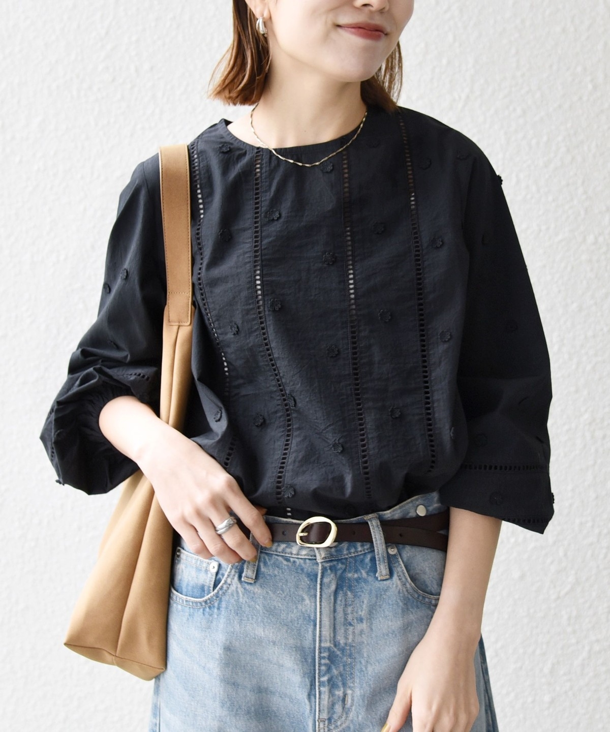 小さなお花のモチーフが散りばめられたノーカラーブラウス。
