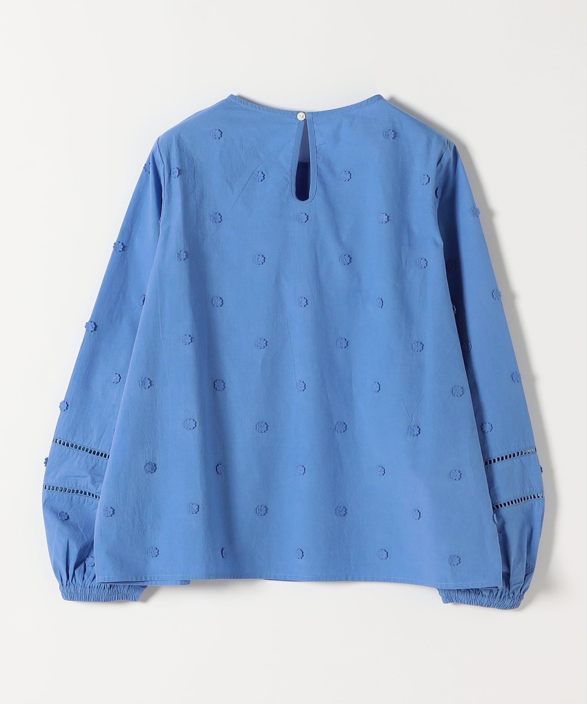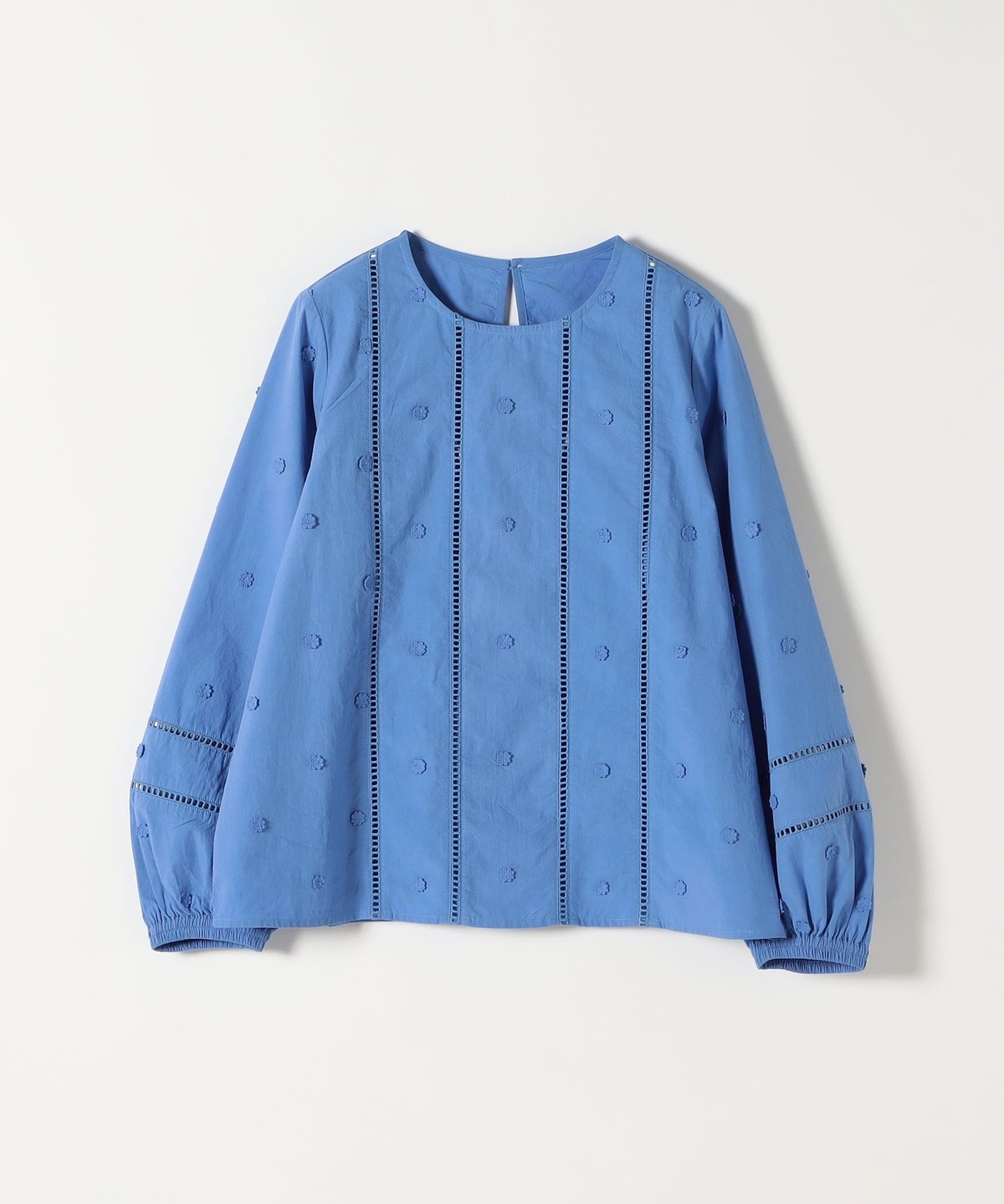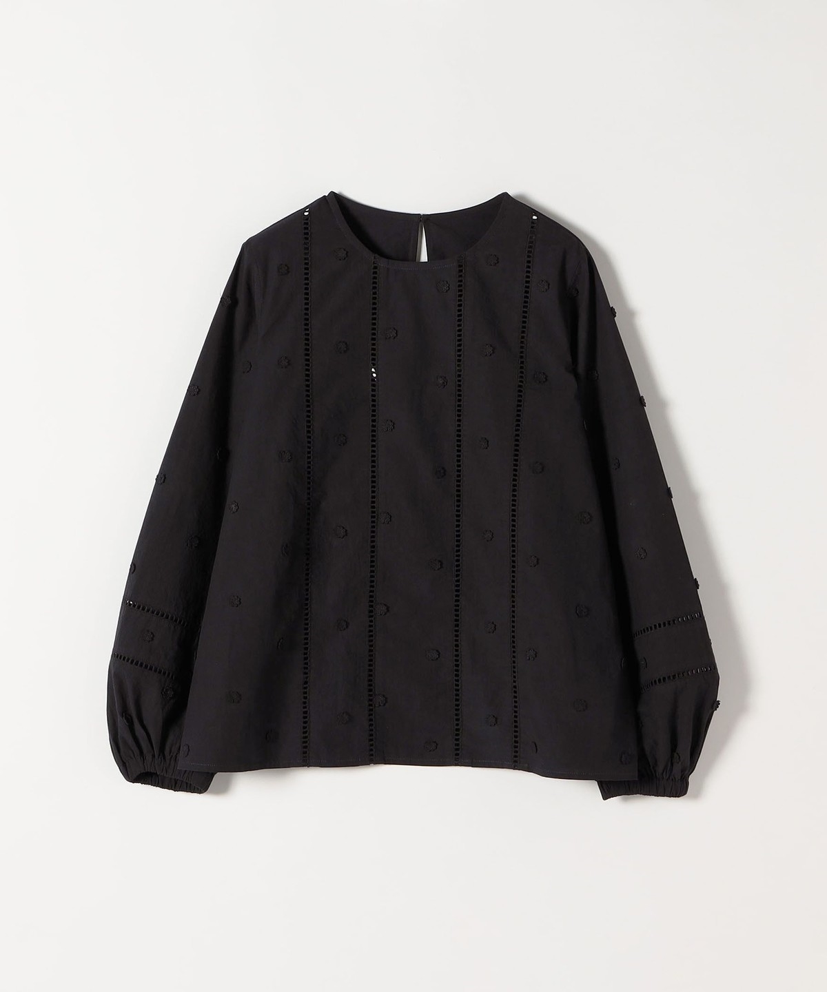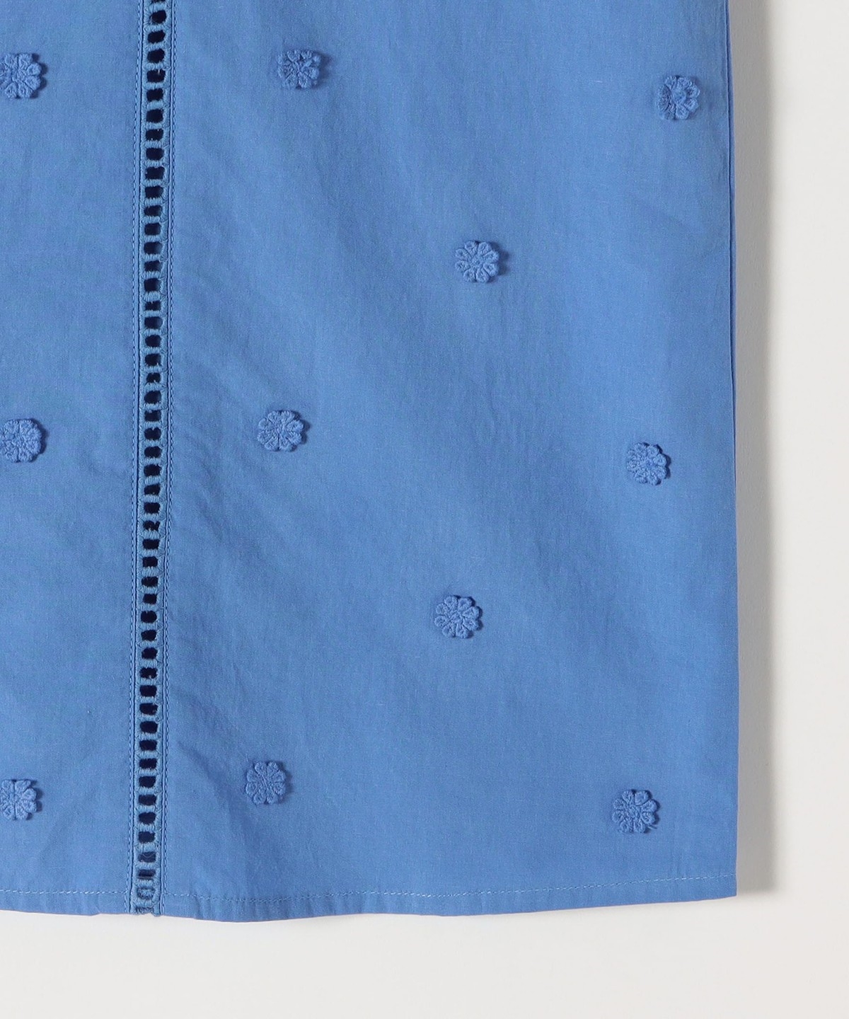 小さなお花のモチーフが散りばめられたノーカラーブラウス。