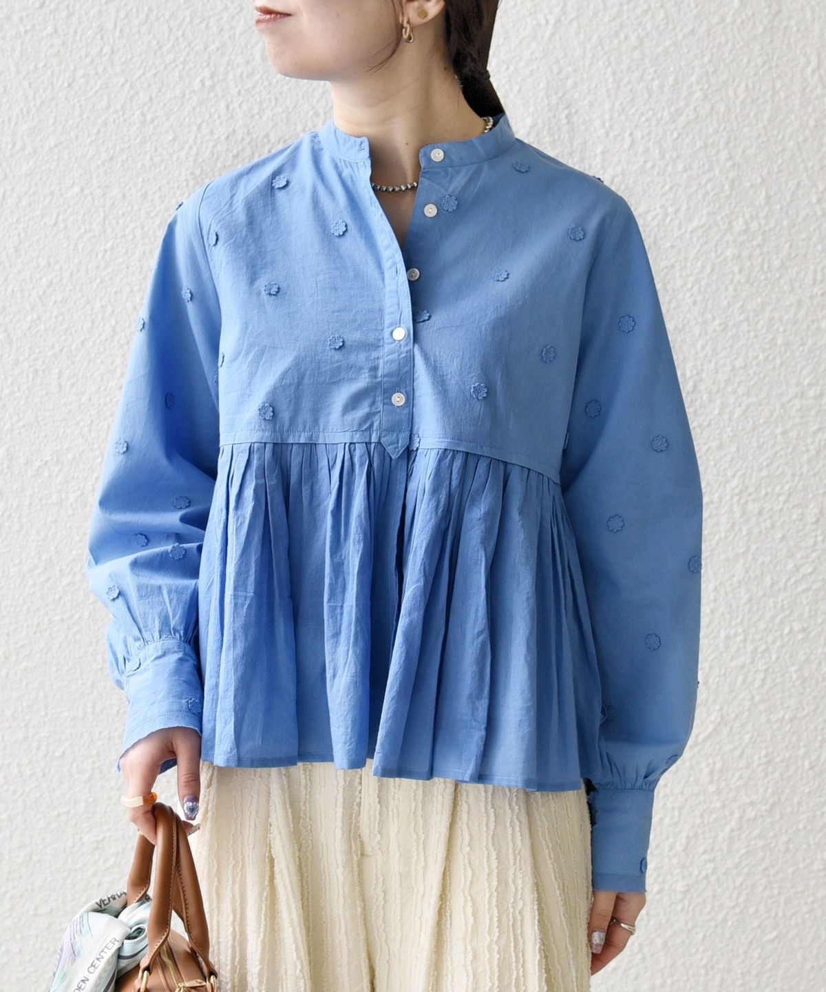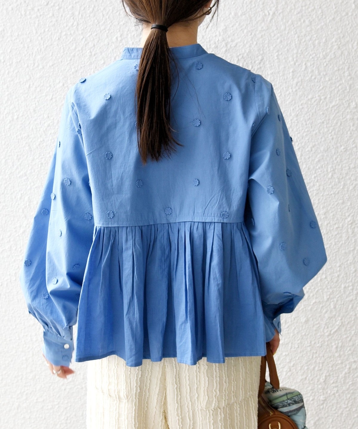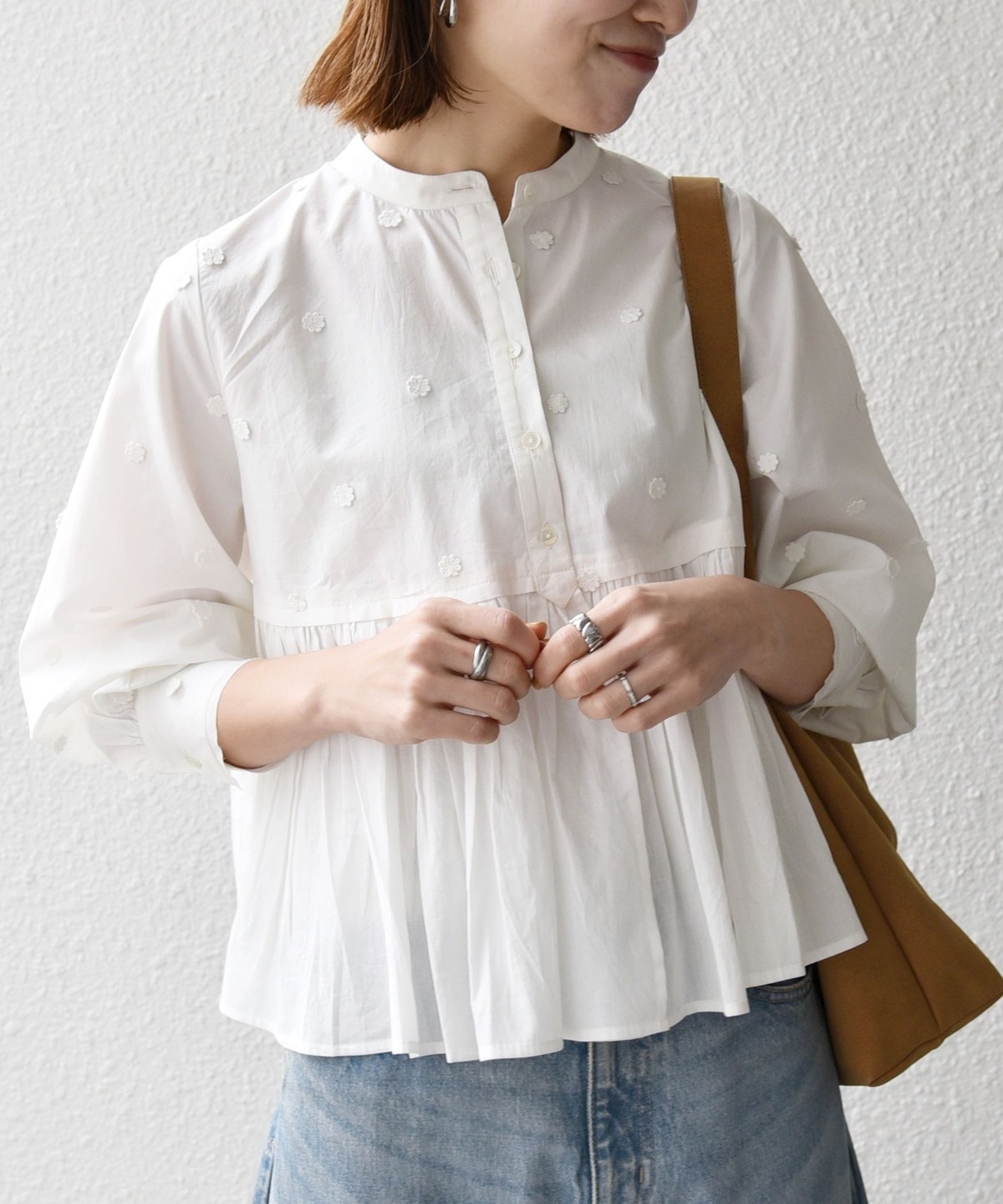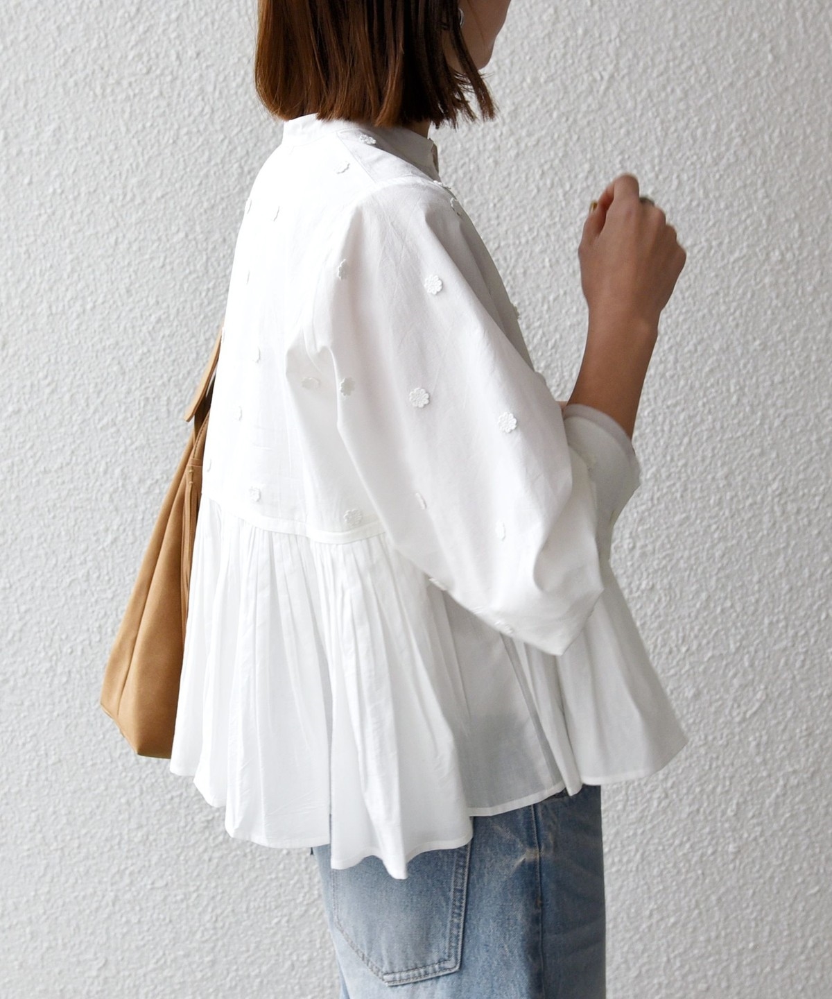 小さなお花のモチーフが散りばめられたペプラムシャツブラウス。
