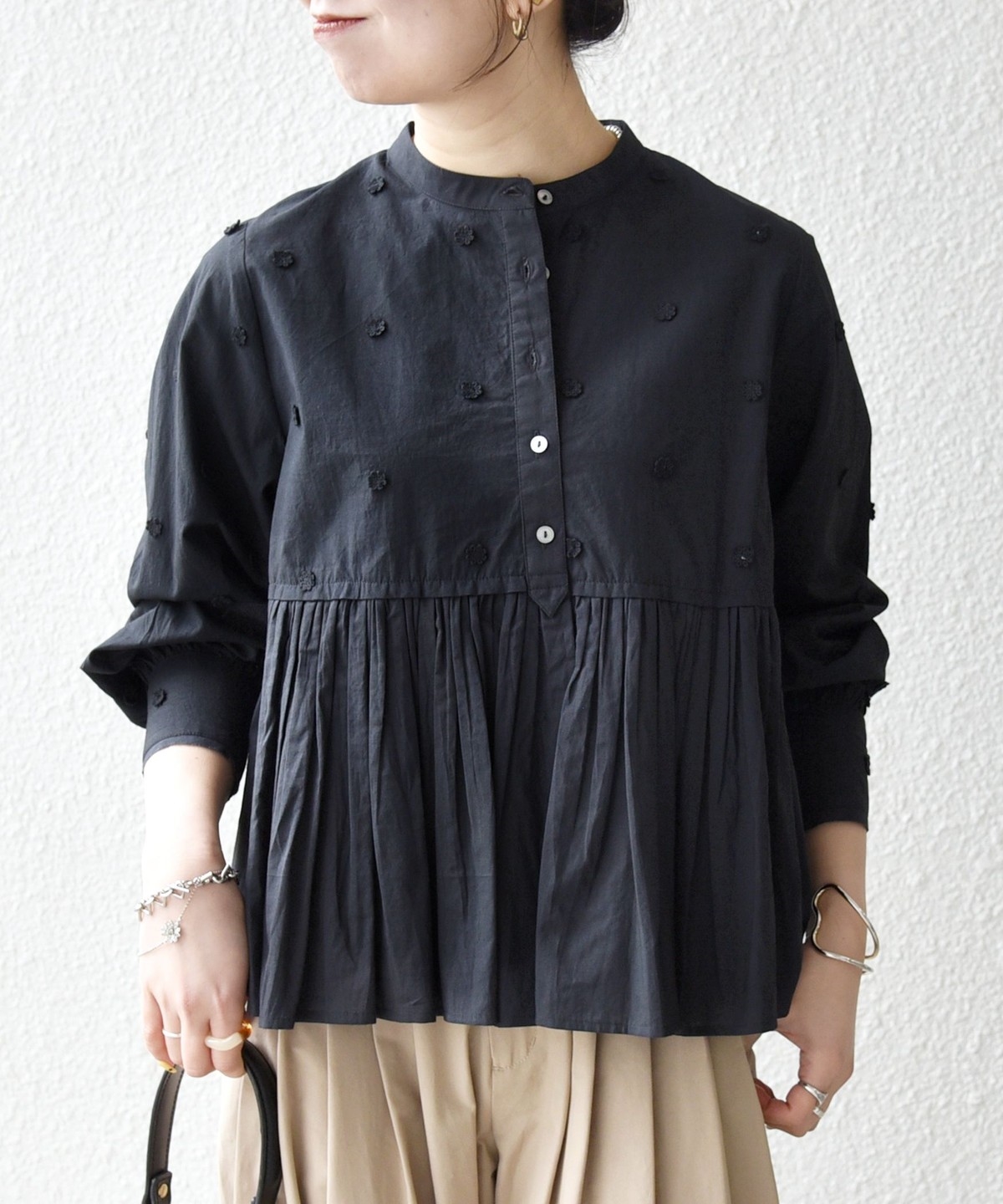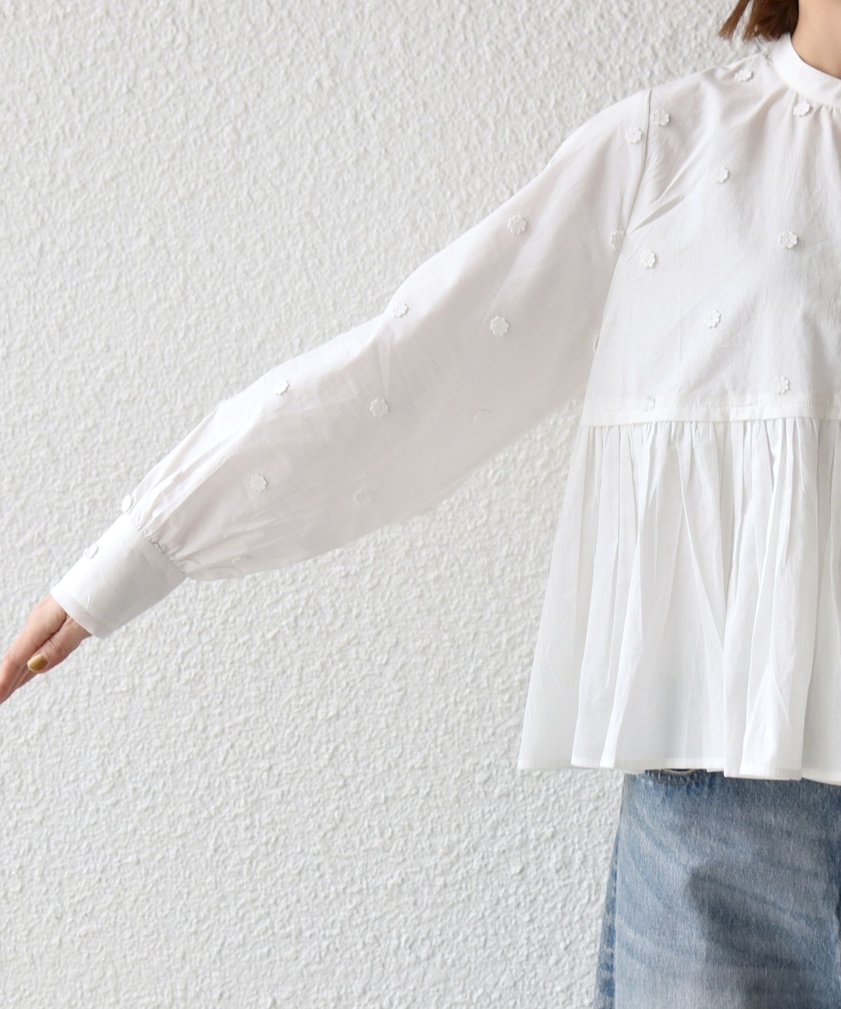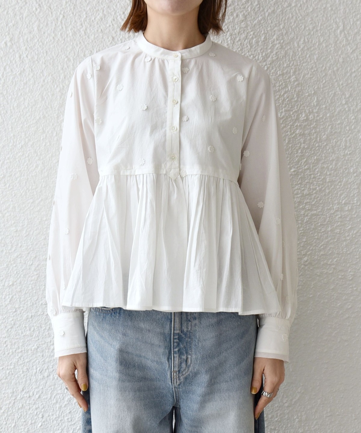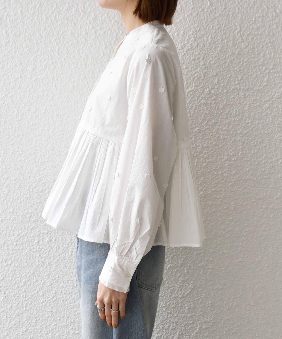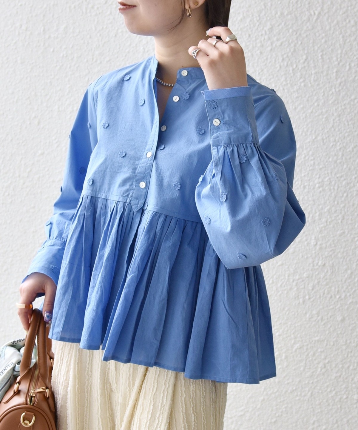 小さなお花のモチーフが散りばめられたペプラムシャツブラウス。