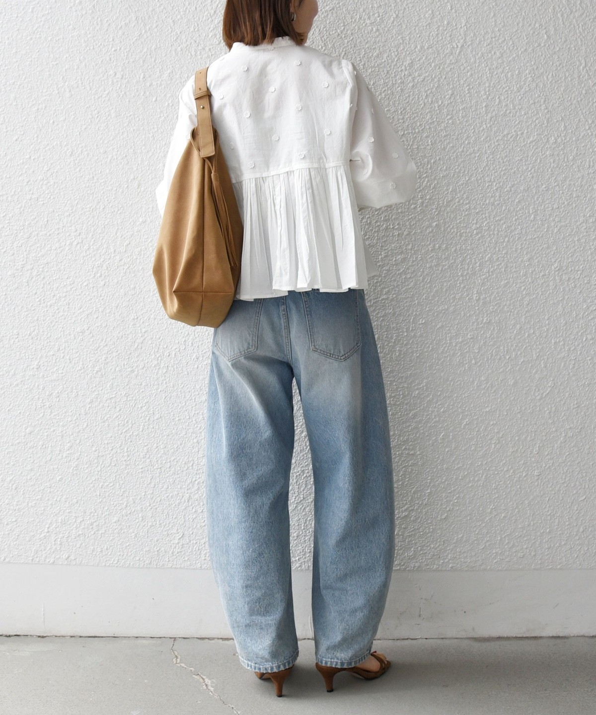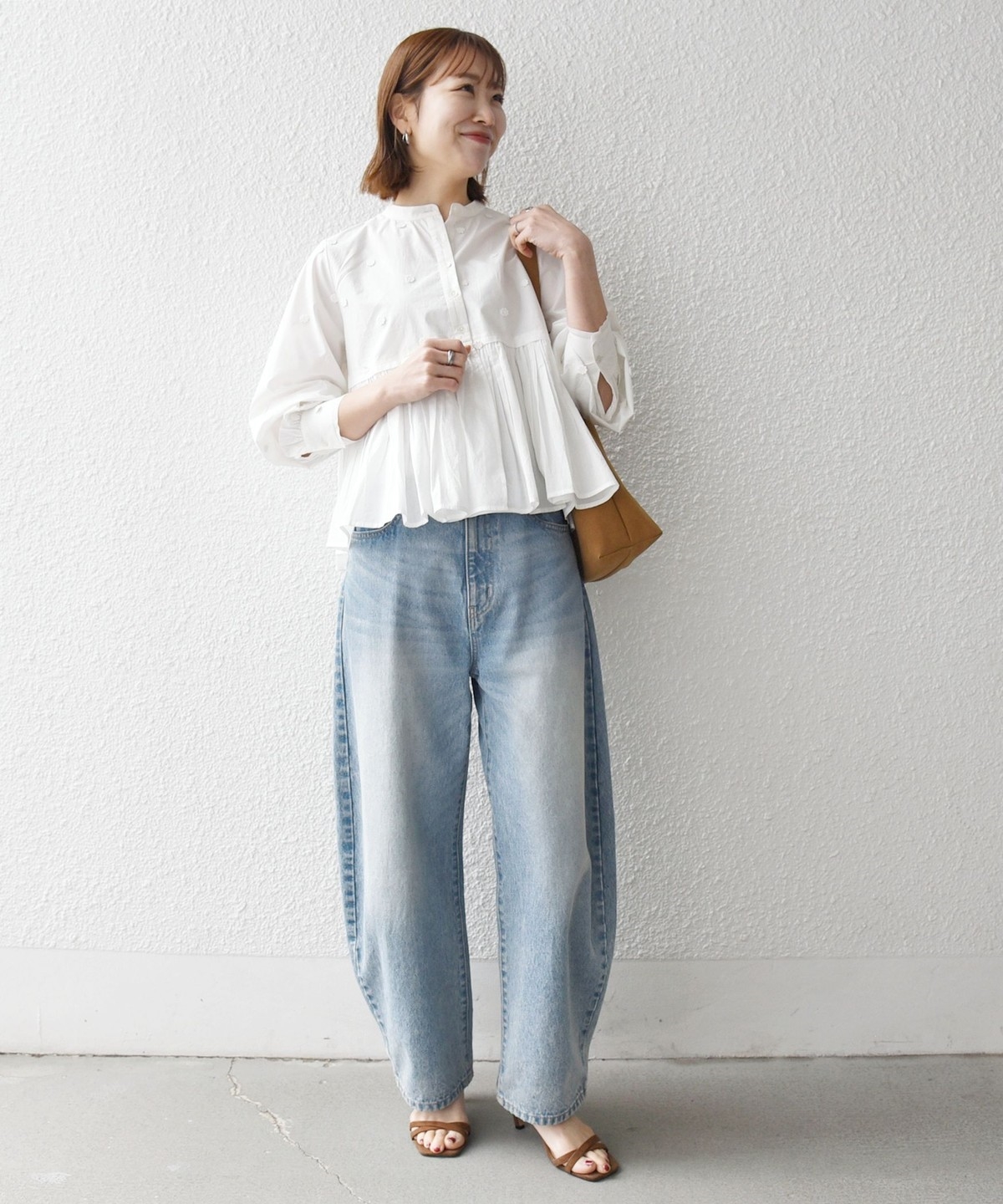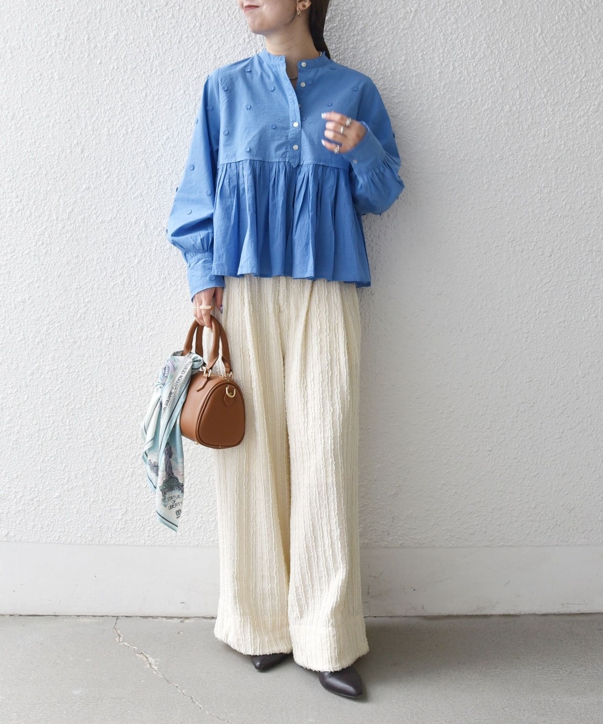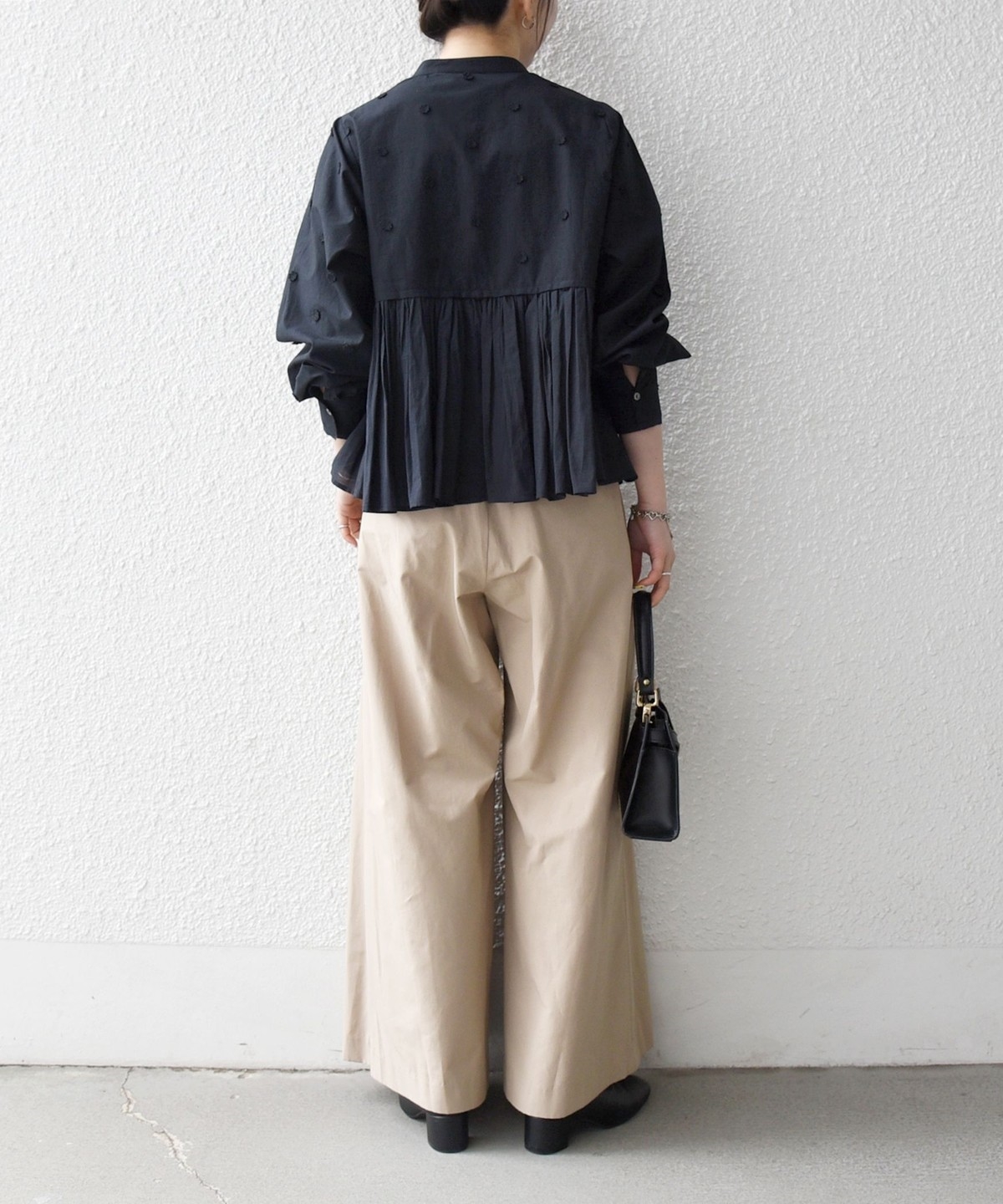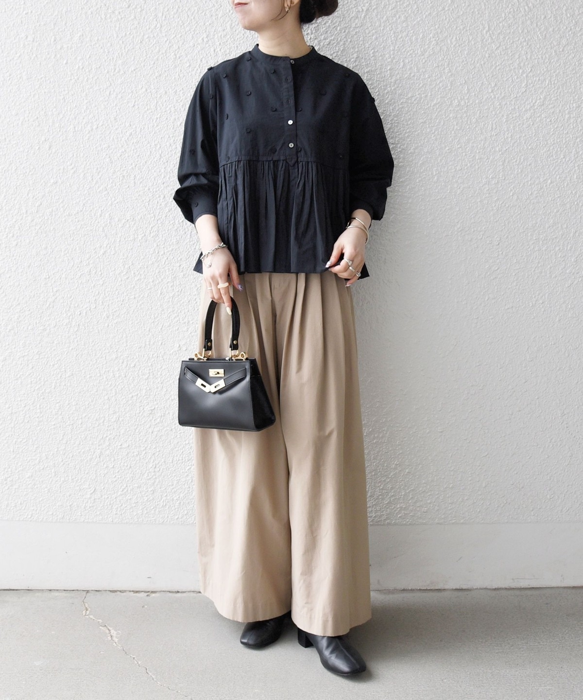 やや短めの丈なので、ワイドパンツ合わせもタックアウトのままでバランスよく決まります。