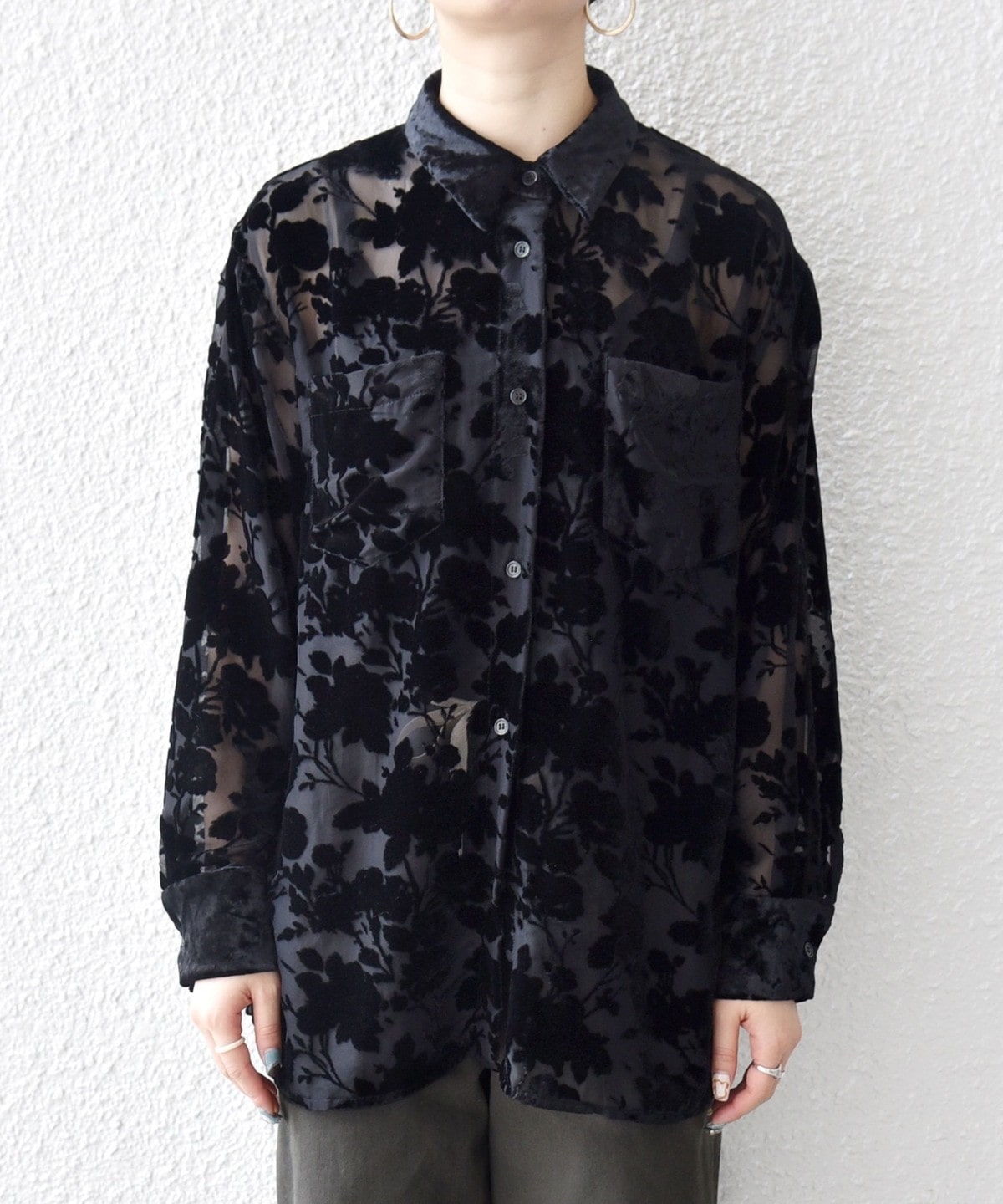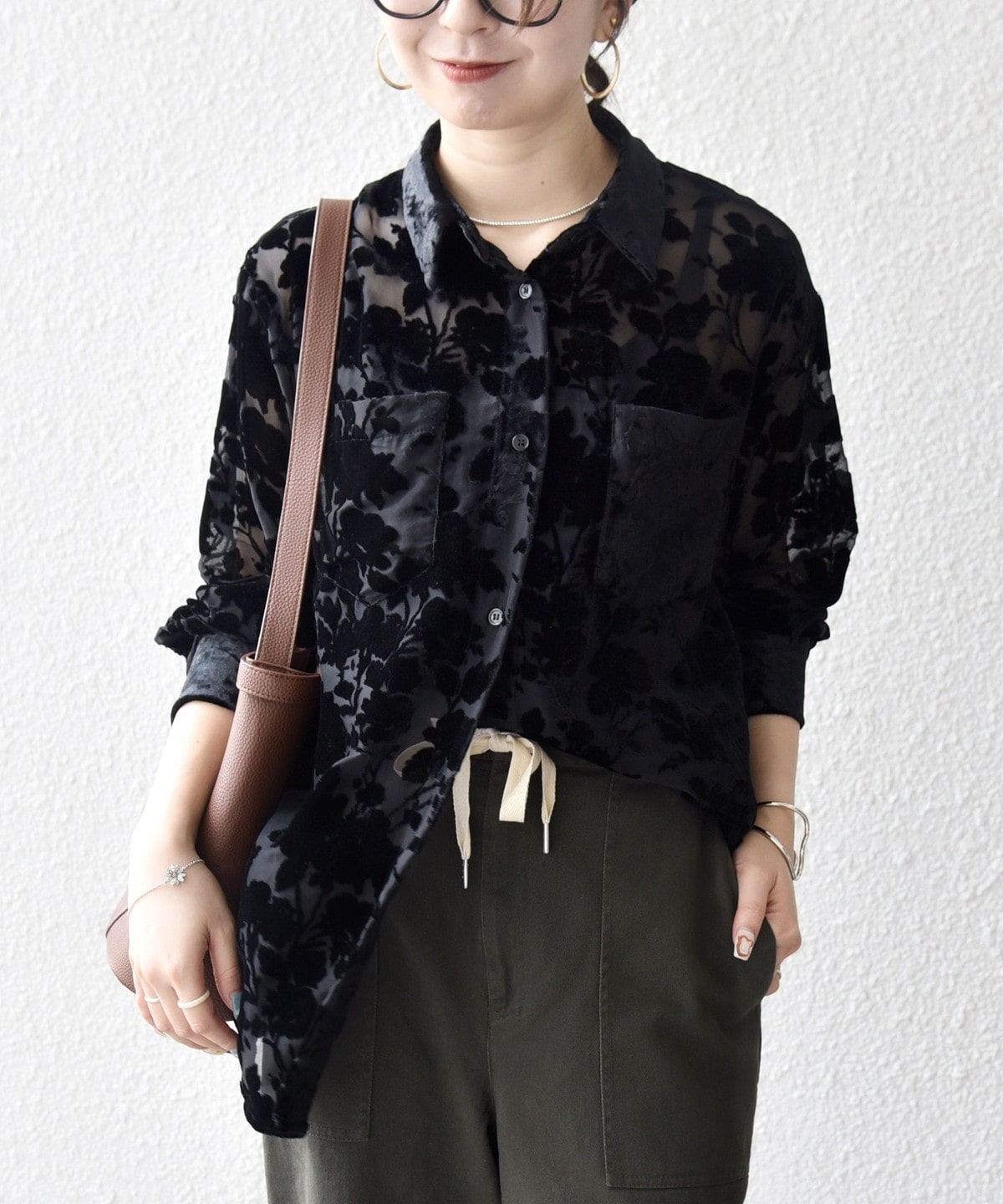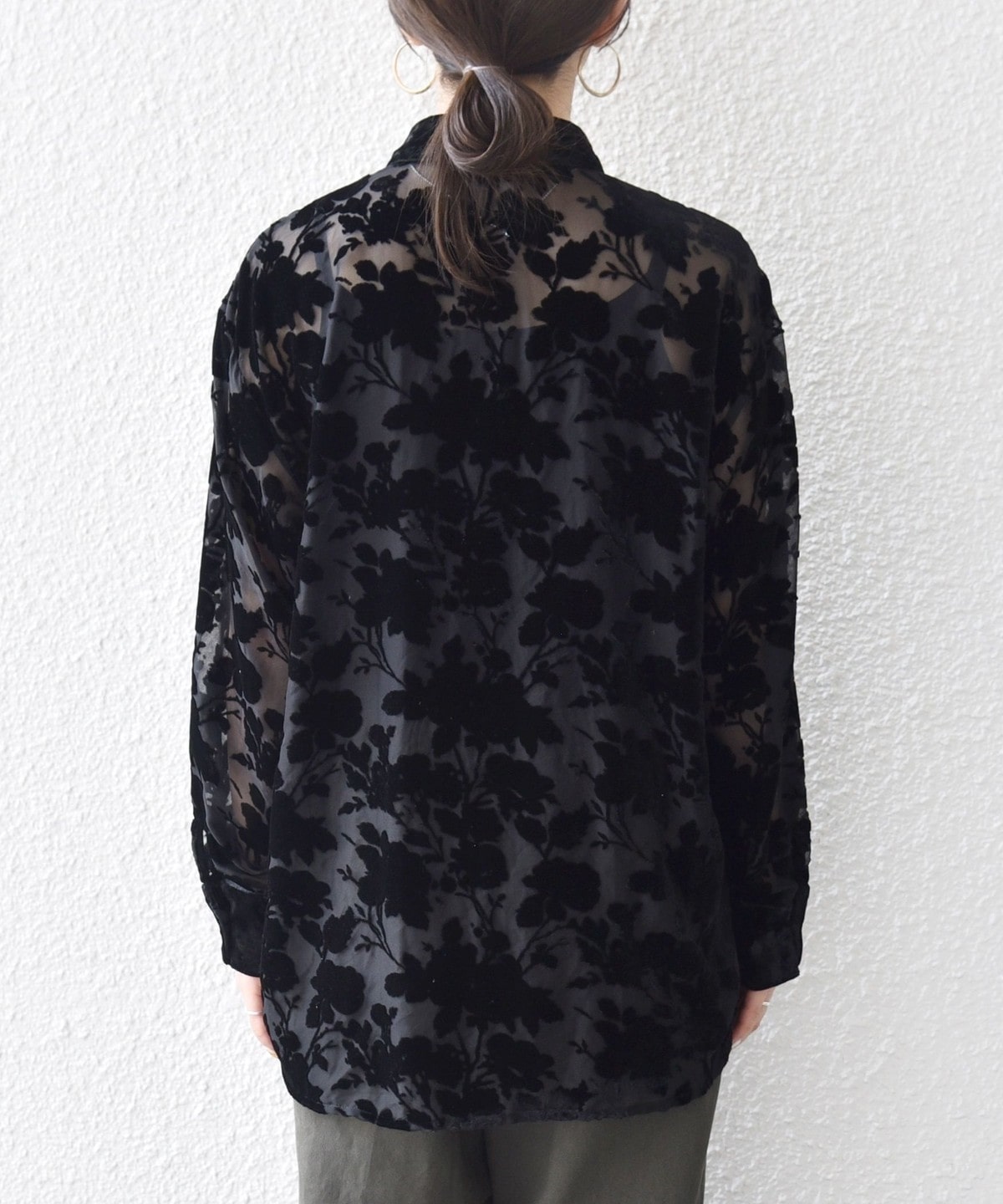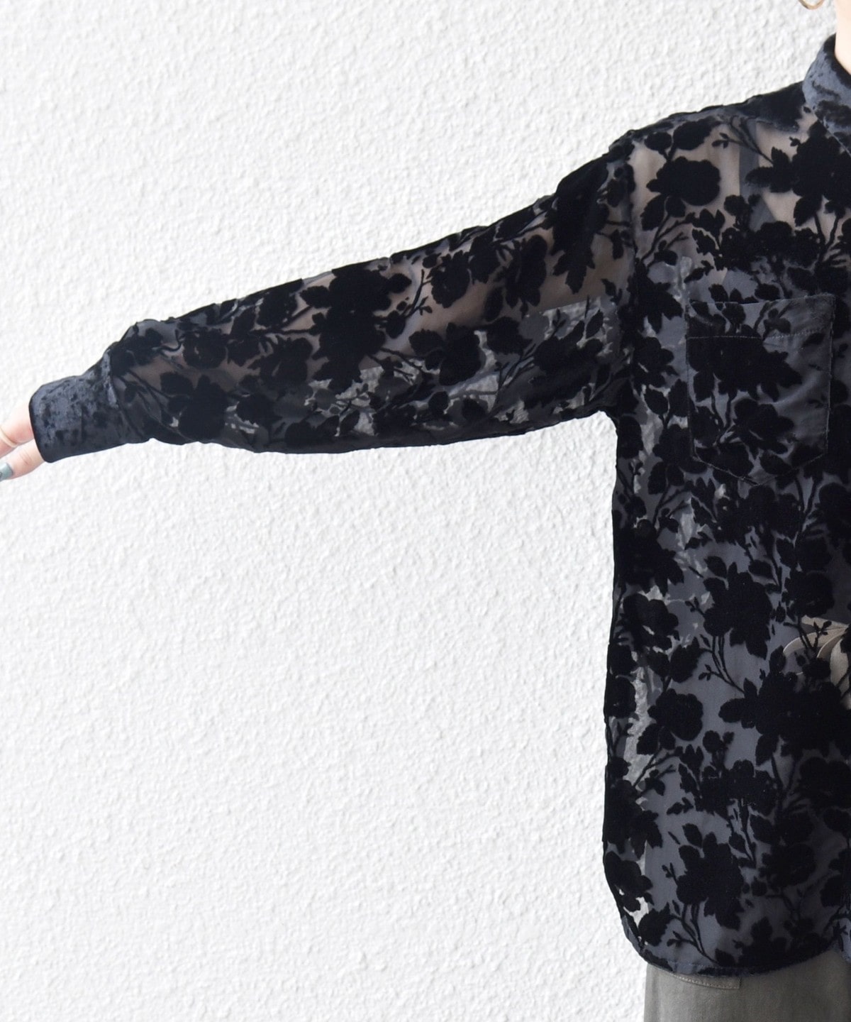 透け感のある生地に浮かぶフラワーモチーフが目を惹くシャツブラウス。