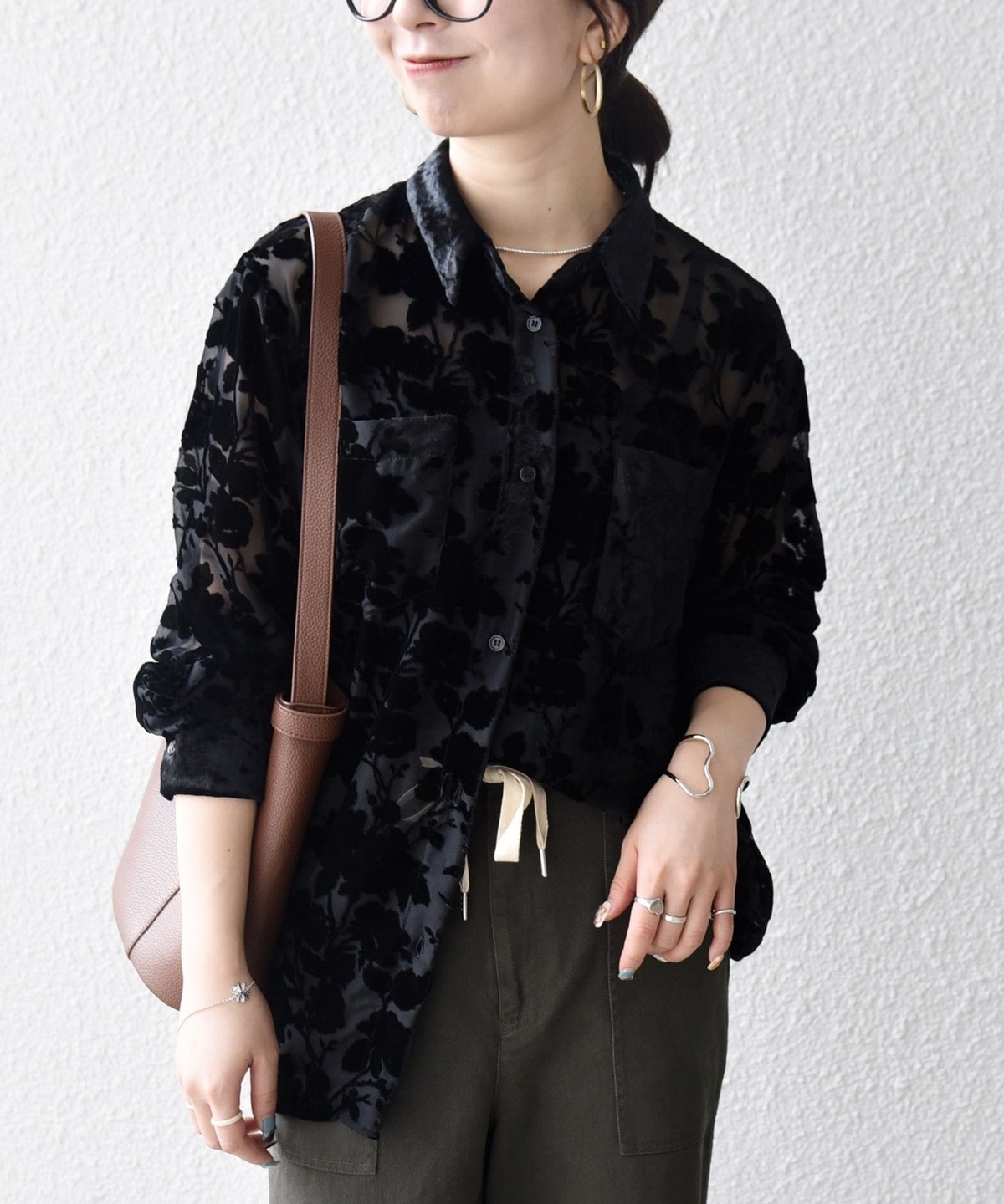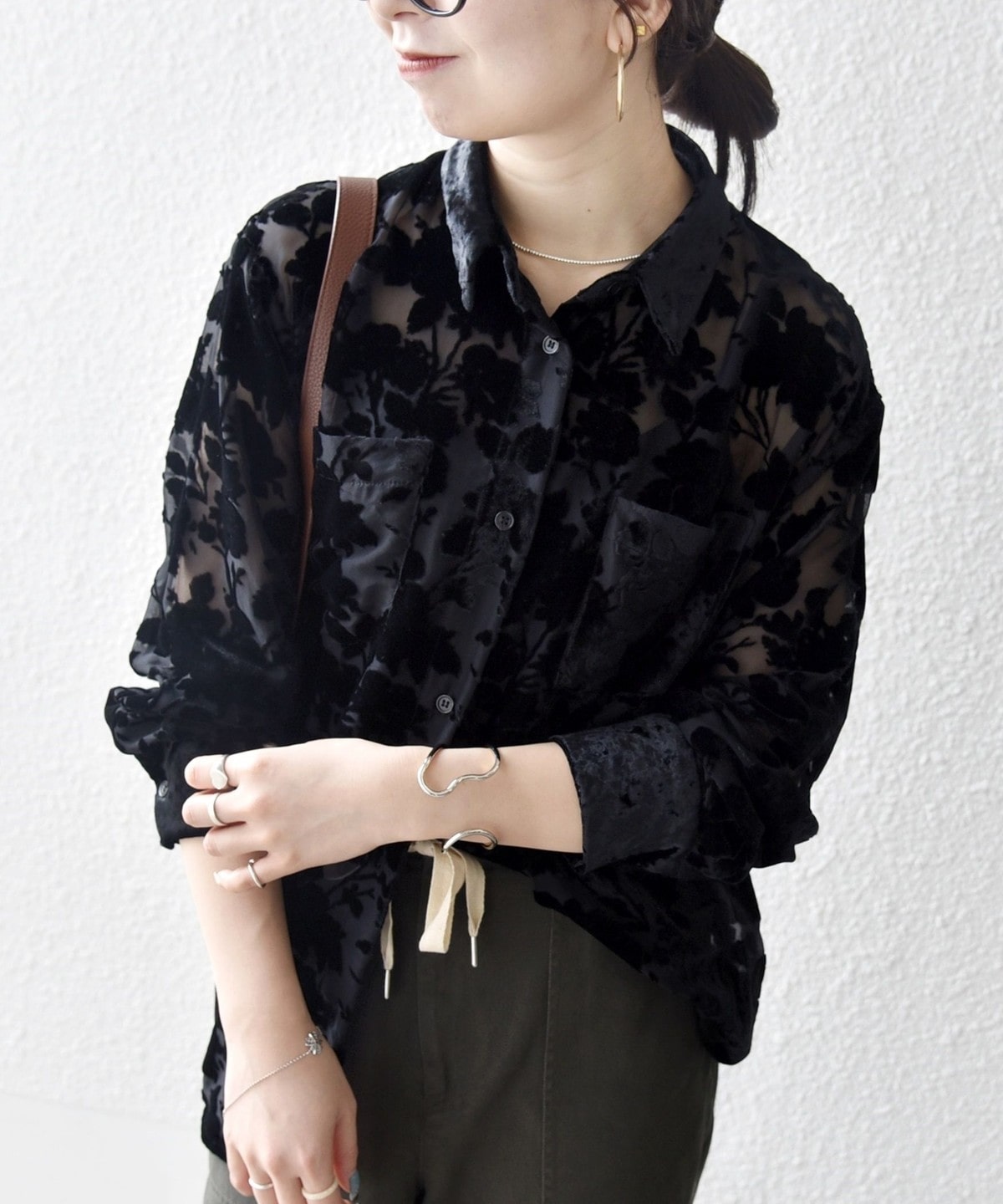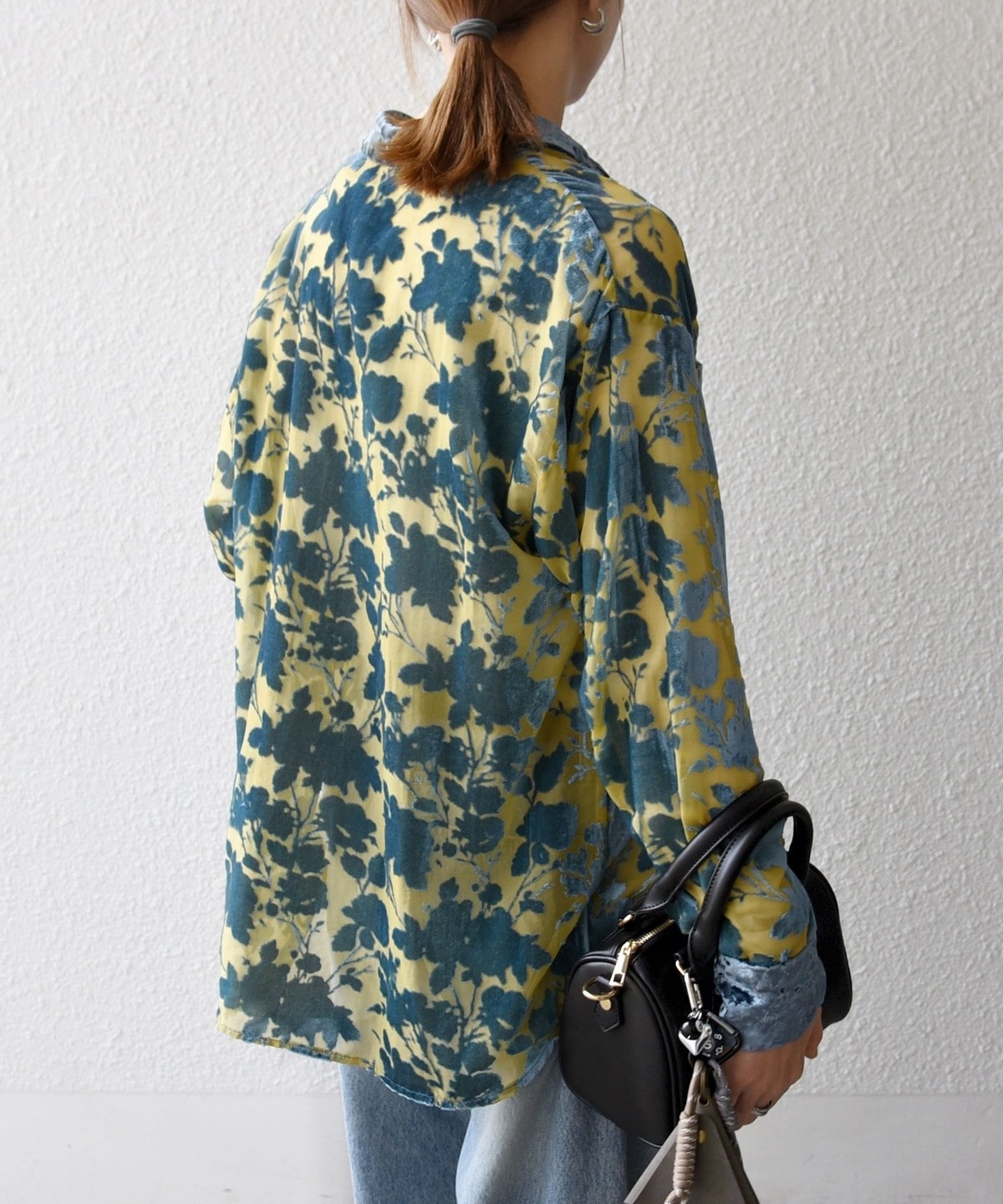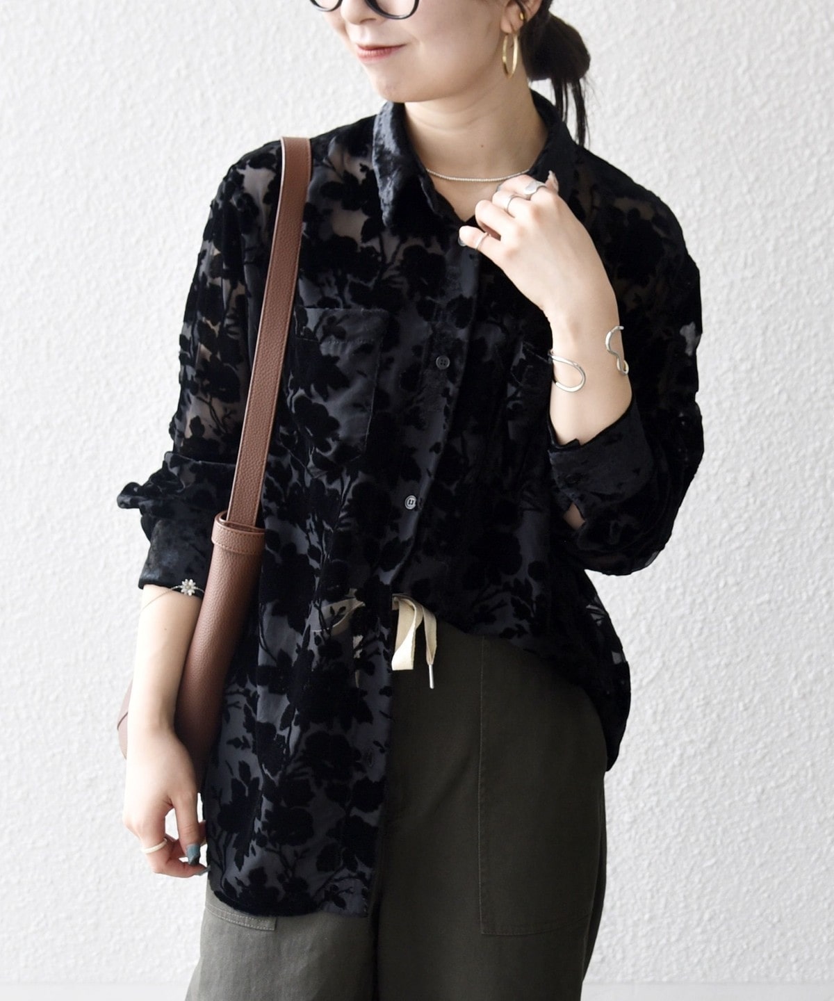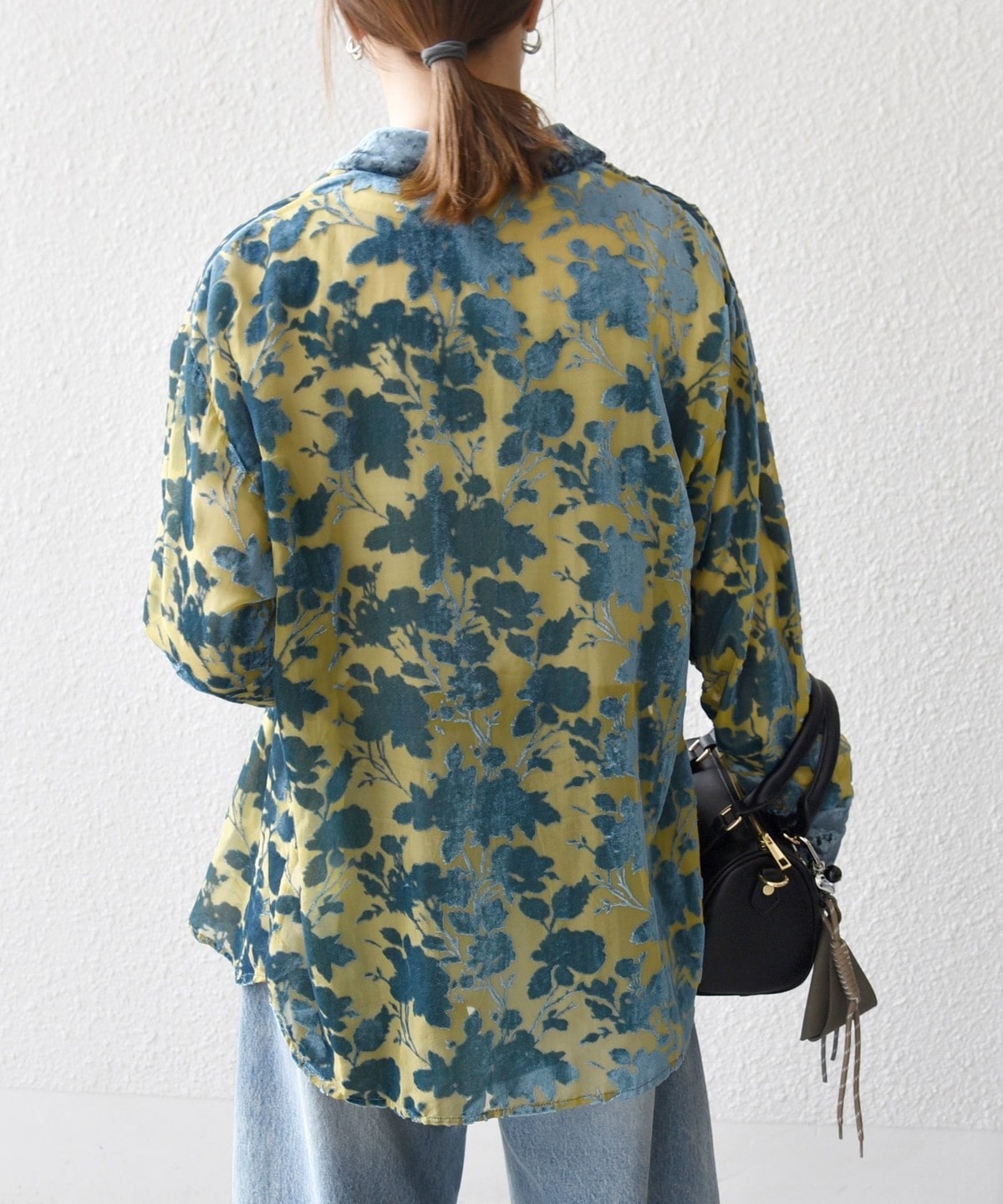 透け感のある生地に浮かぶフラワーモチーフが目を惹くシャツブラウス。