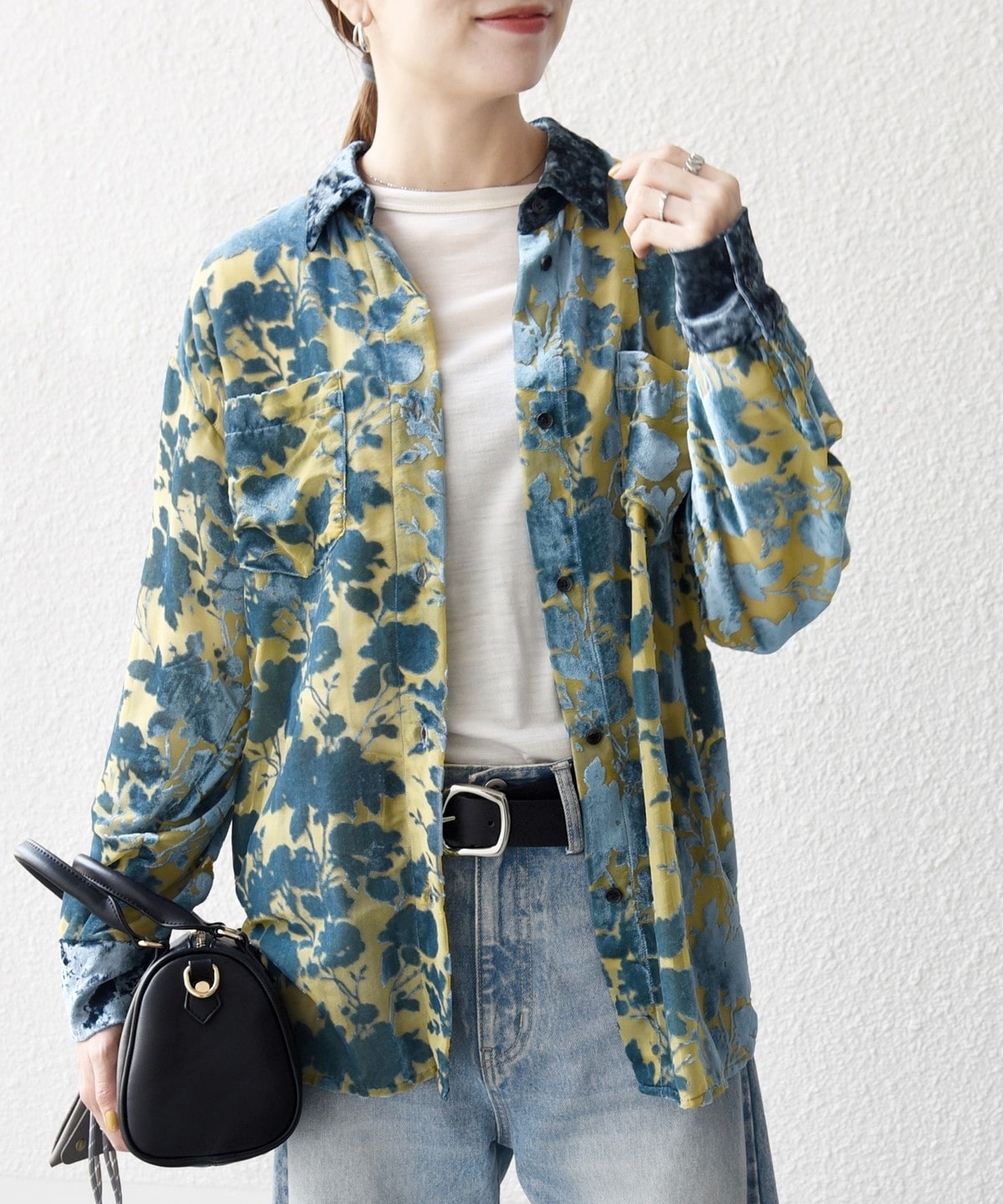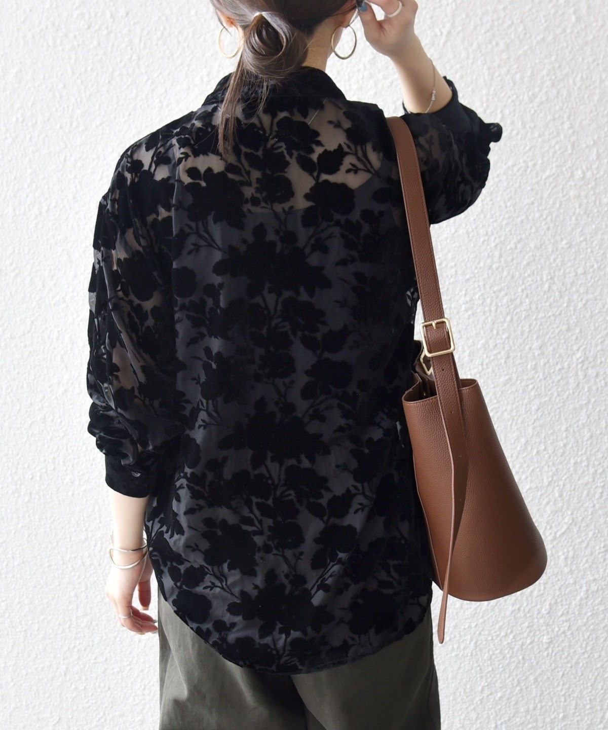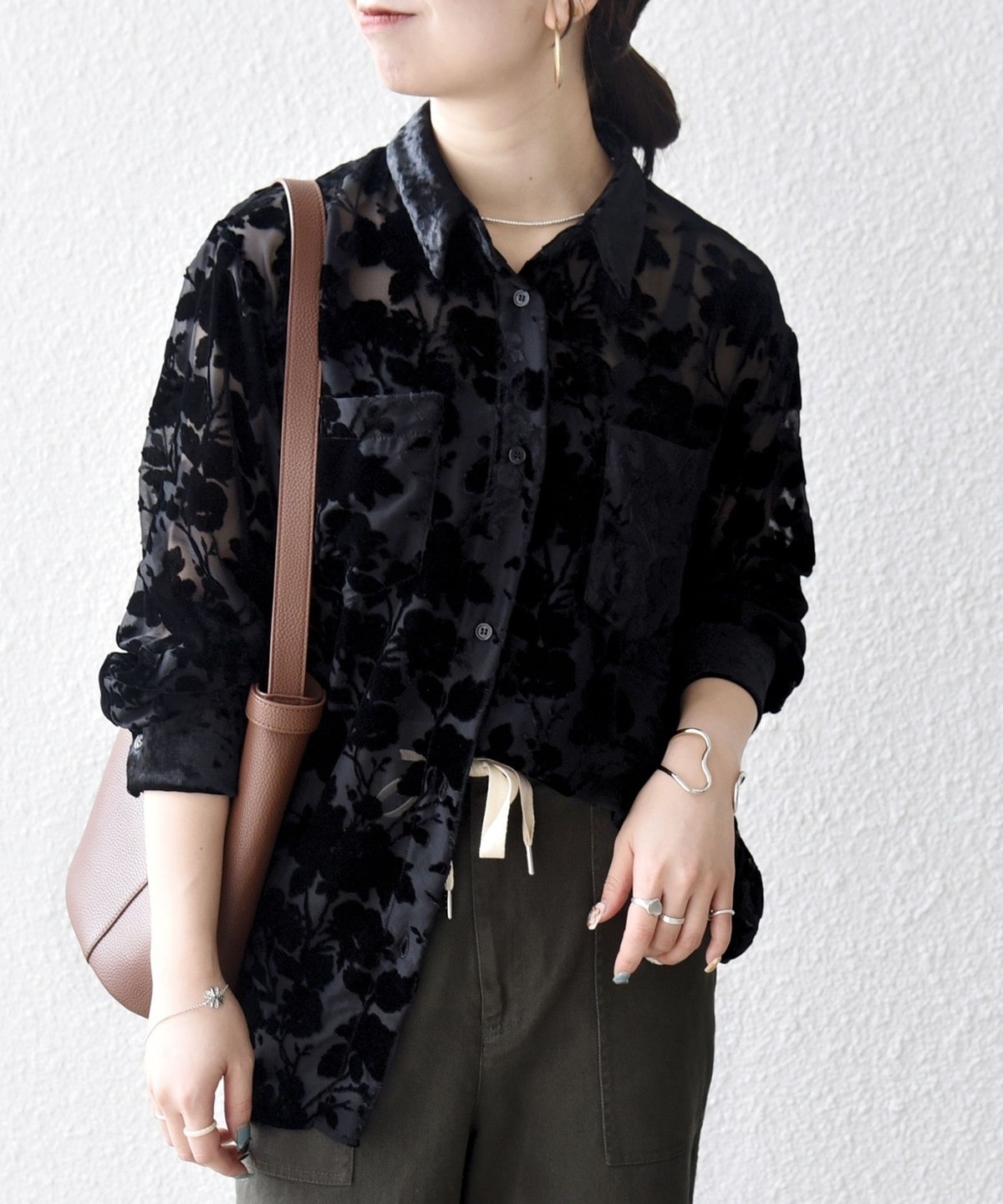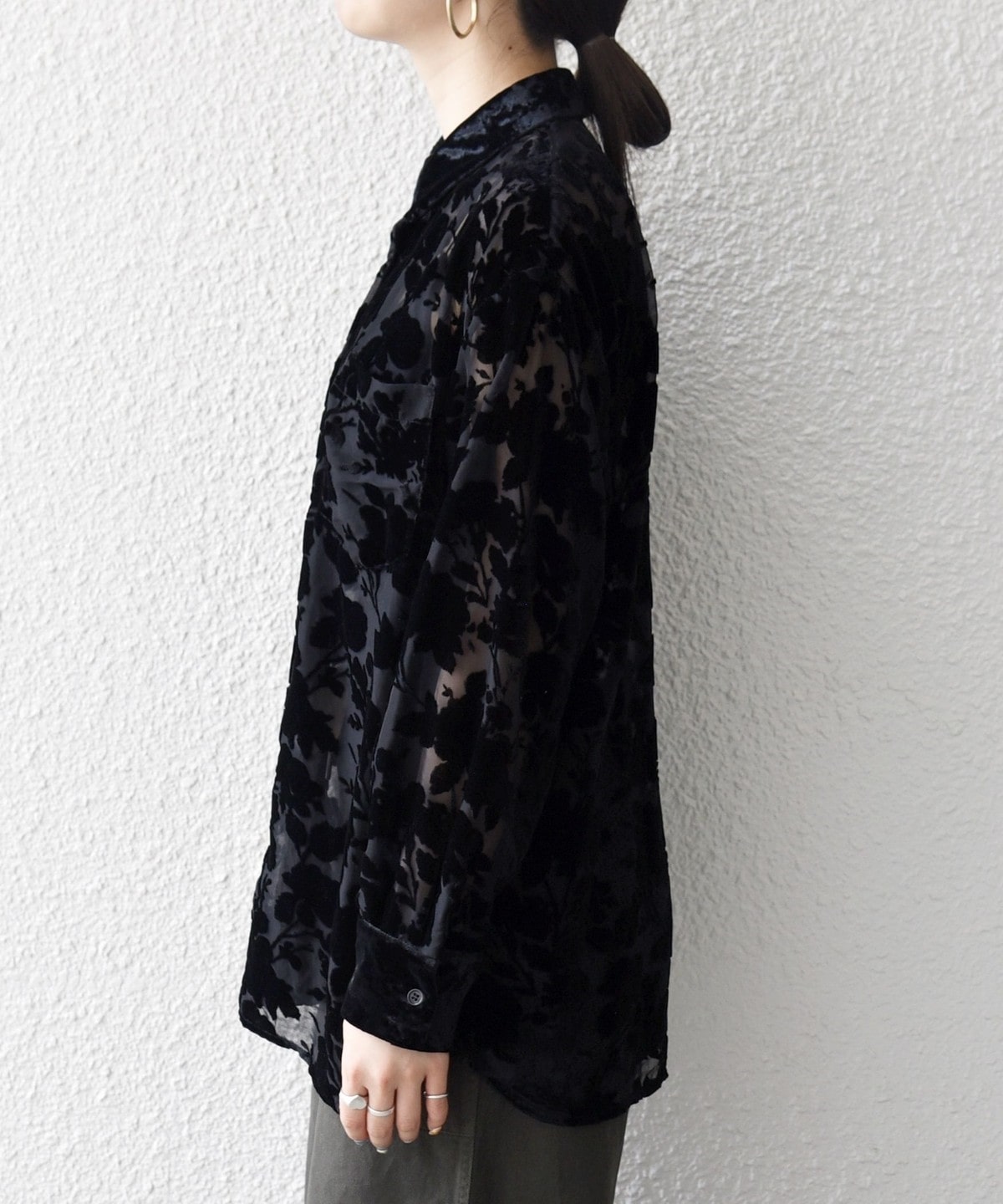 透け感のある生地に浮かぶフラワーモチーフが目を惹くシャツブラウス。