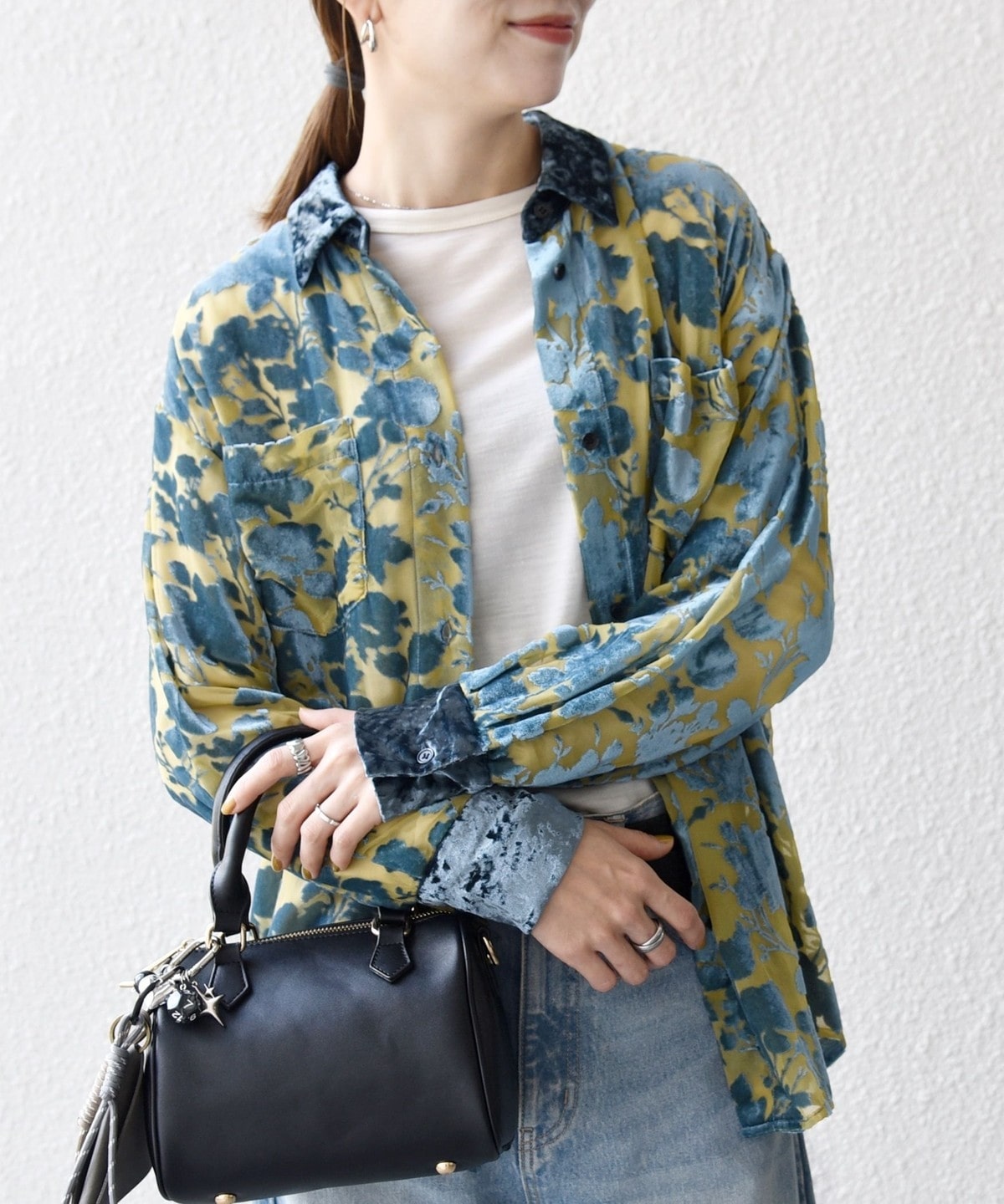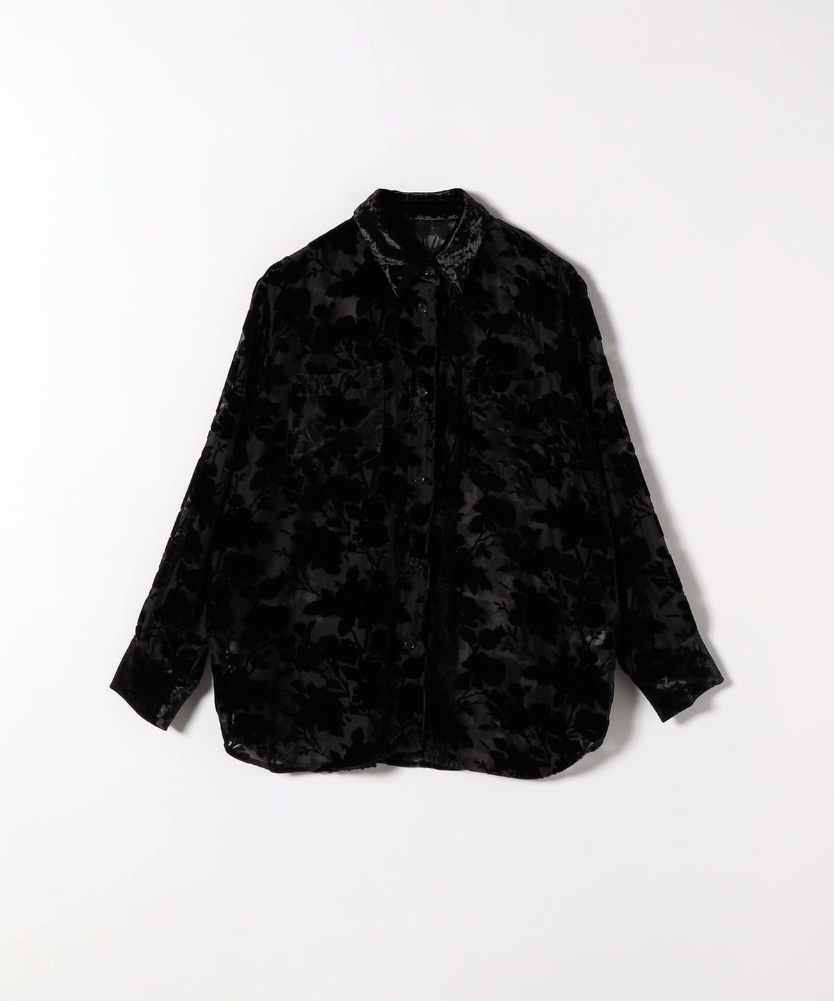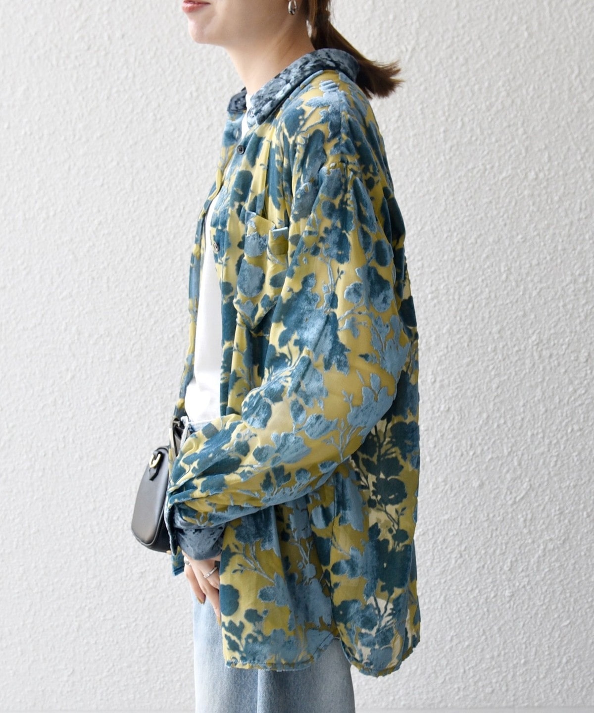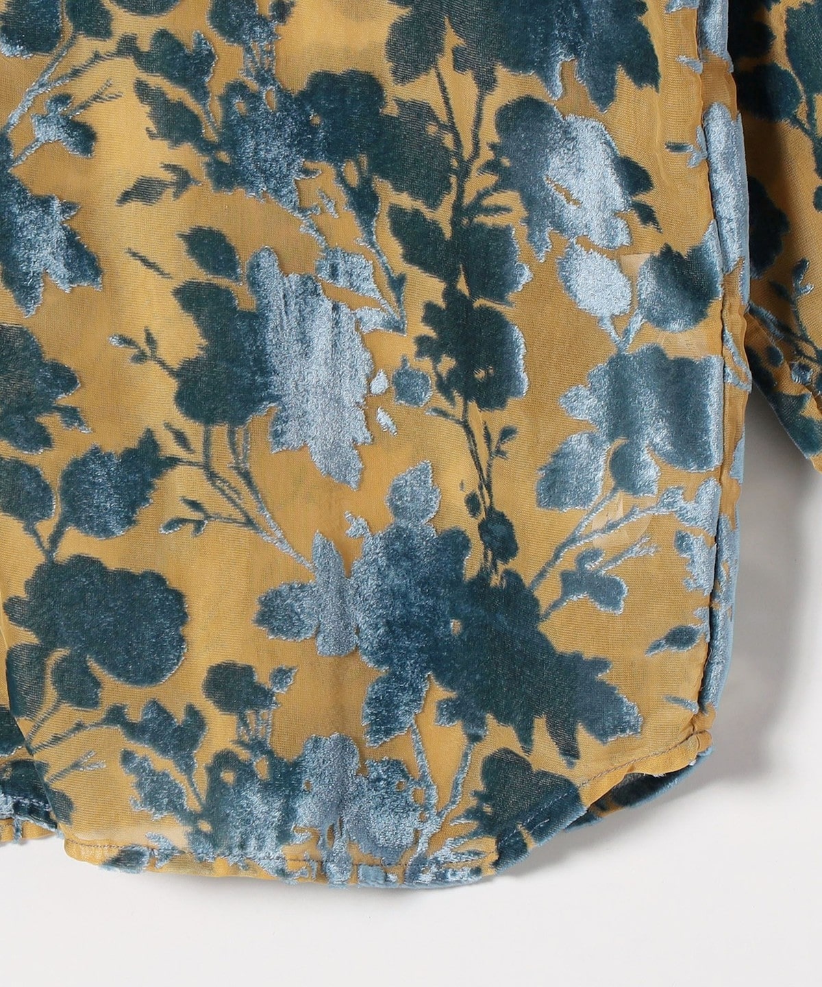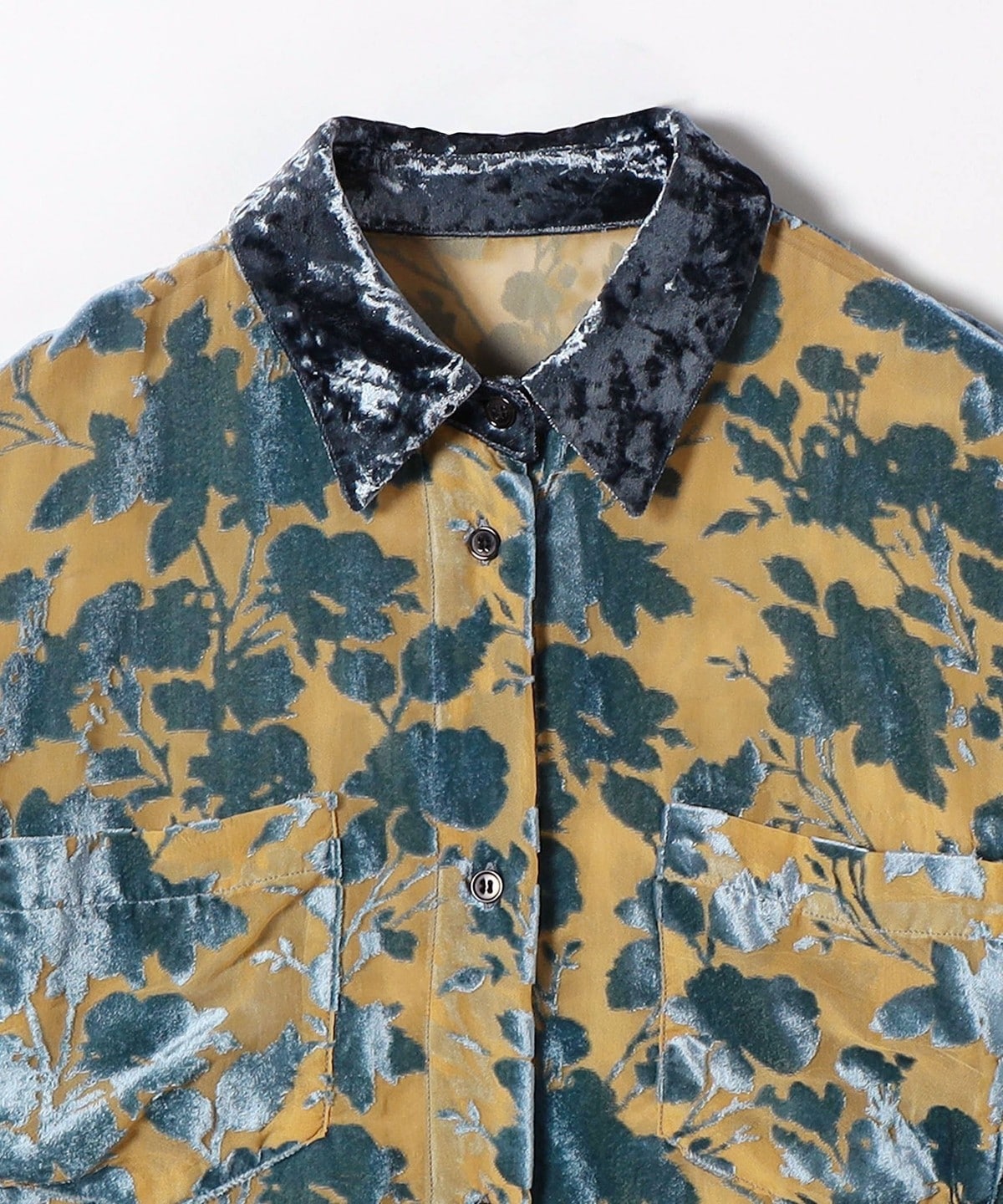 透け感のある生地に浮かぶフラワーモチーフが目を惹くシャツブラウス。