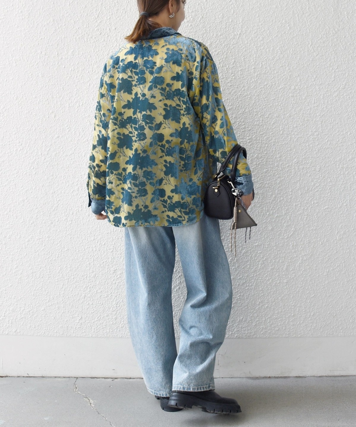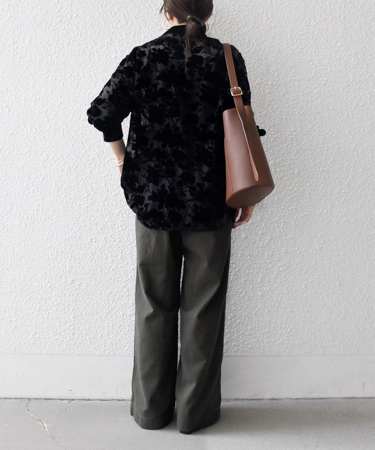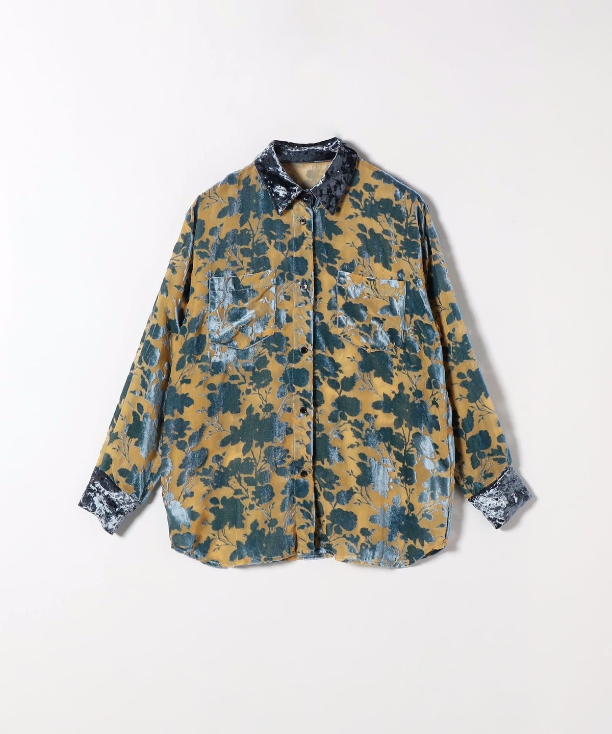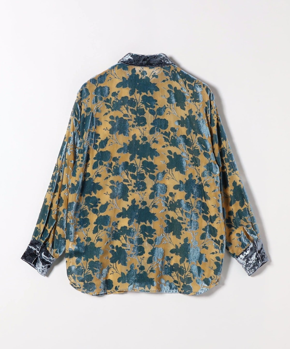 透け感のある生地に浮かぶフラワーモチーフが目を惹くシャツブラウス。