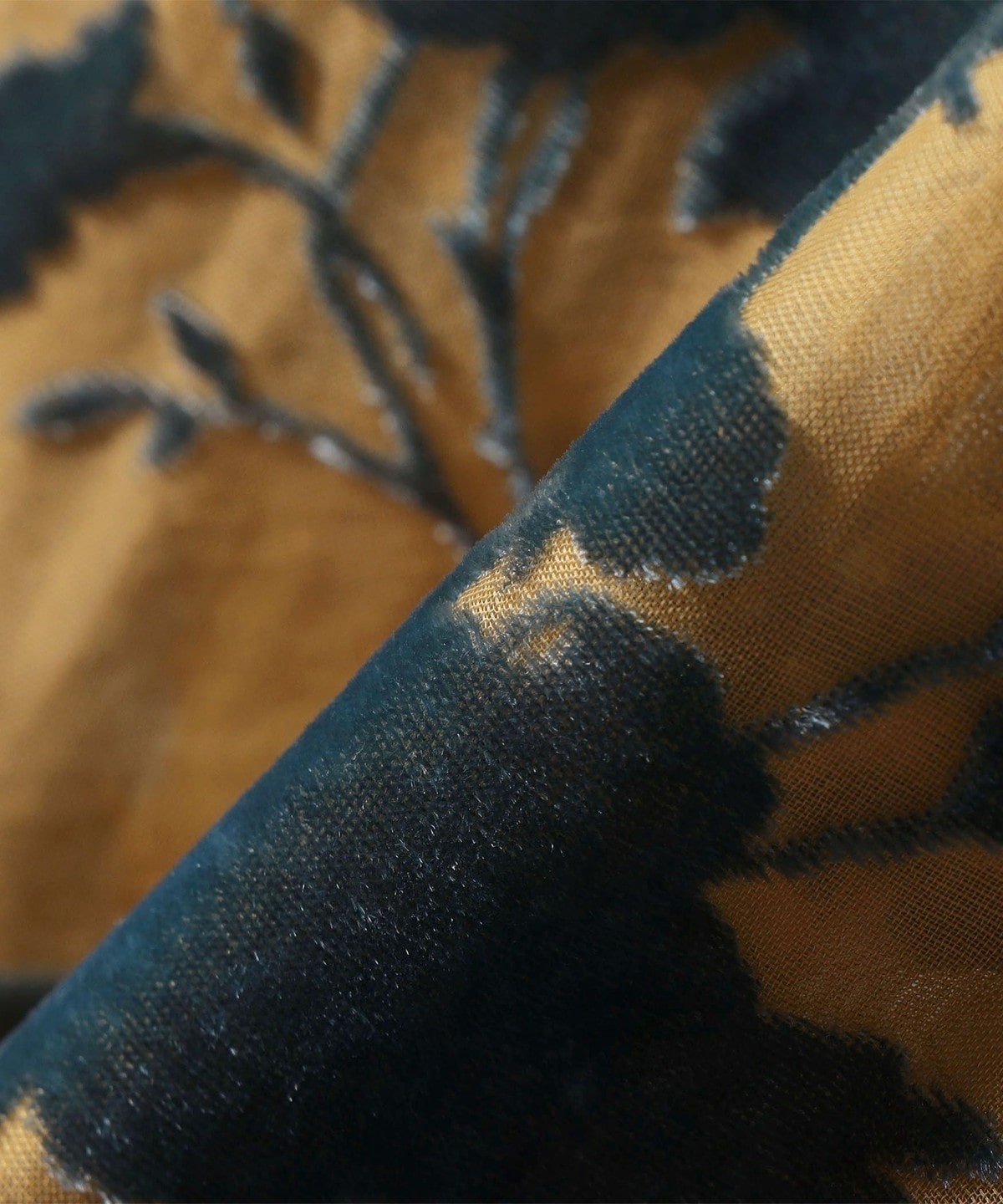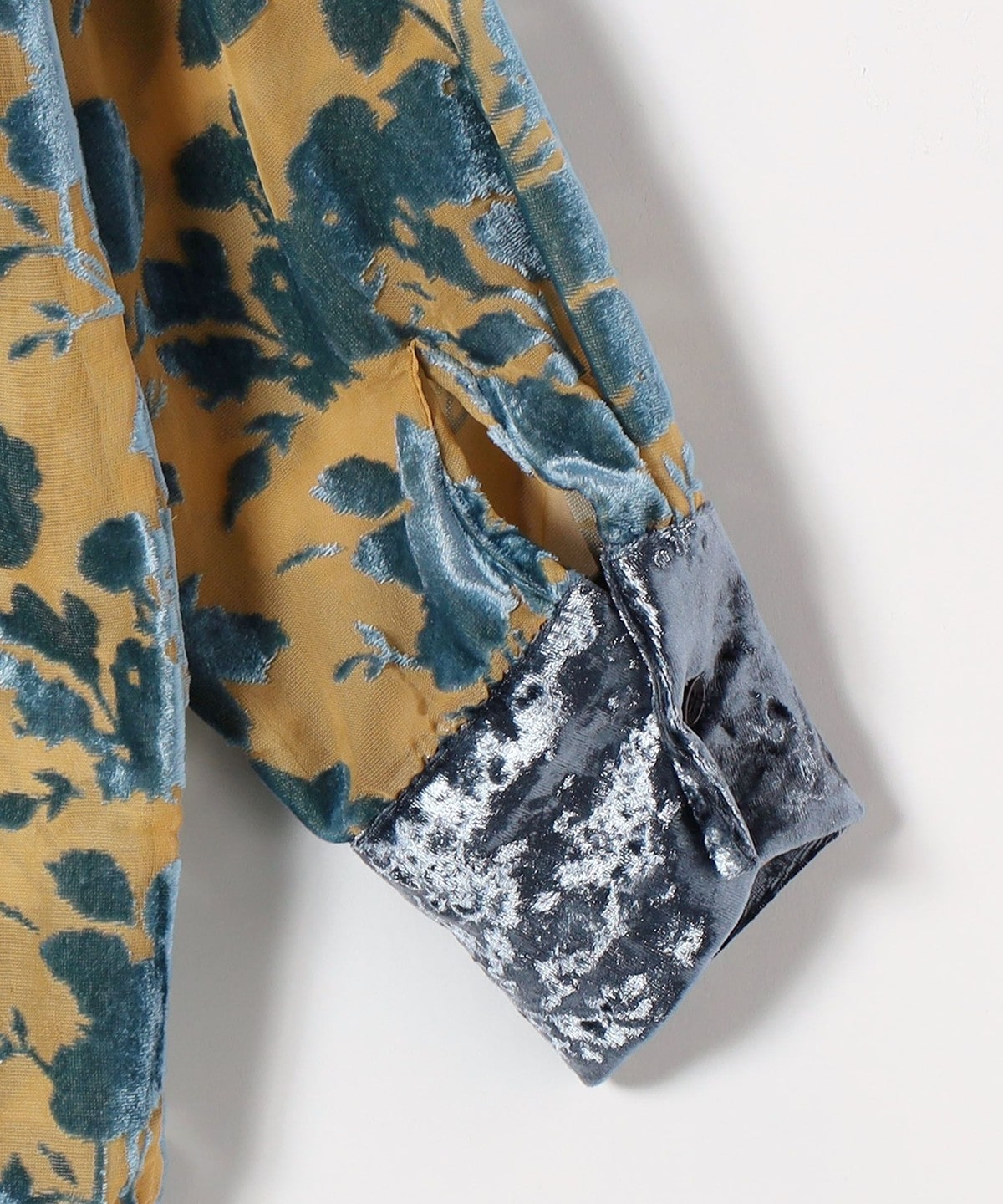 襟と袖口には無地のベロアをあしらい、シアー素材とのコントラストが華やかさを演出。