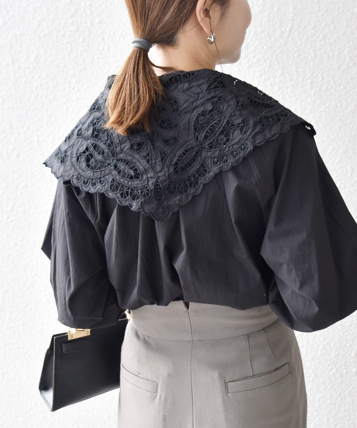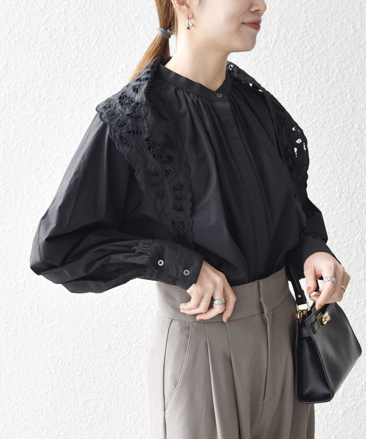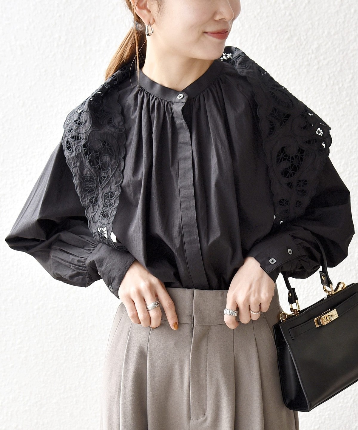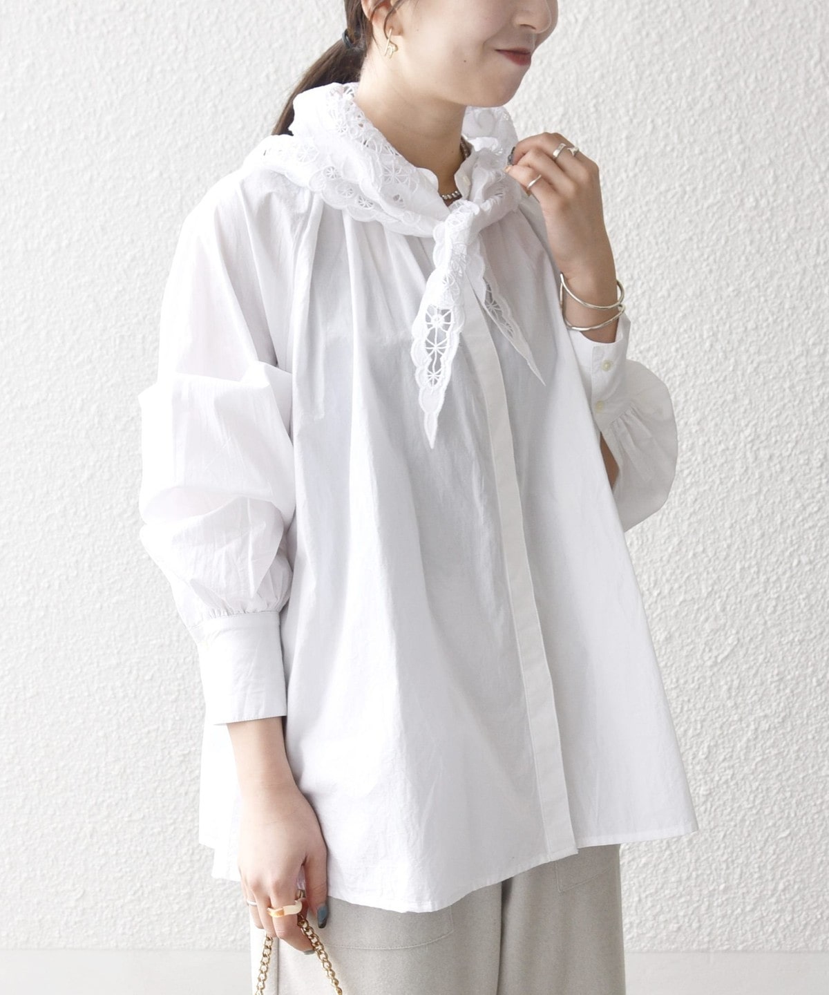 カットワーク刺繍のレーススカーフがセットになった、ボリュームスリーブのシャツブラウス。
