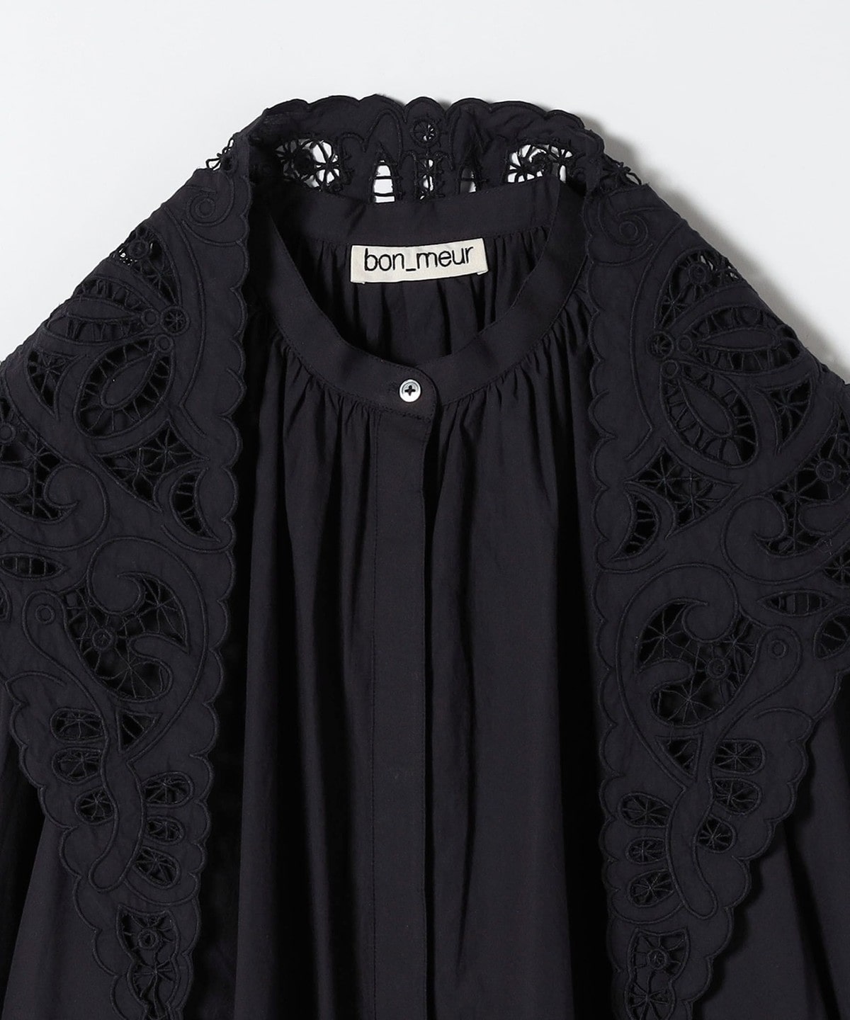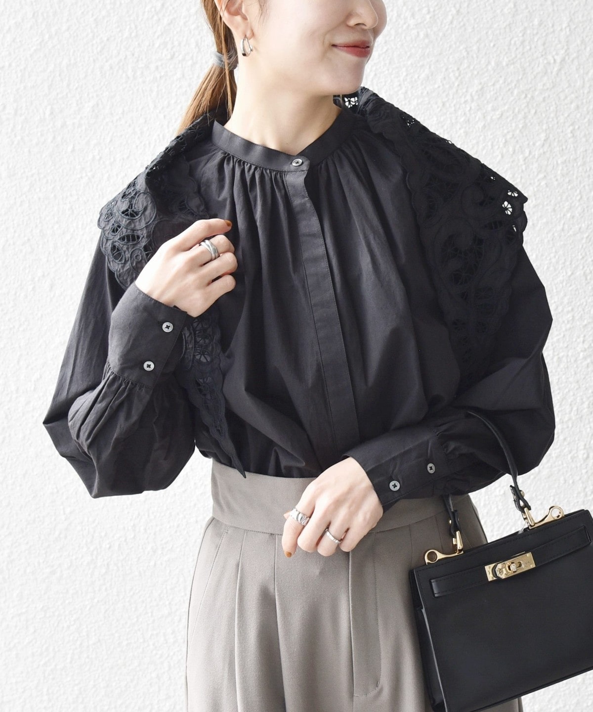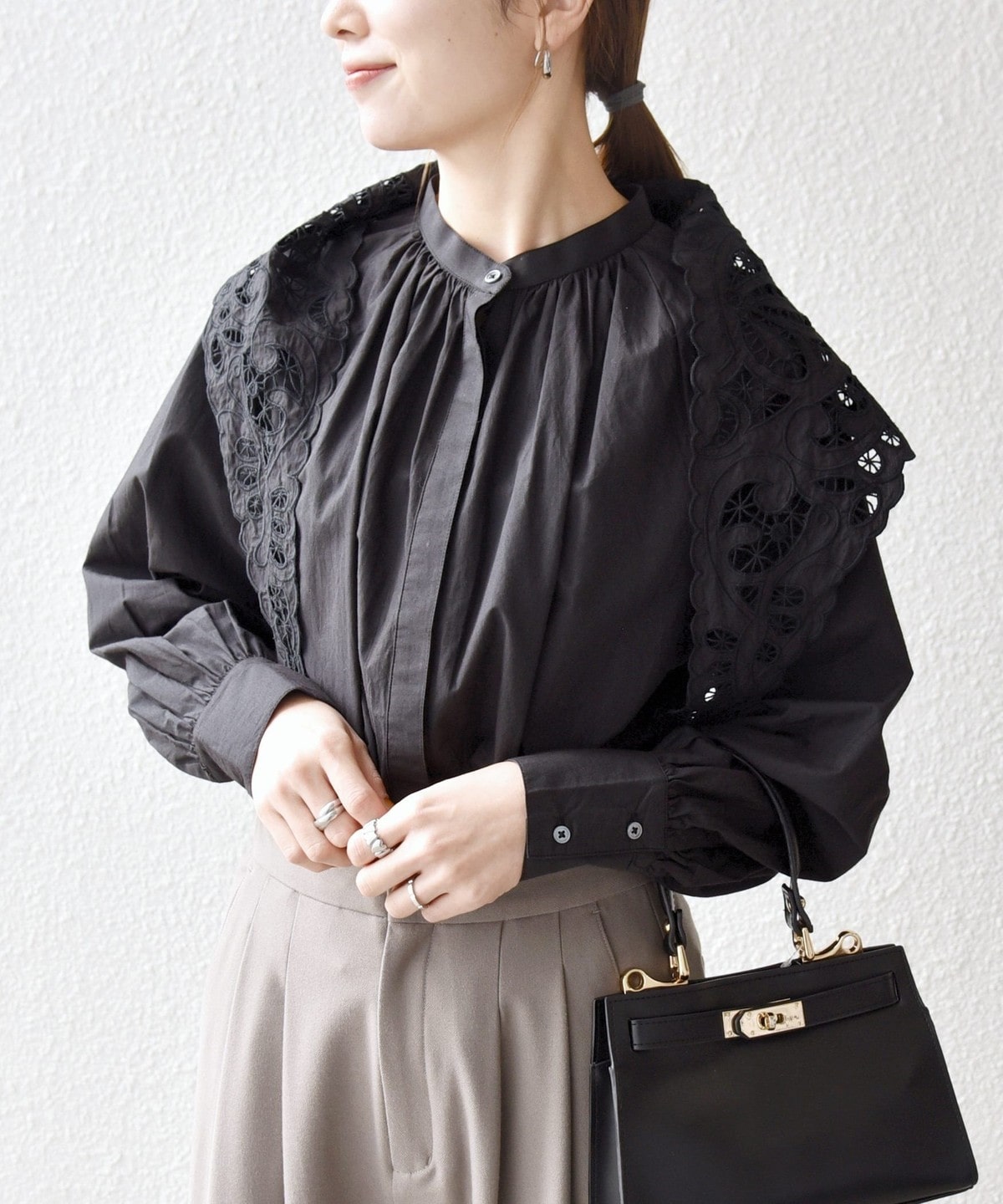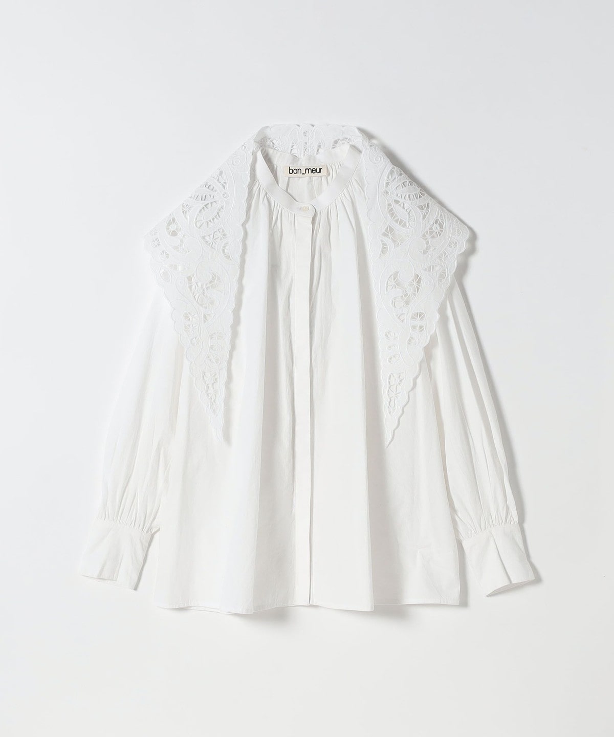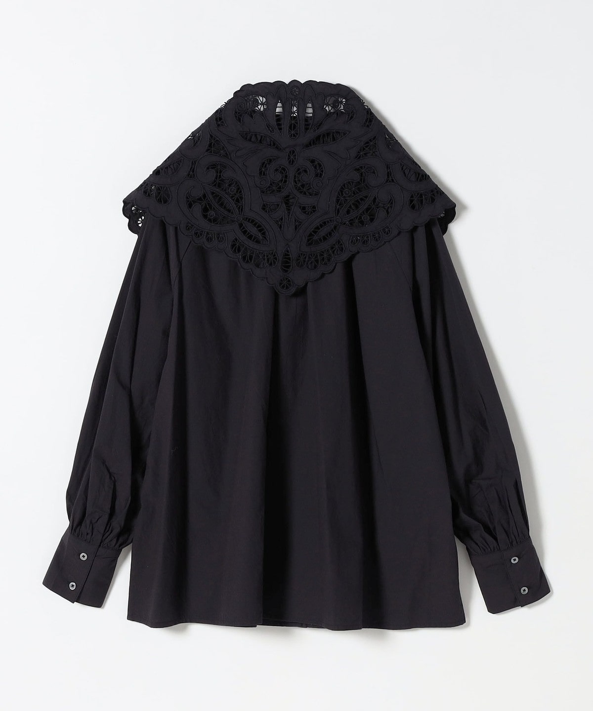 カットワーク刺繍のレーススカーフがセットになった、ボリュームスリーブのシャツブラウス。