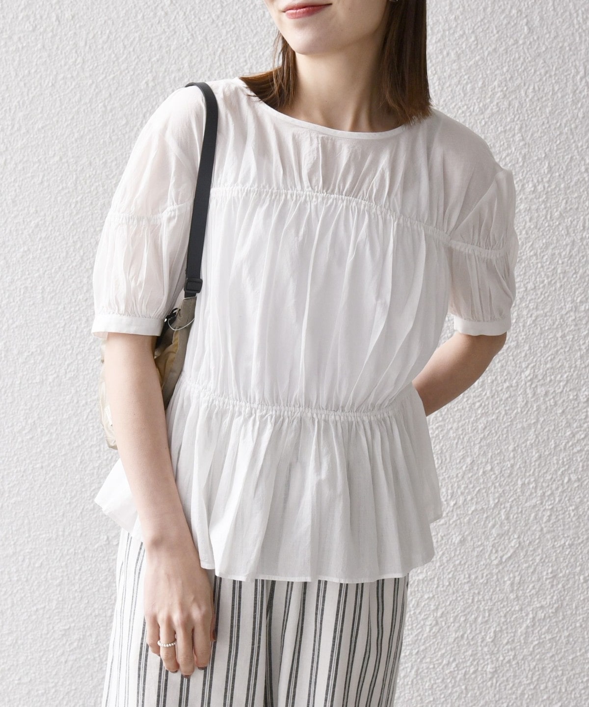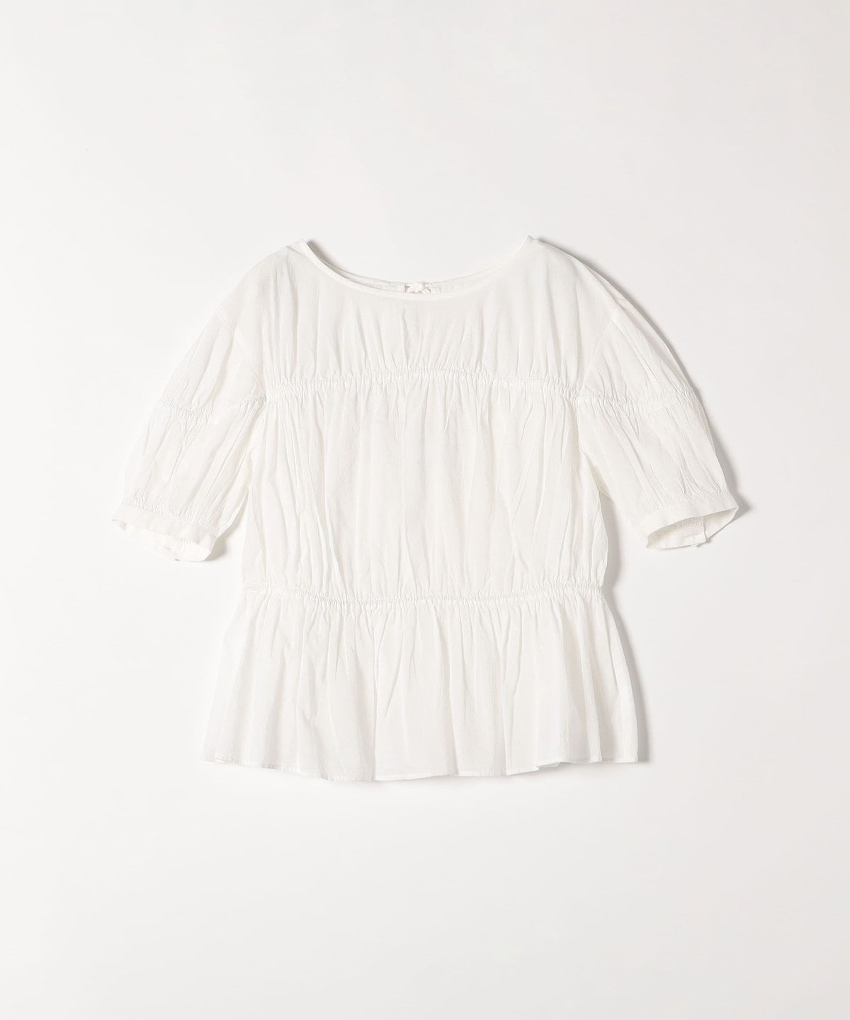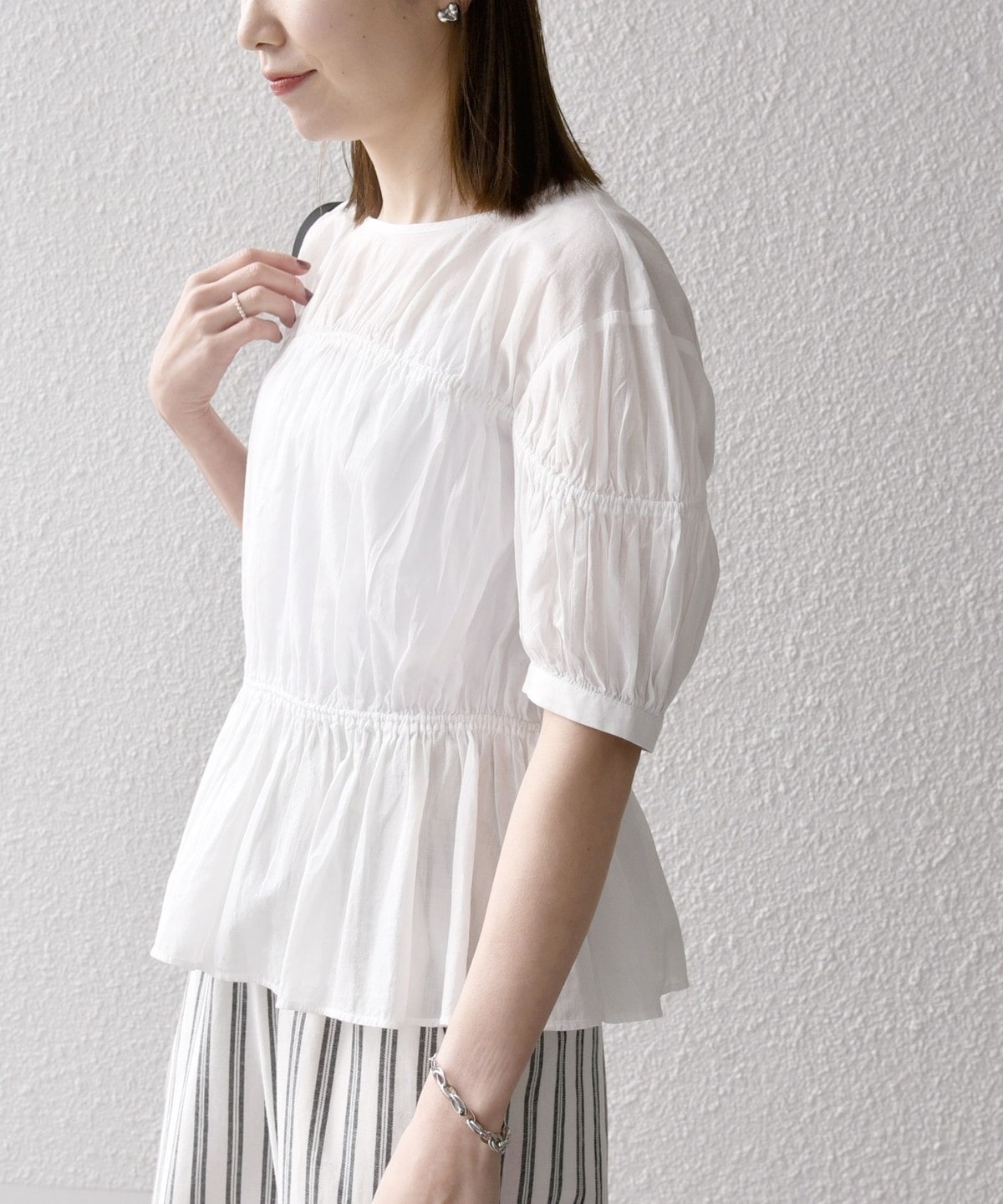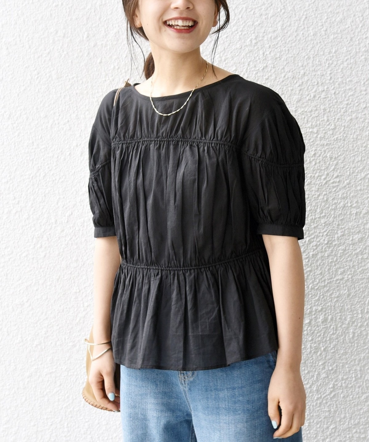 ギャザーたっぷりのパフスリーブブラウス。