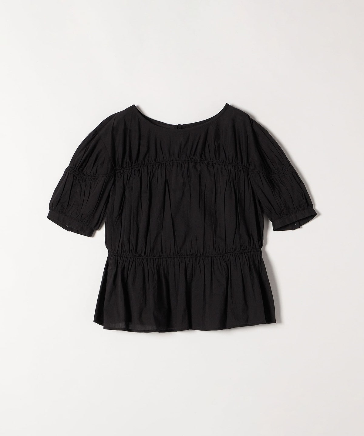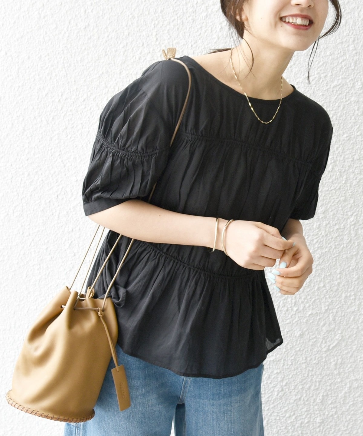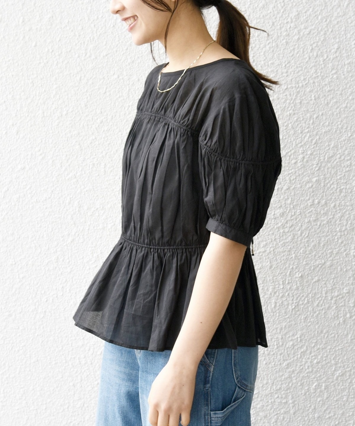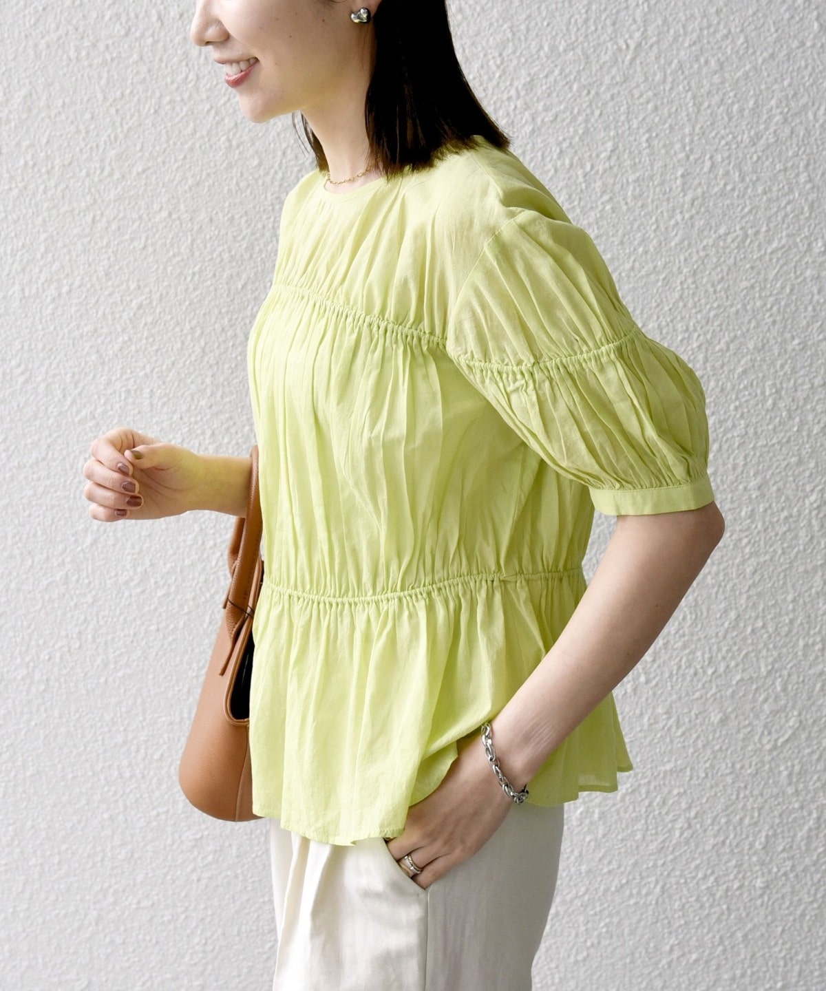 ギャザーたっぷりのパフスリーブブラウス。