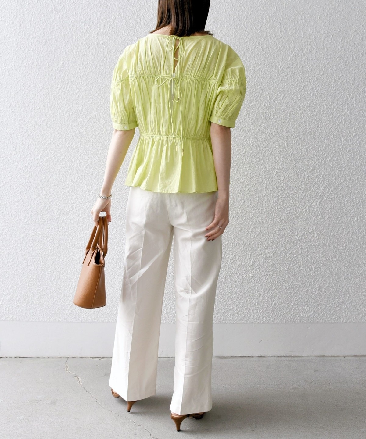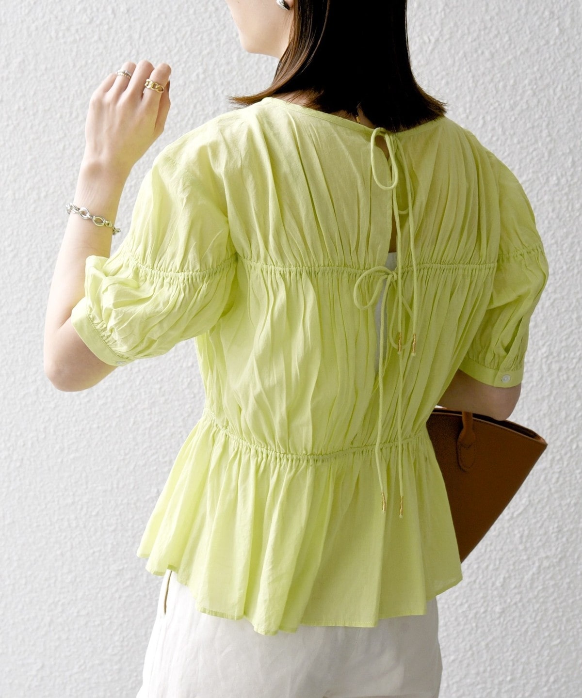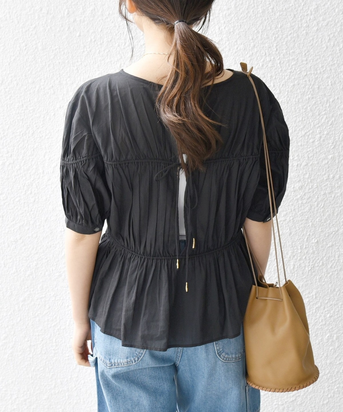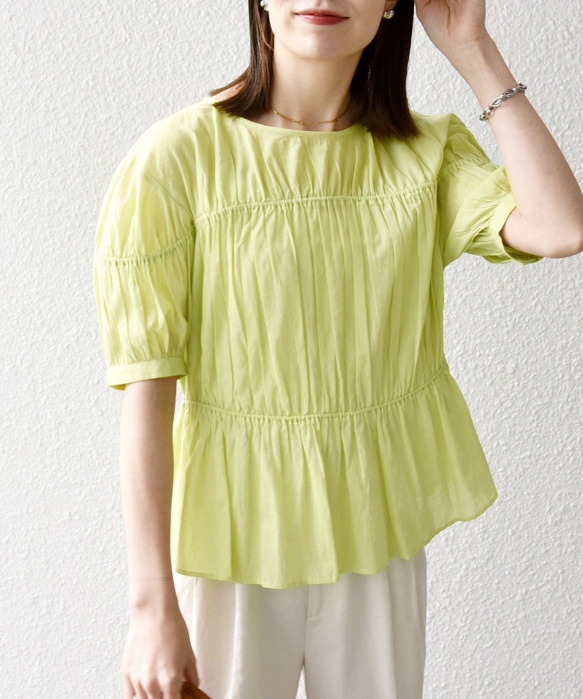 ギャザーたっぷりのパフスリーブブラウス。