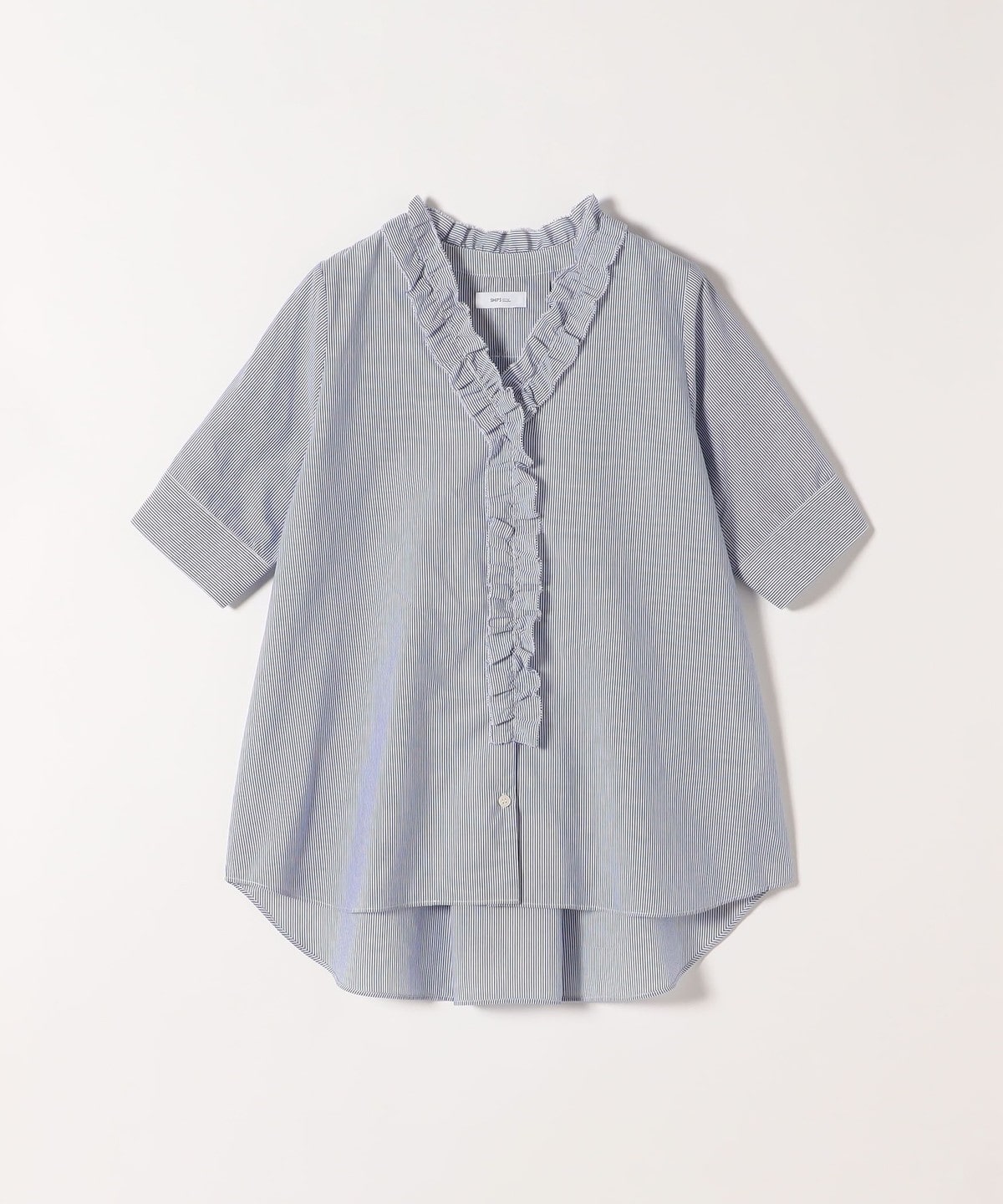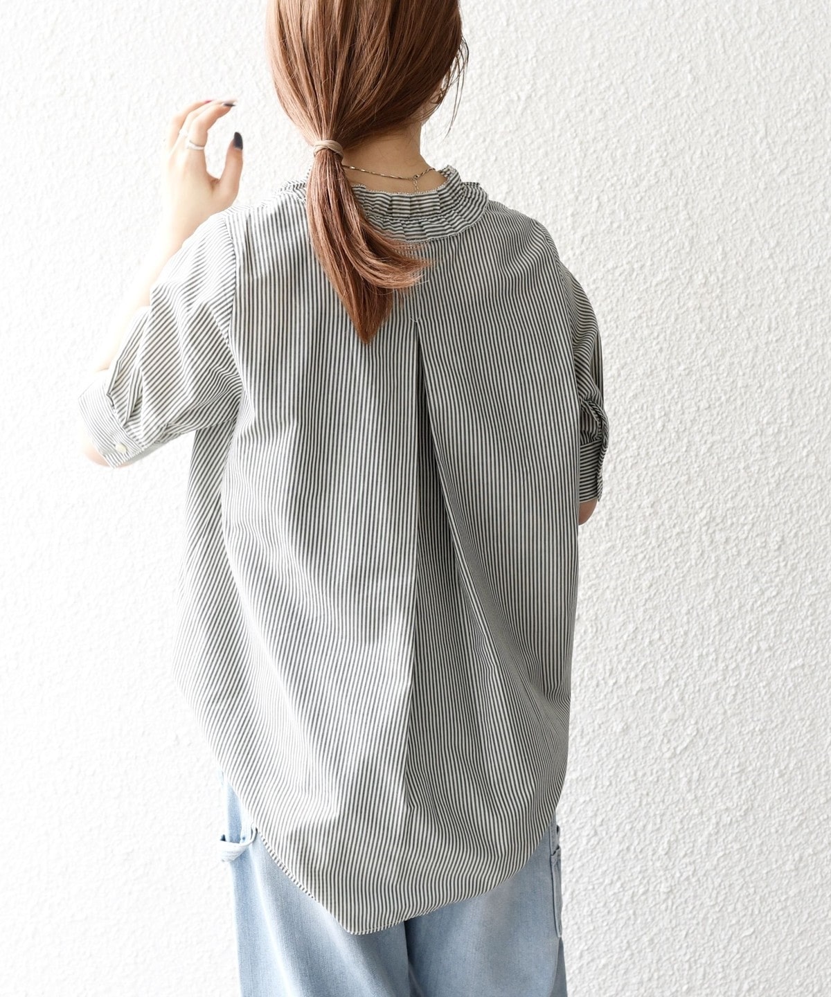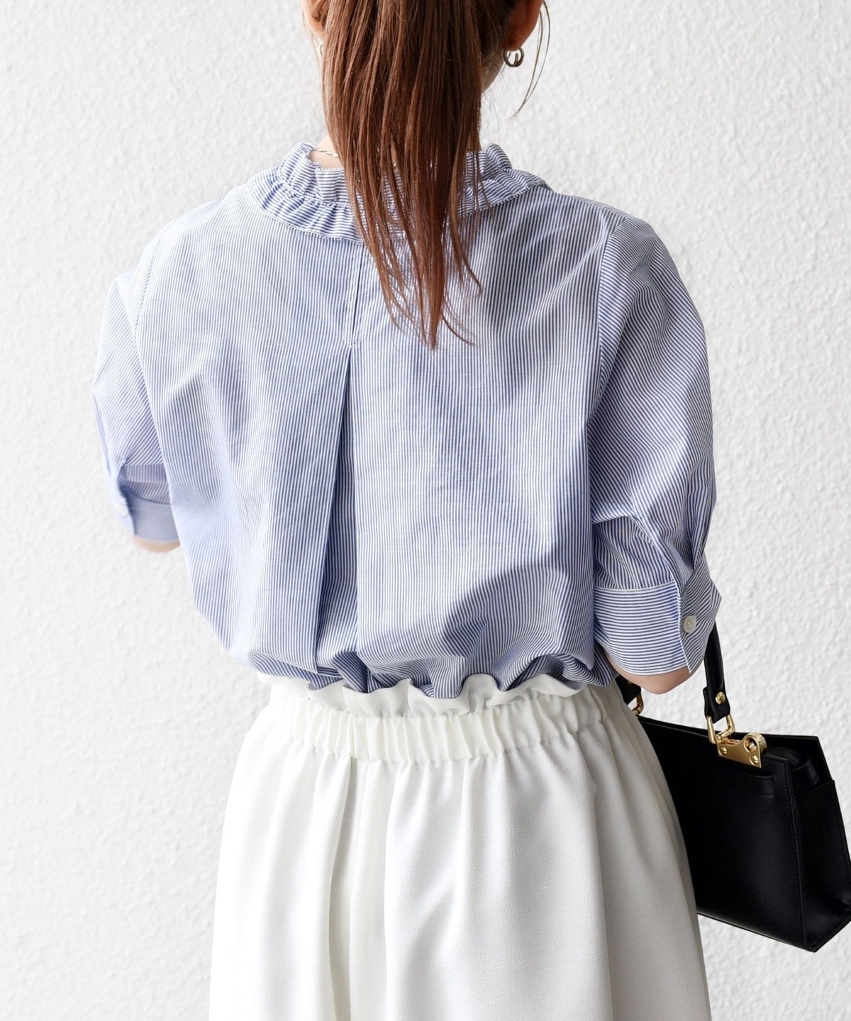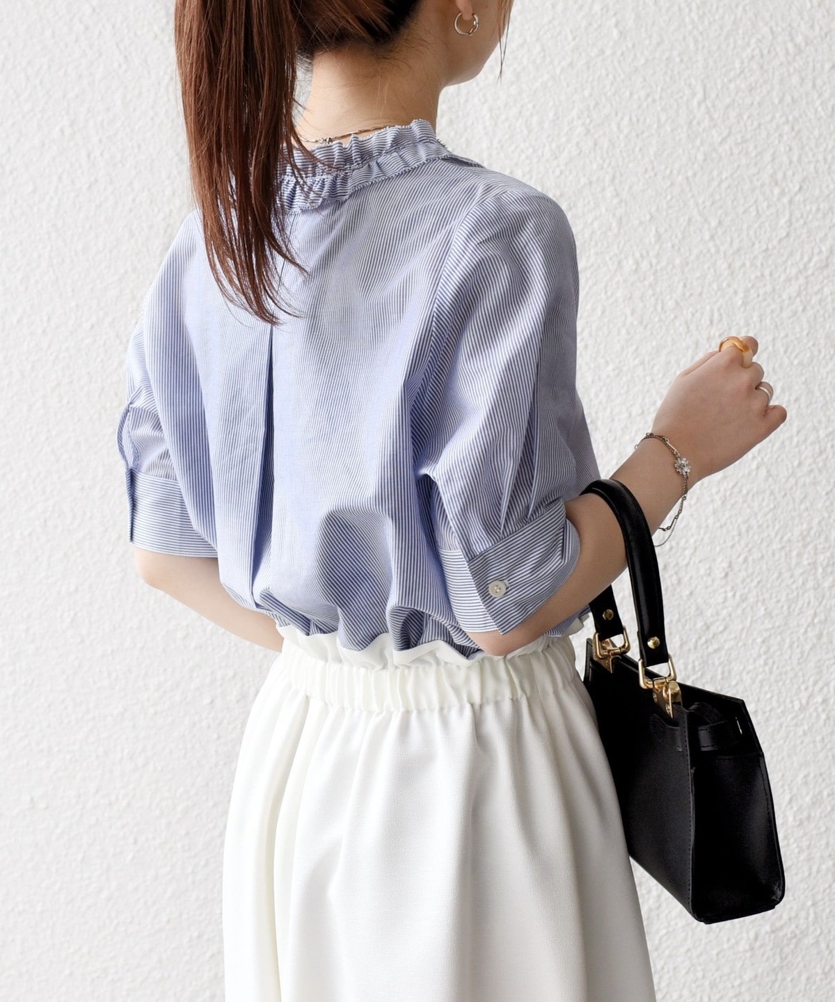 SHIPS any:〈手洗い可能〉シアー フリル バンドカラー パフ シャツ ブラウス