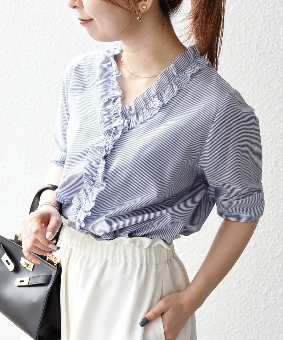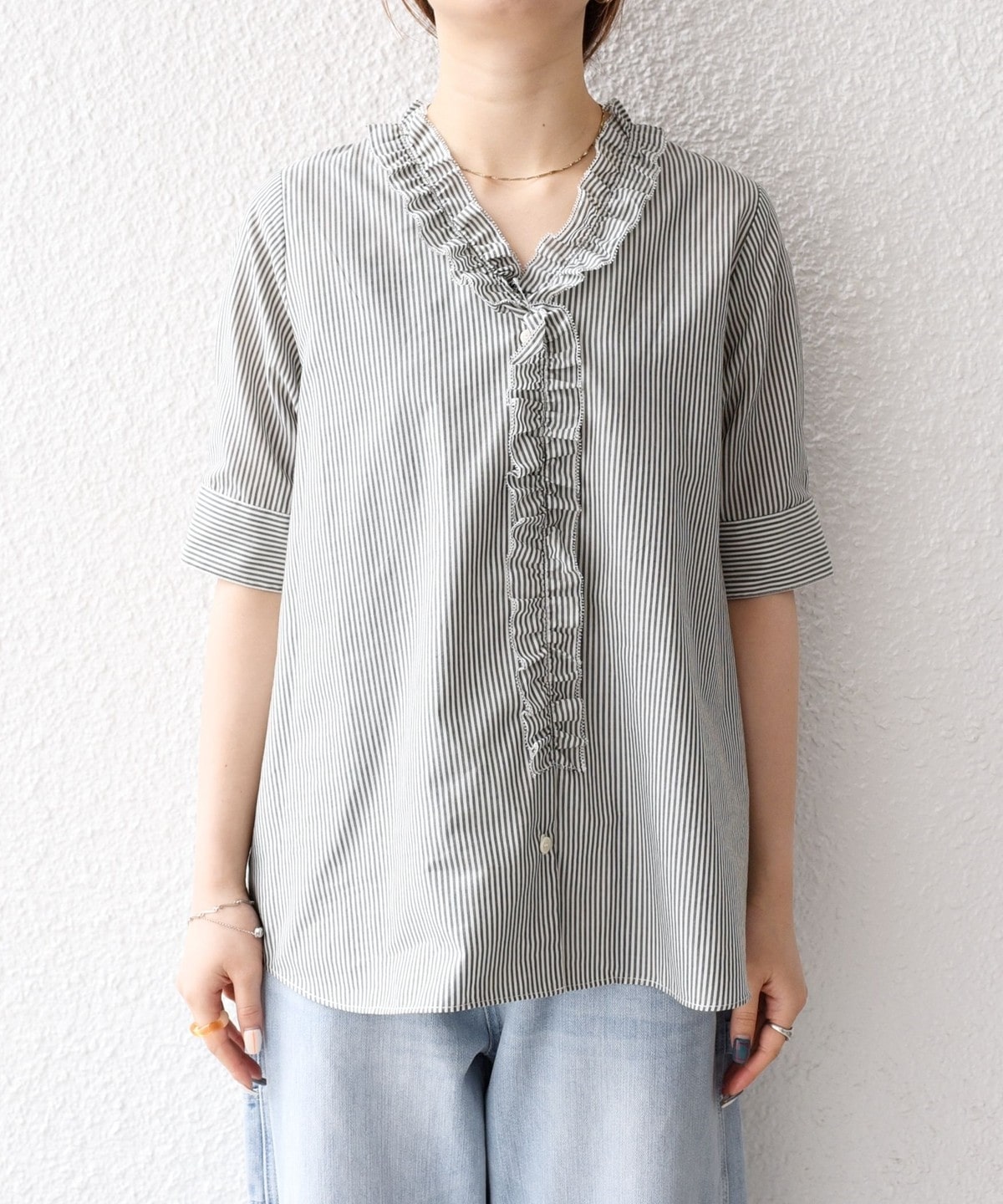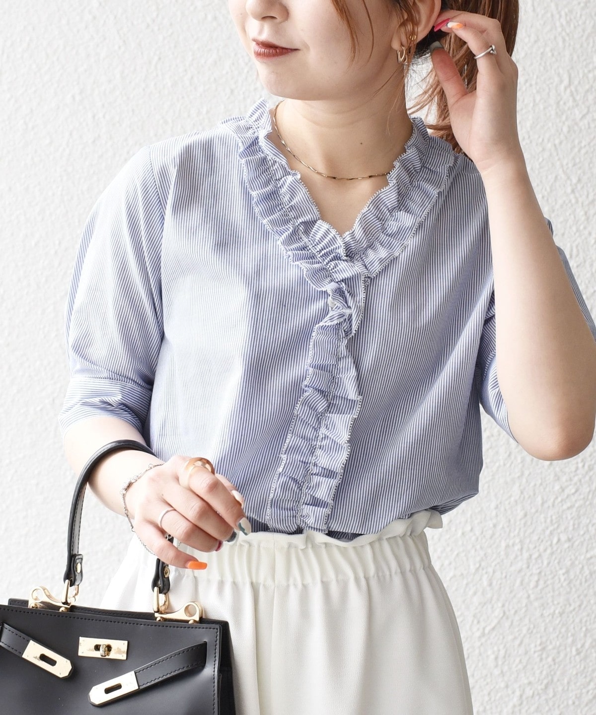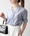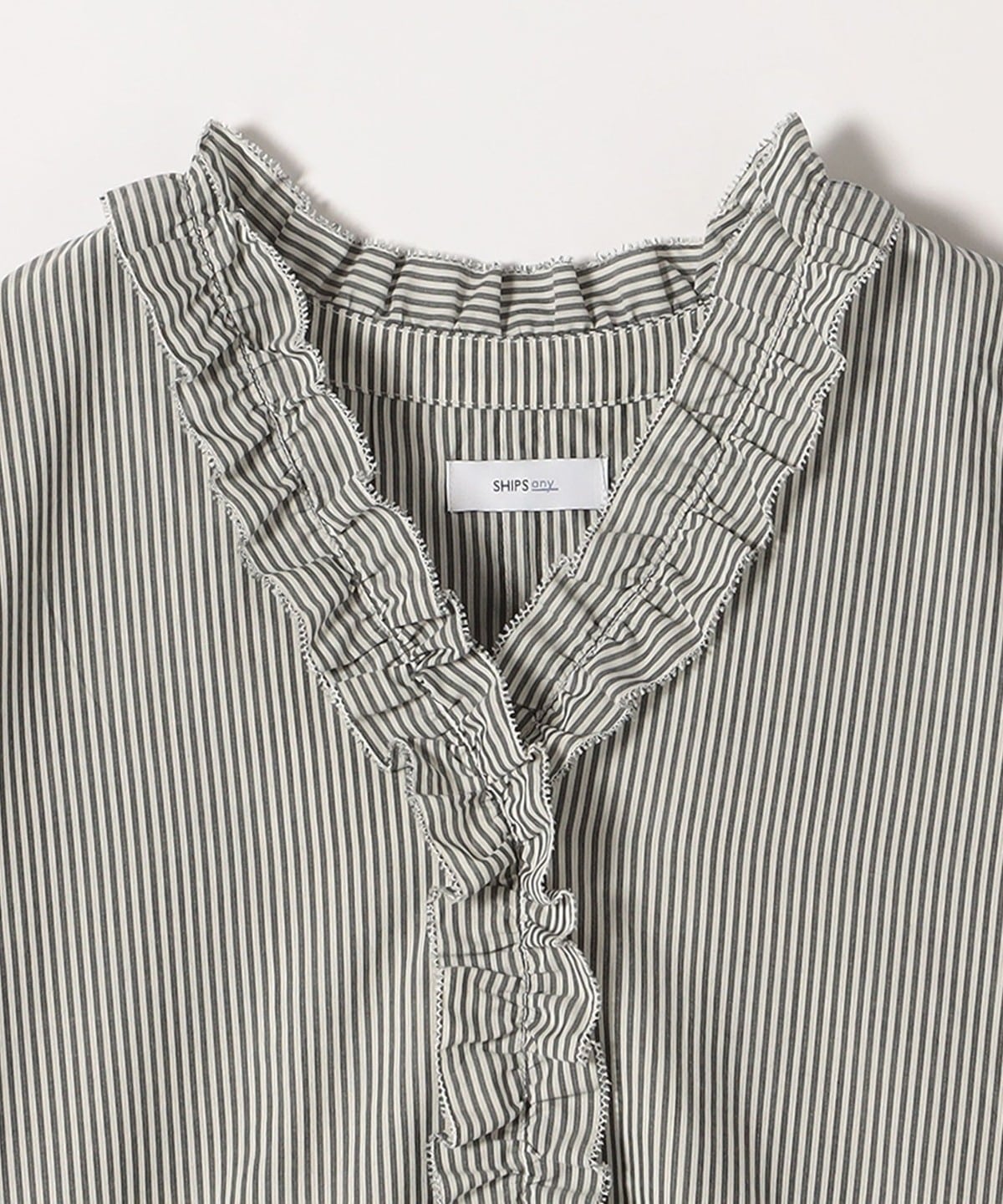 《追加予約》SHIPS any:〈手洗い可能〉ストライプ フリル Vネック シャツ ブラウス