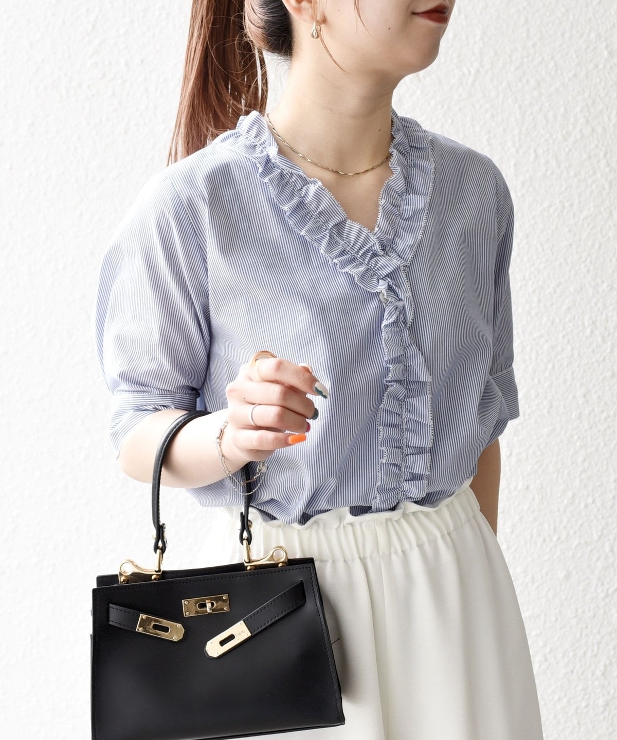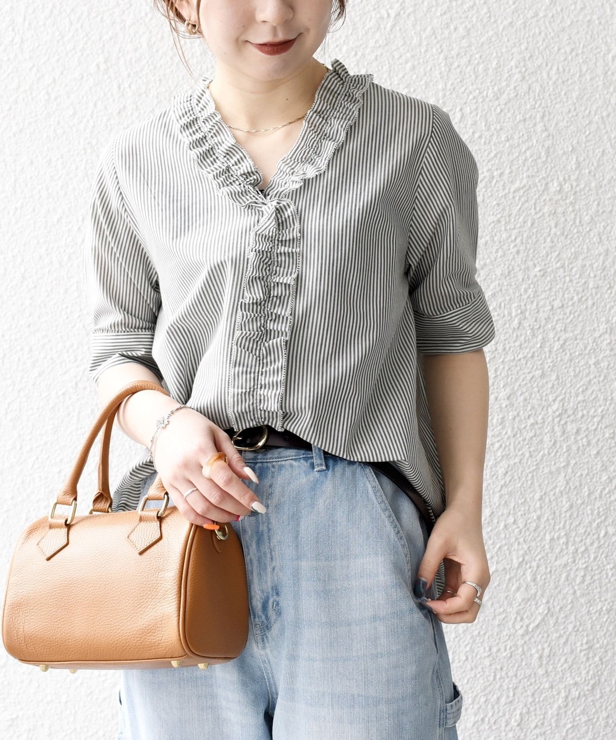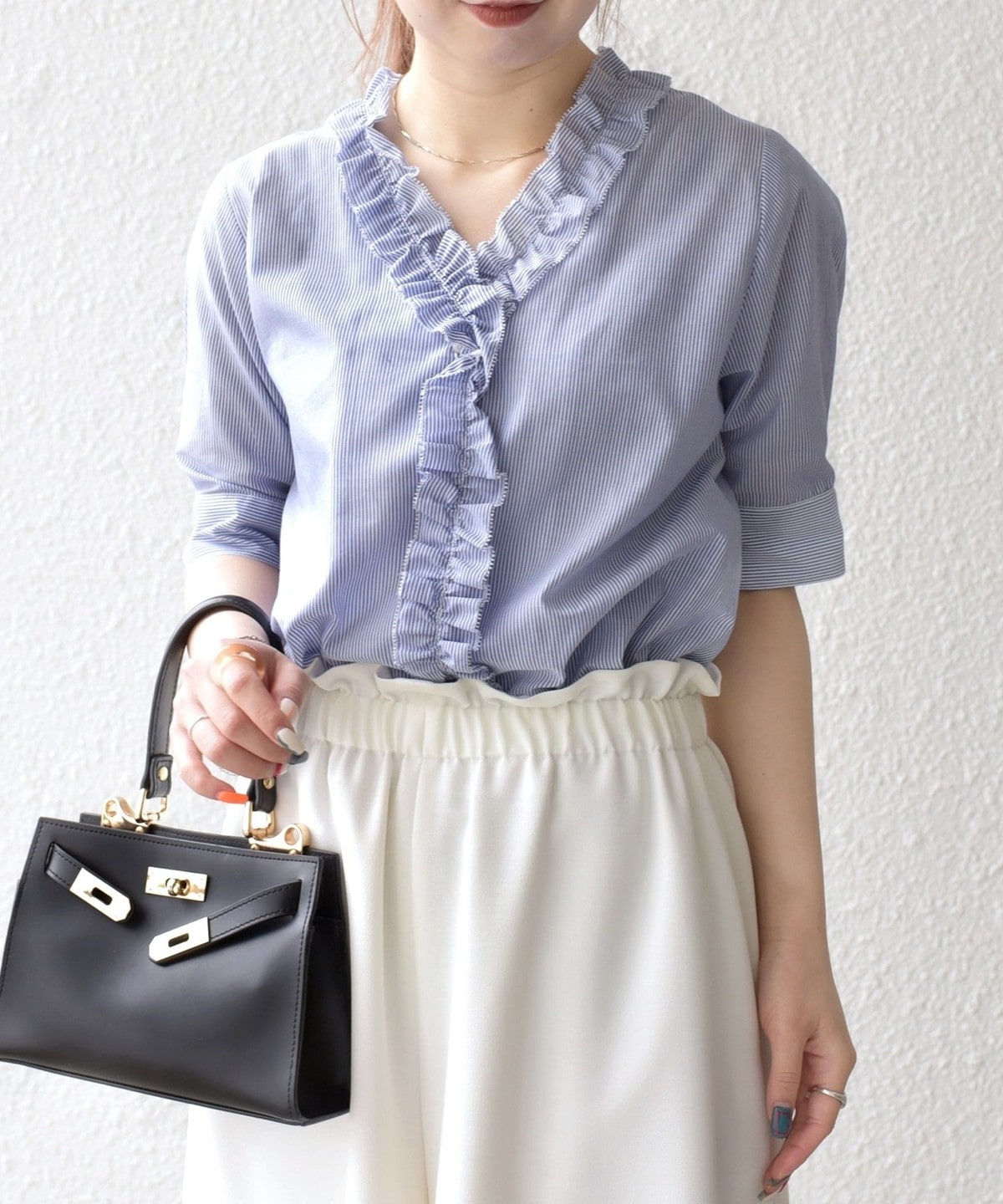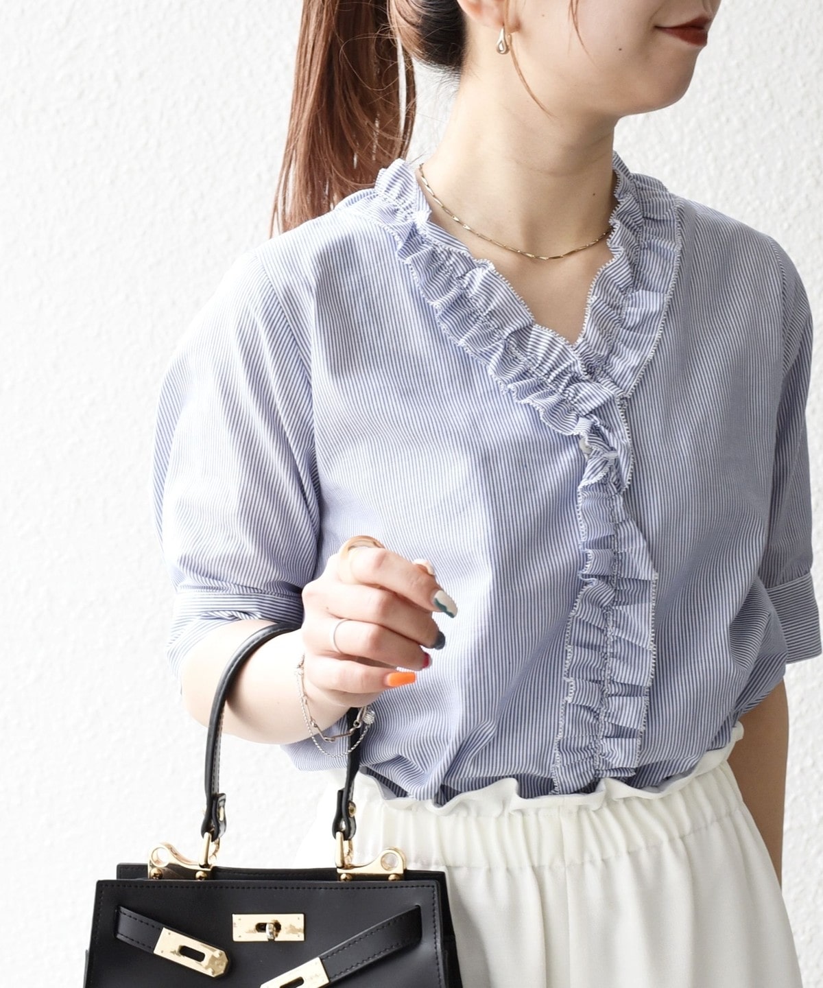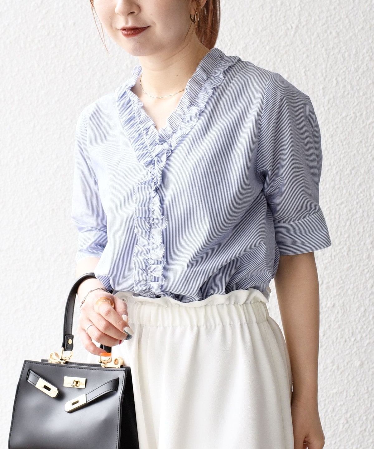 《追加予約》SHIPS any:〈手洗い可能〉ストライプ フリル Vネック シャツ ブラウス