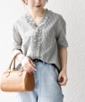 SHIPS any:〈洗濯機可能〉ハンドスモッキング コットン フリル スタンドカラー ブラウス