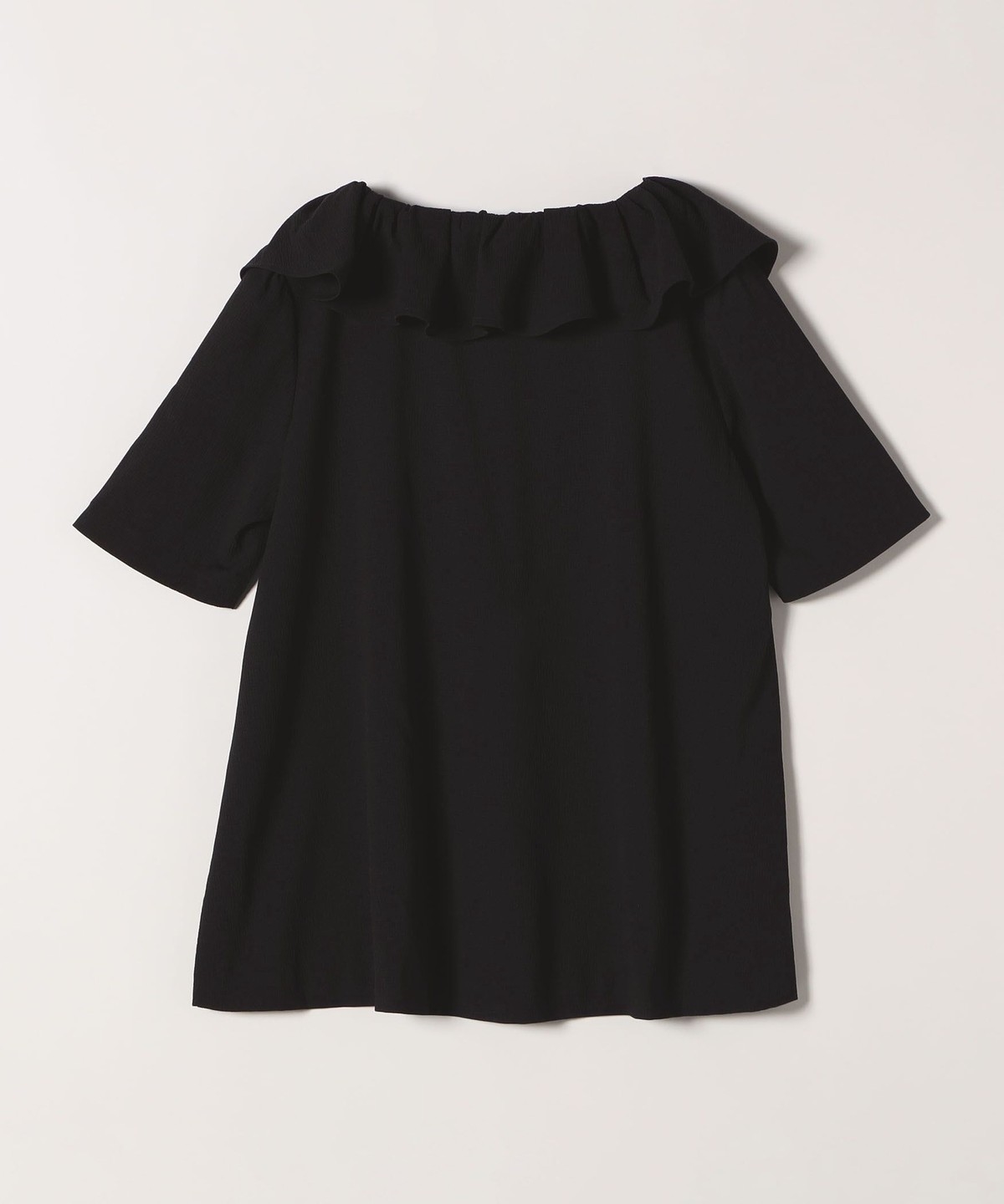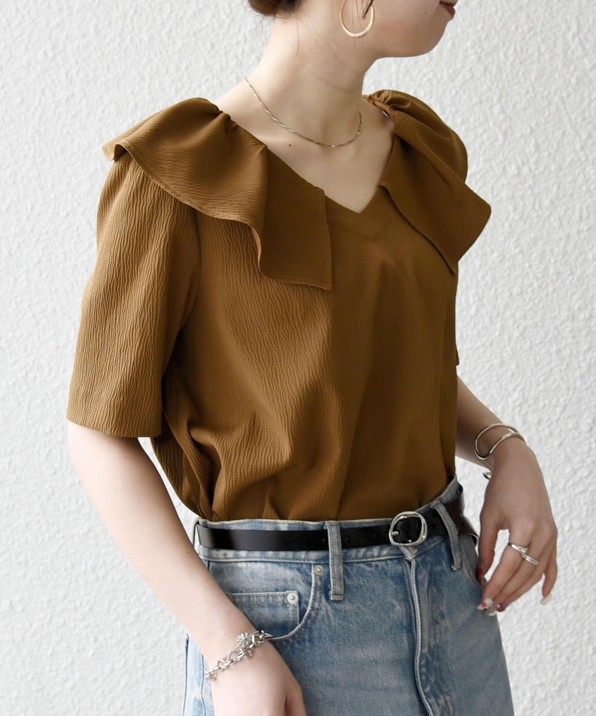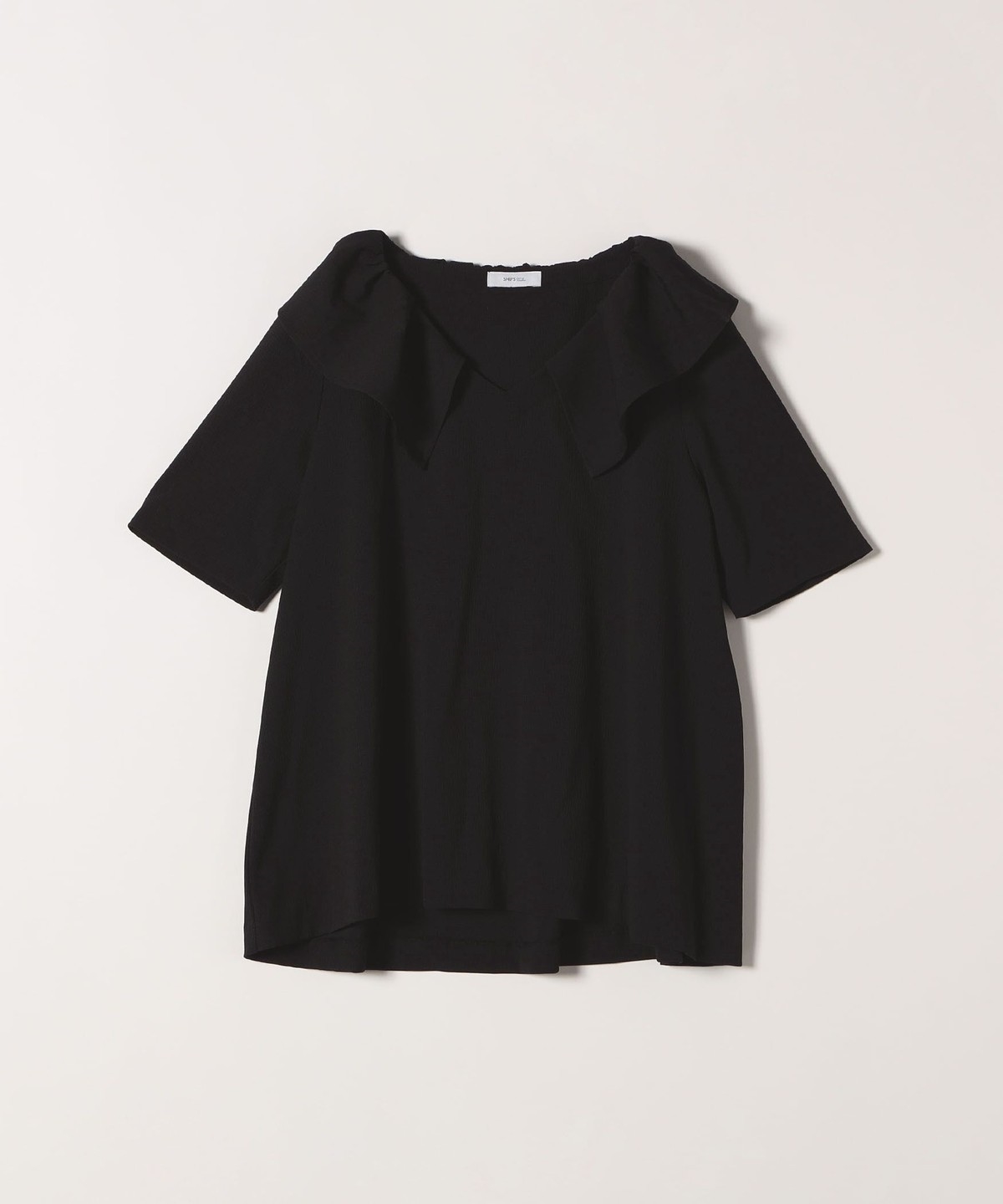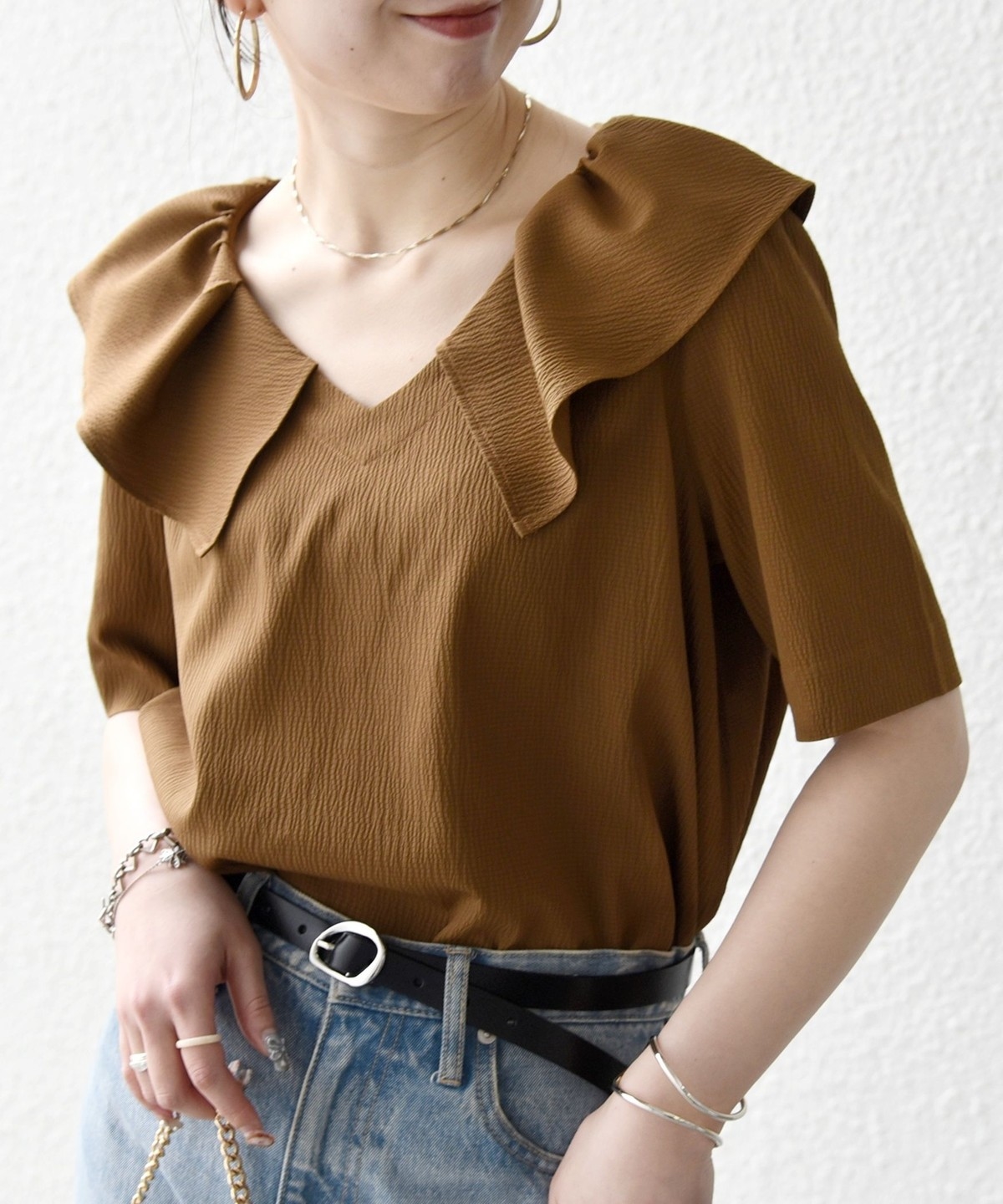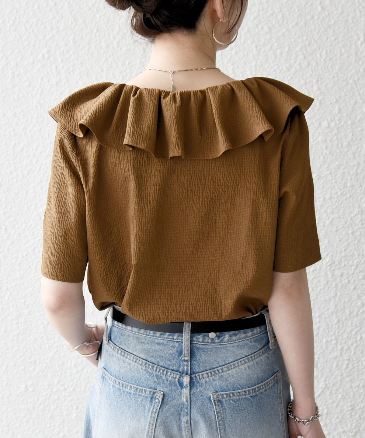 襟に花びらのようなフリルカラーを施したブラウス。
