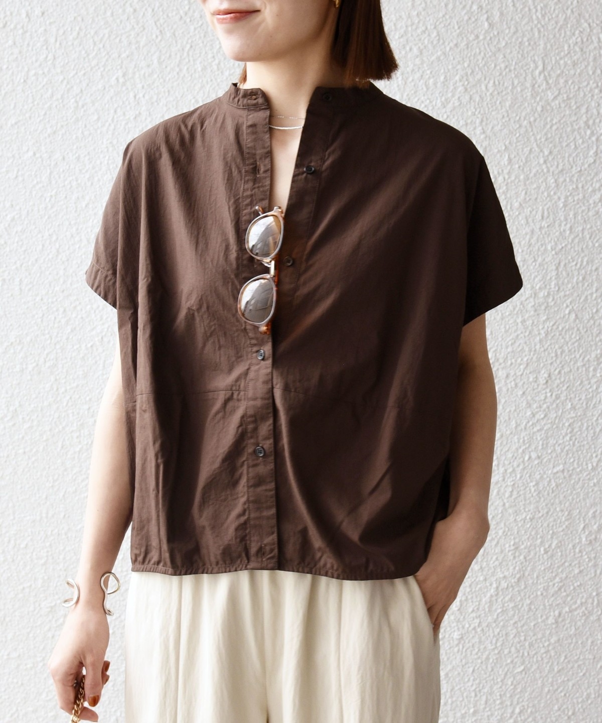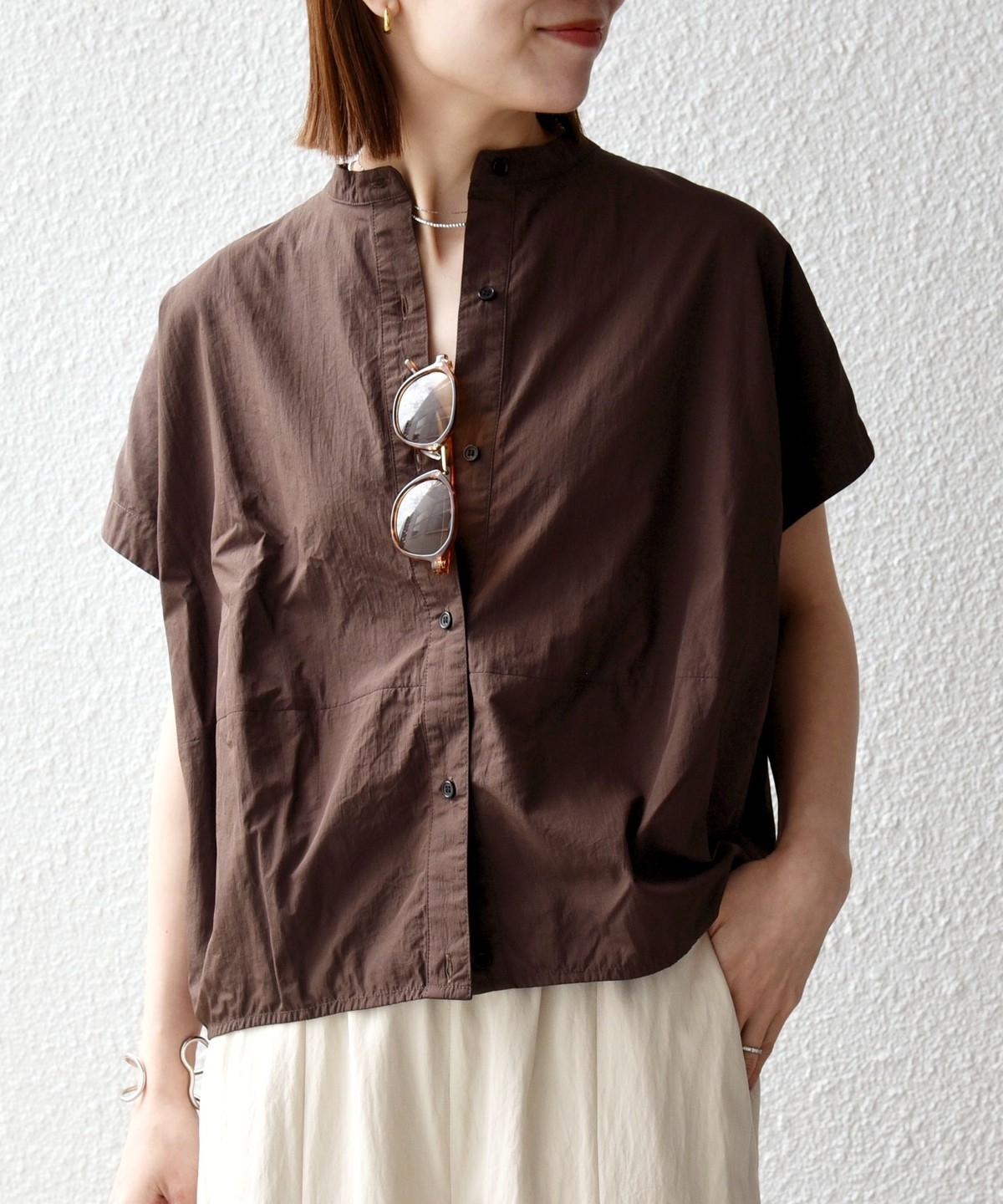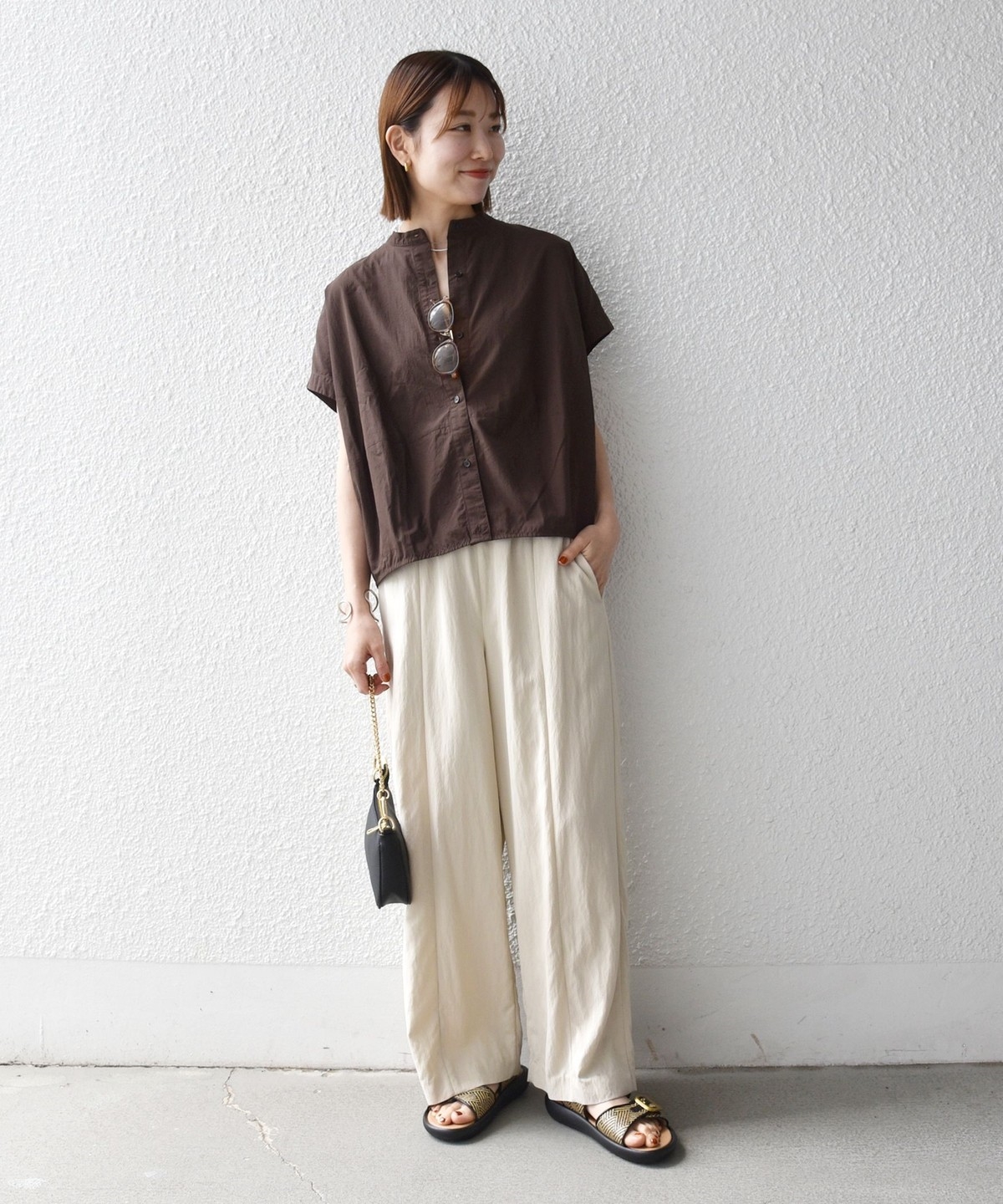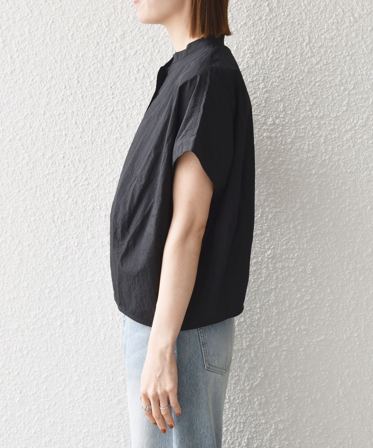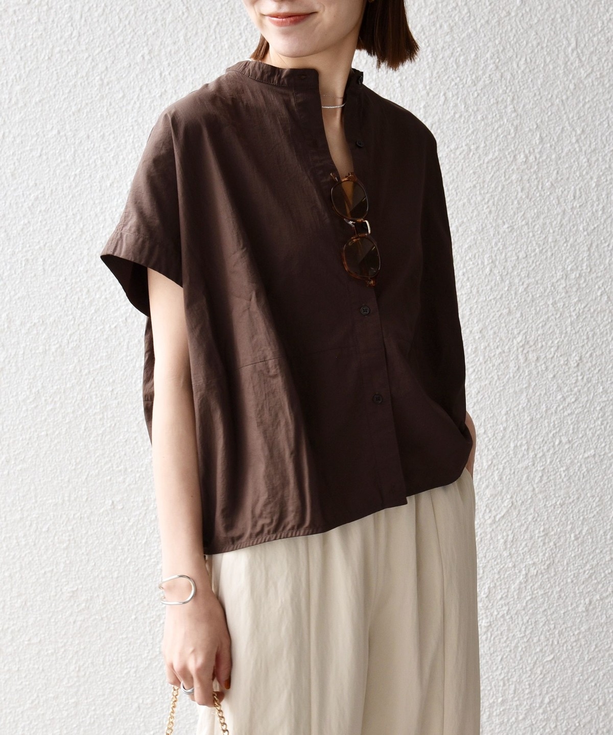 スタンドカラーできちんと感がありながら、フレンチスリーブで程よく肩をカバーして抜け感のある印象に。
