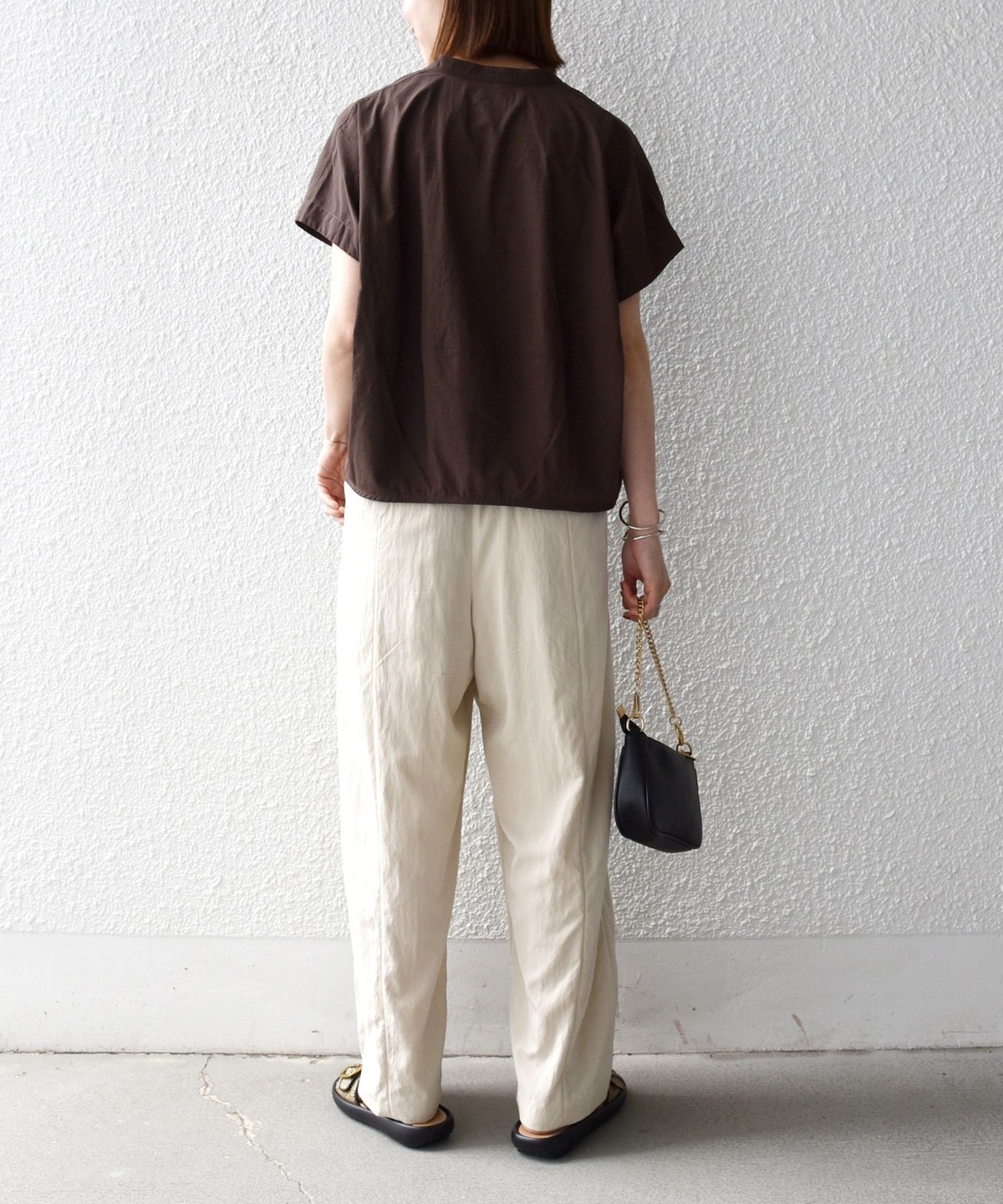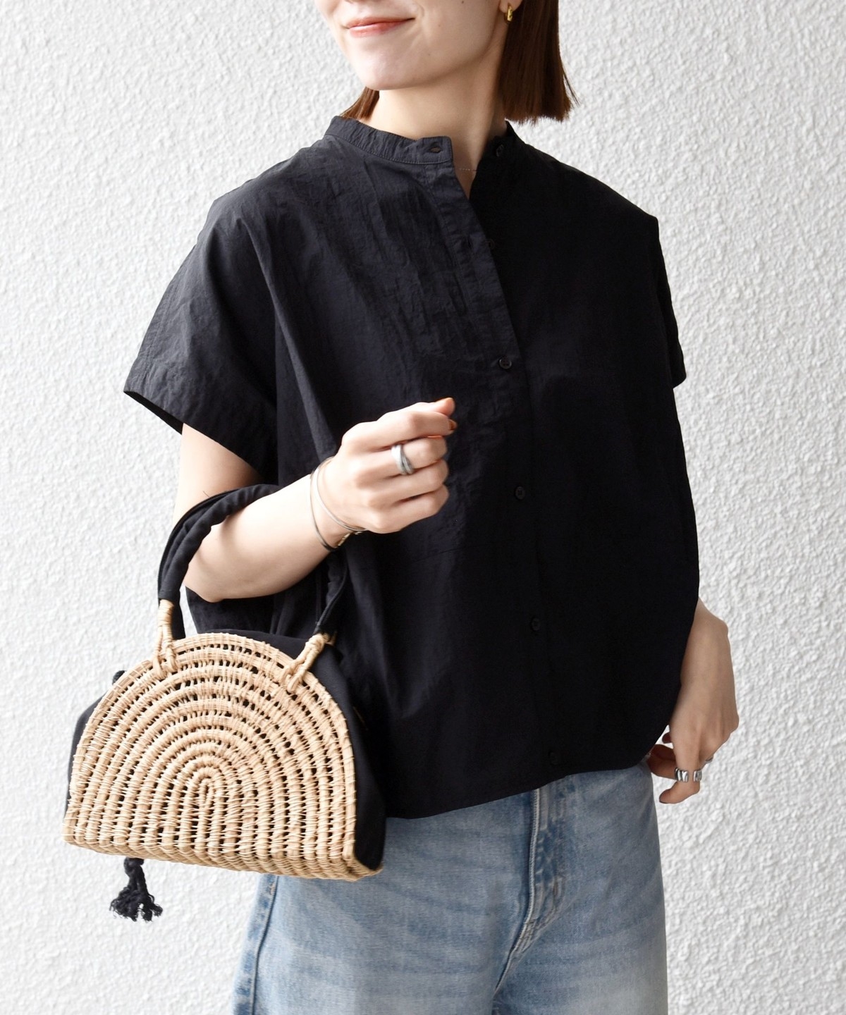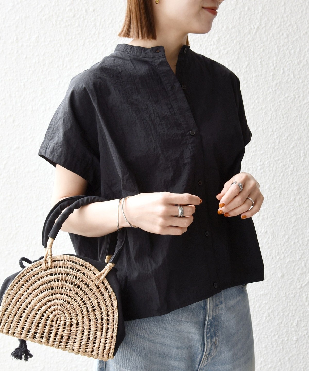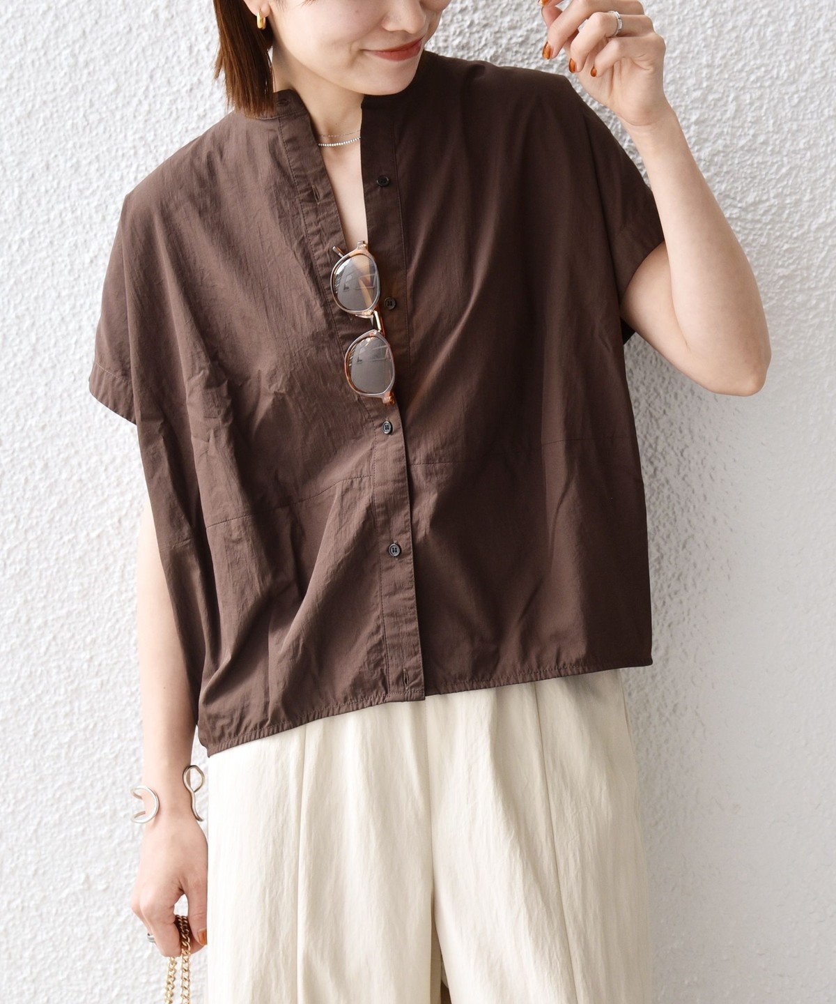 スタンドカラーできちんと感がありながら、フレンチスリーブで程よく肩をカバーして抜け感のある印象に。