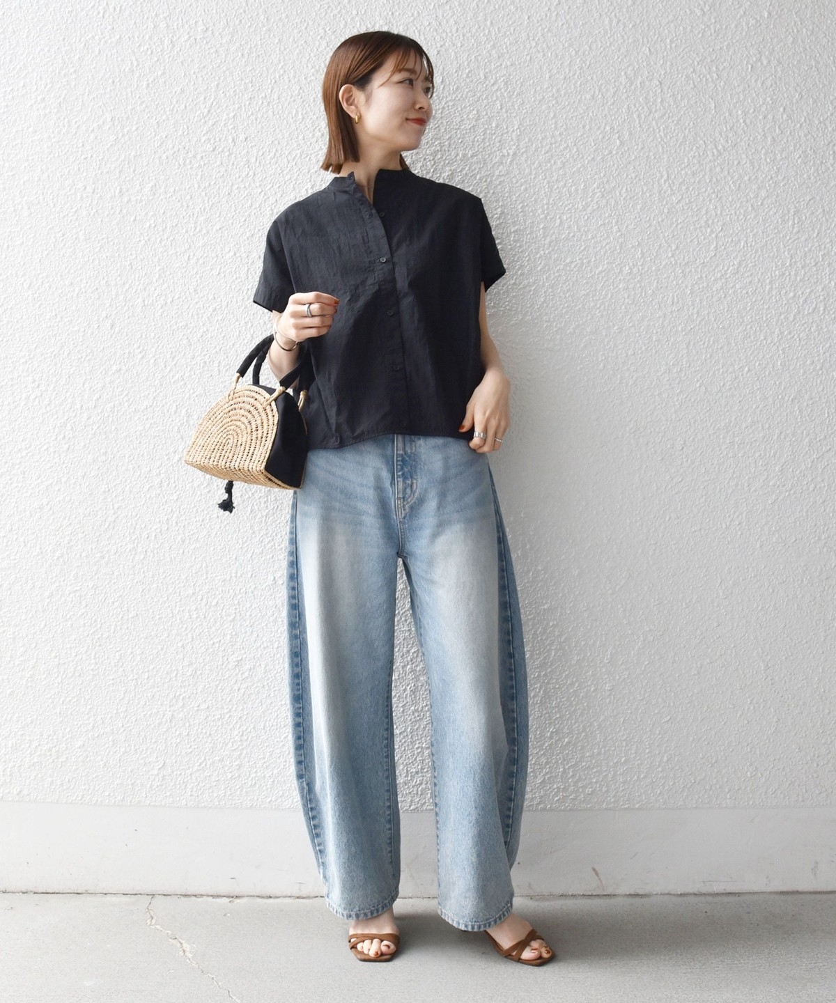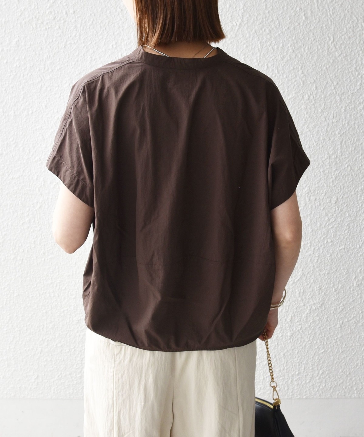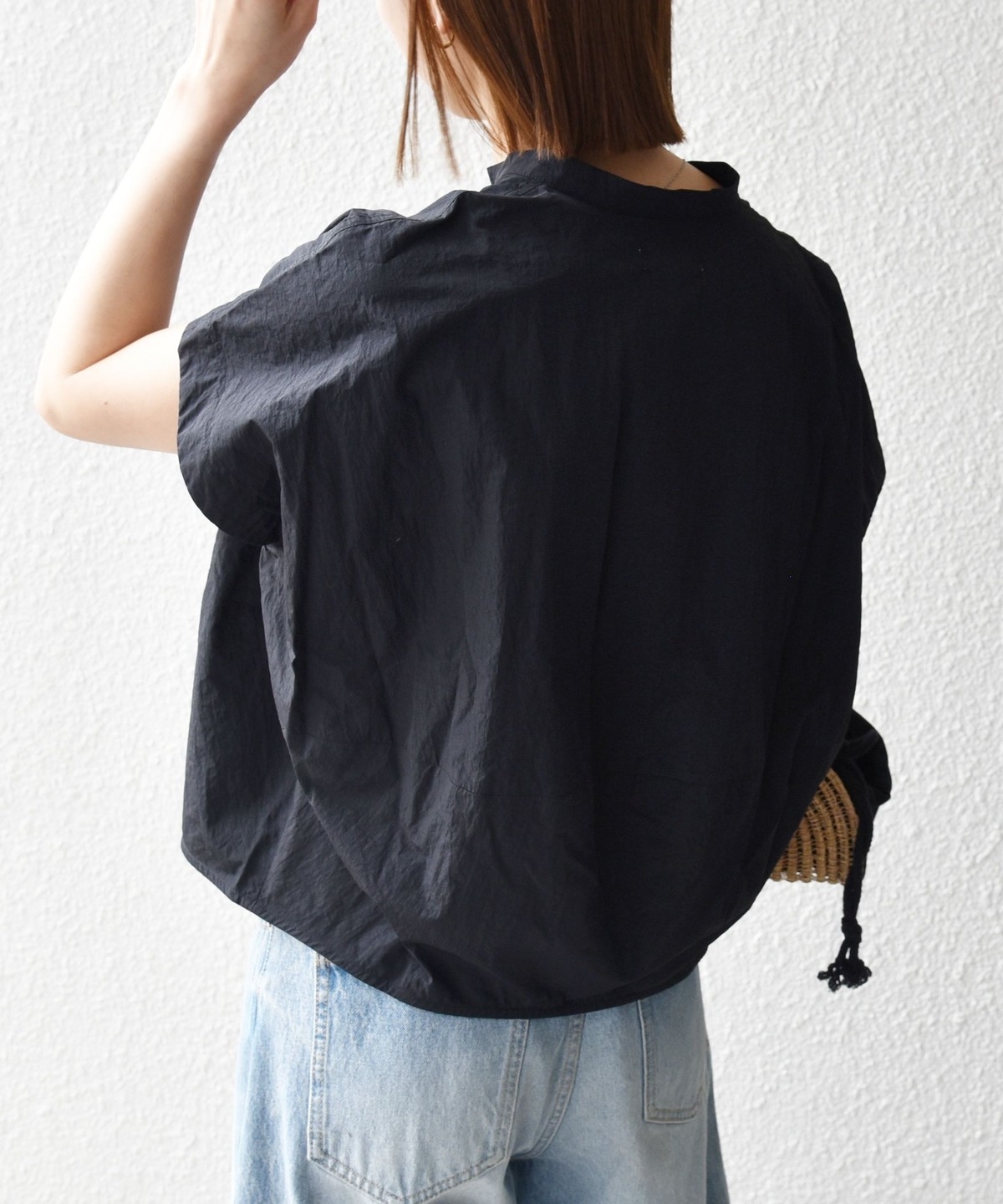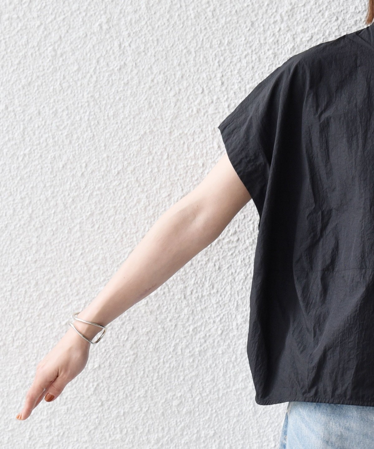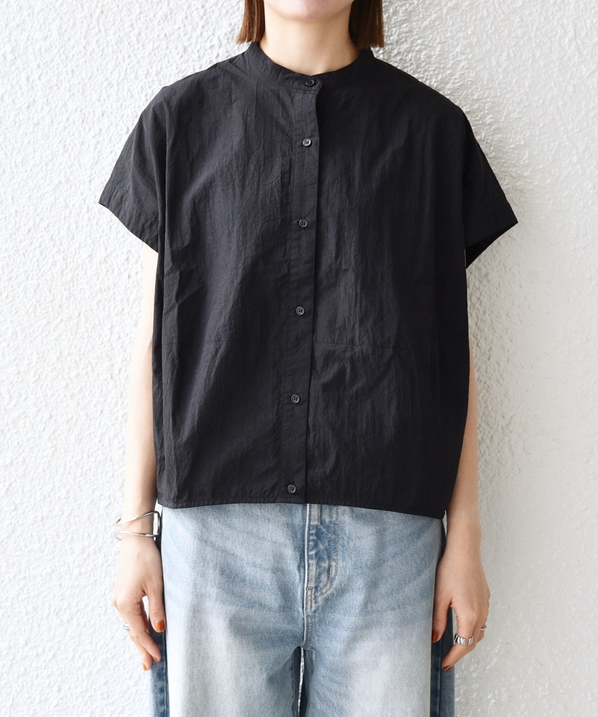スタンドカラーできちんと感がありながら、フレンチスリーブで程よく肩をカバーして抜け感のある印象に。