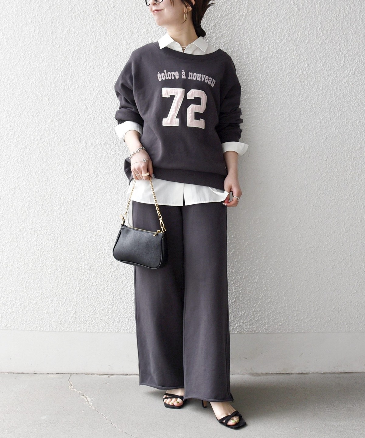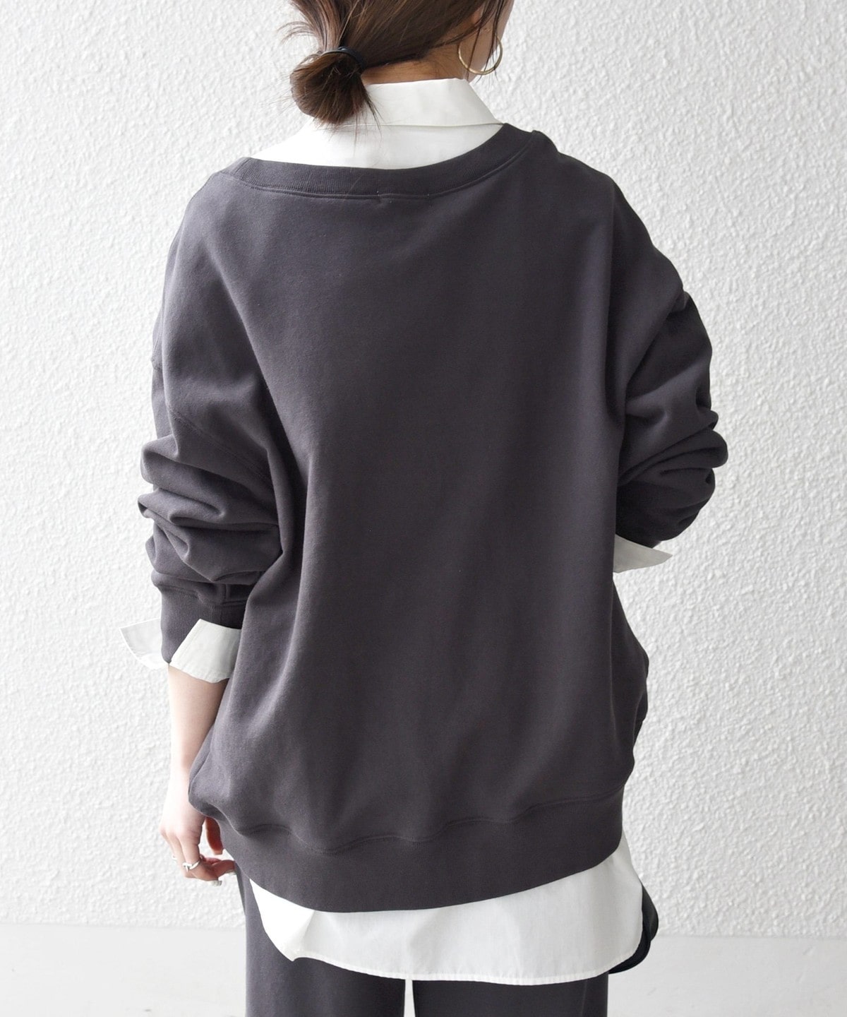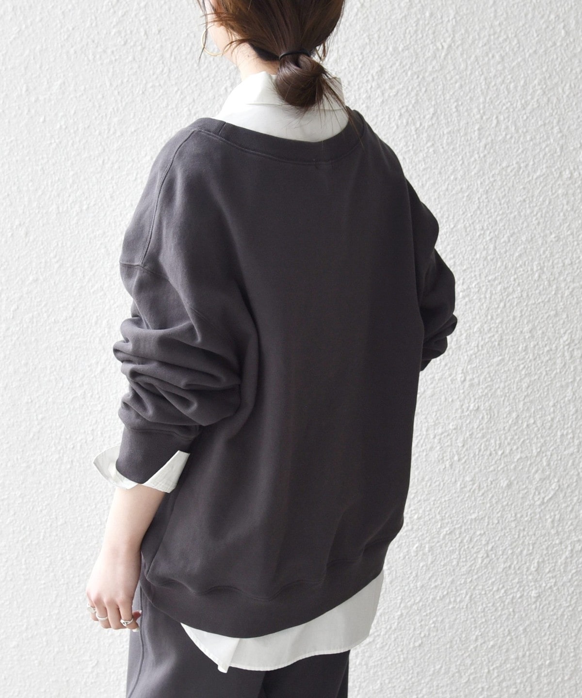 ゆとりのあるオーバーな身幅にドロップショルダーでリラックス感があり、広めのネックラインが大人っぽいラフな印象に。