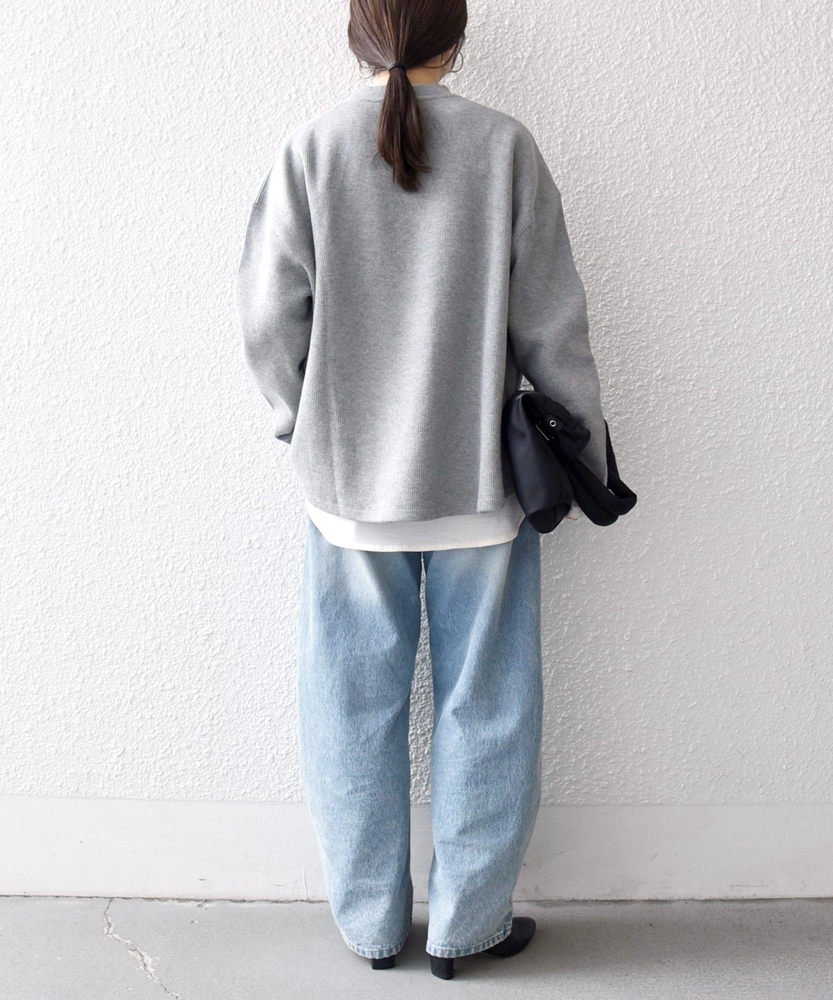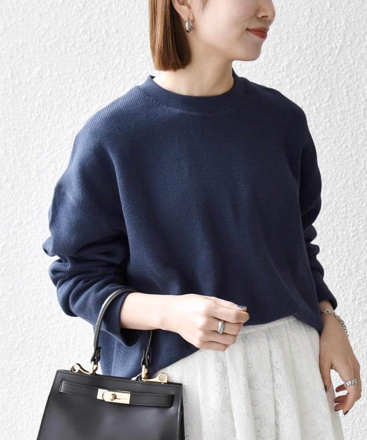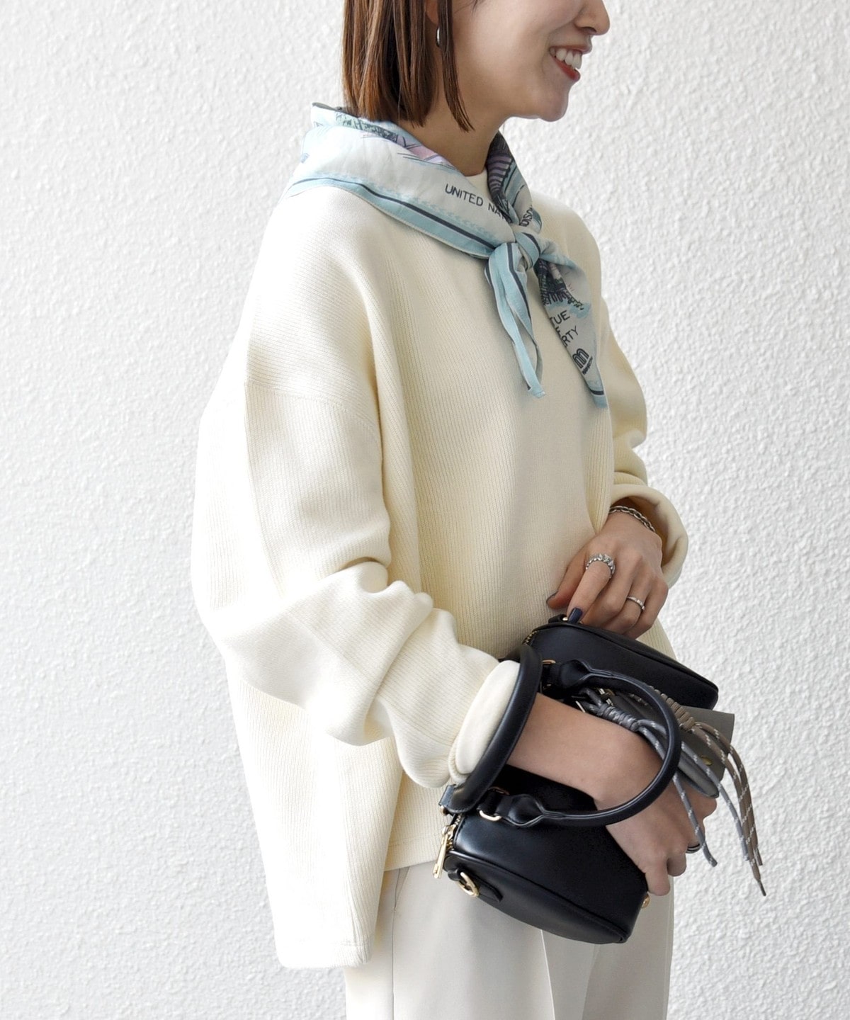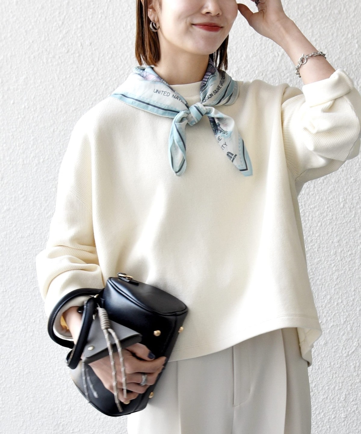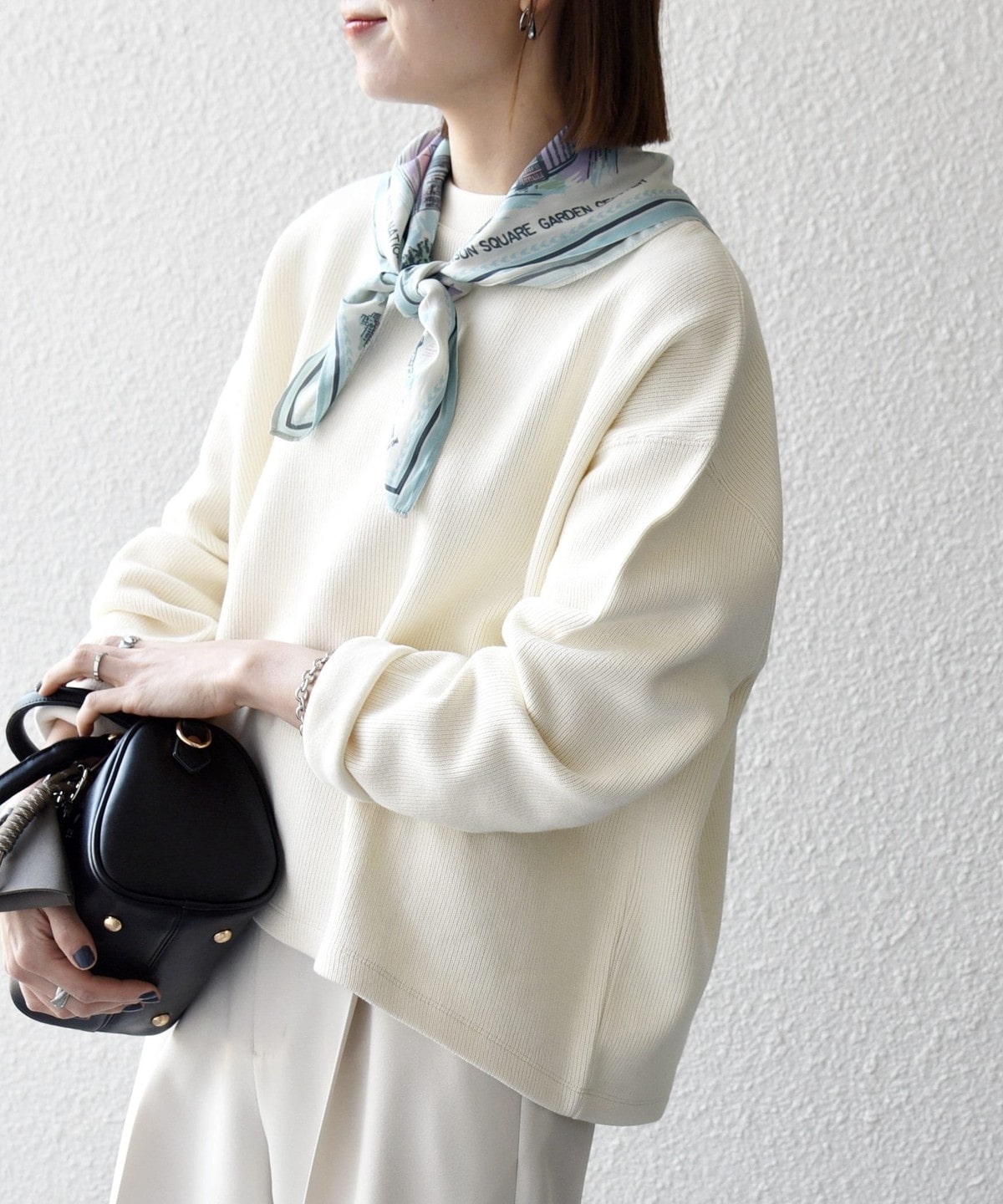 すっきりとしたクルーネックのため、ストールやスカーフを巻いた首元のアレンジも楽しめます。