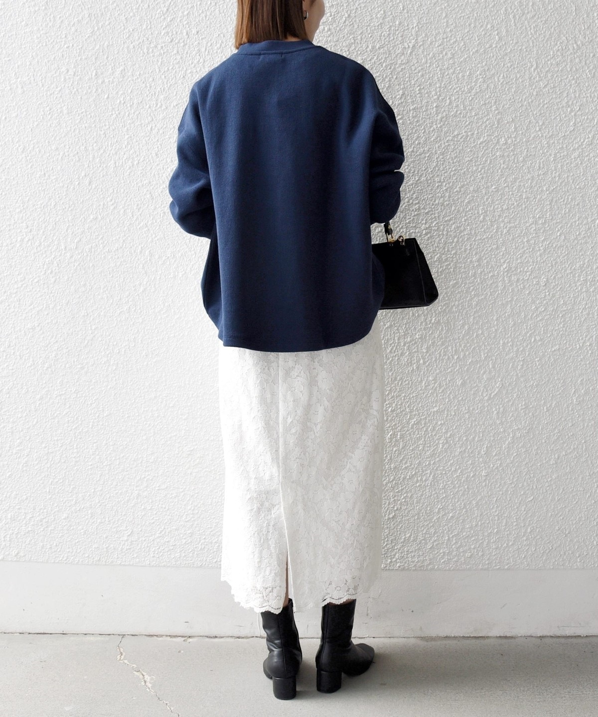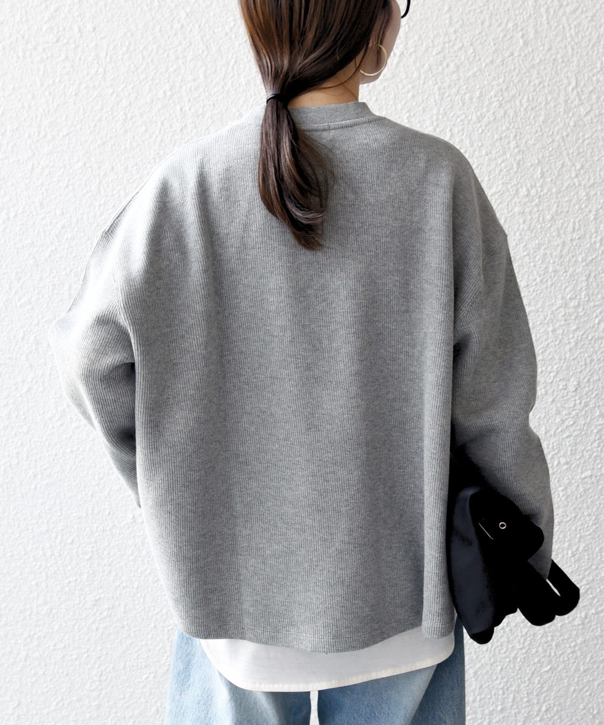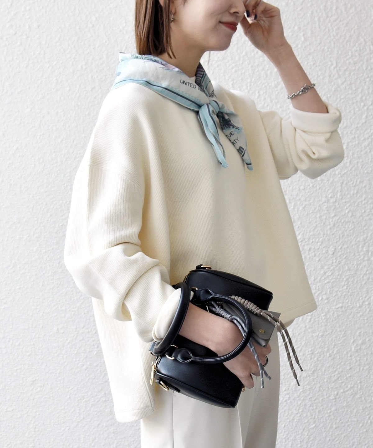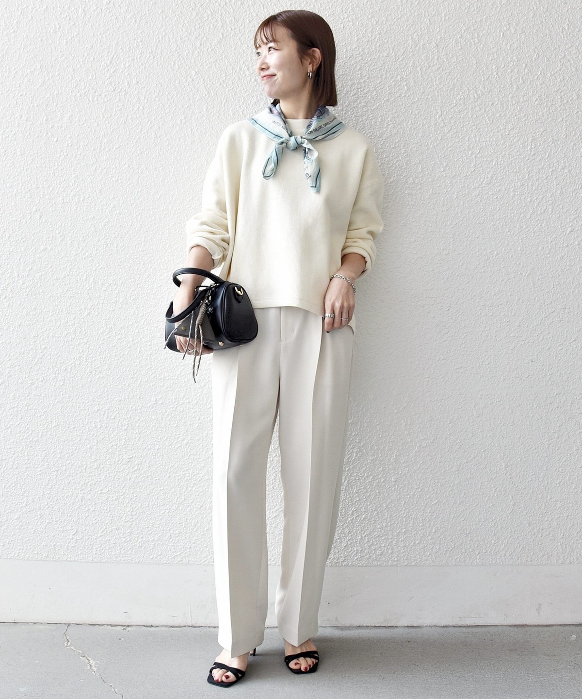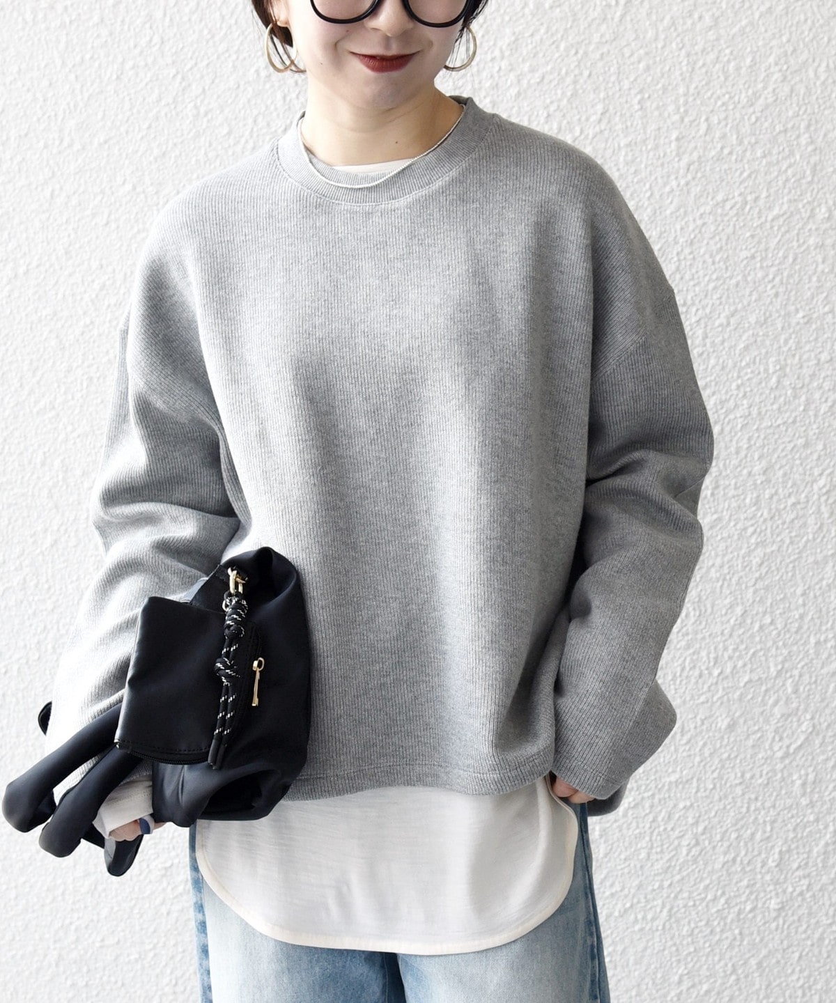 すっきりとしたクルーネックのため、ストールやスカーフを巻いた首元のアレンジも楽しめます。