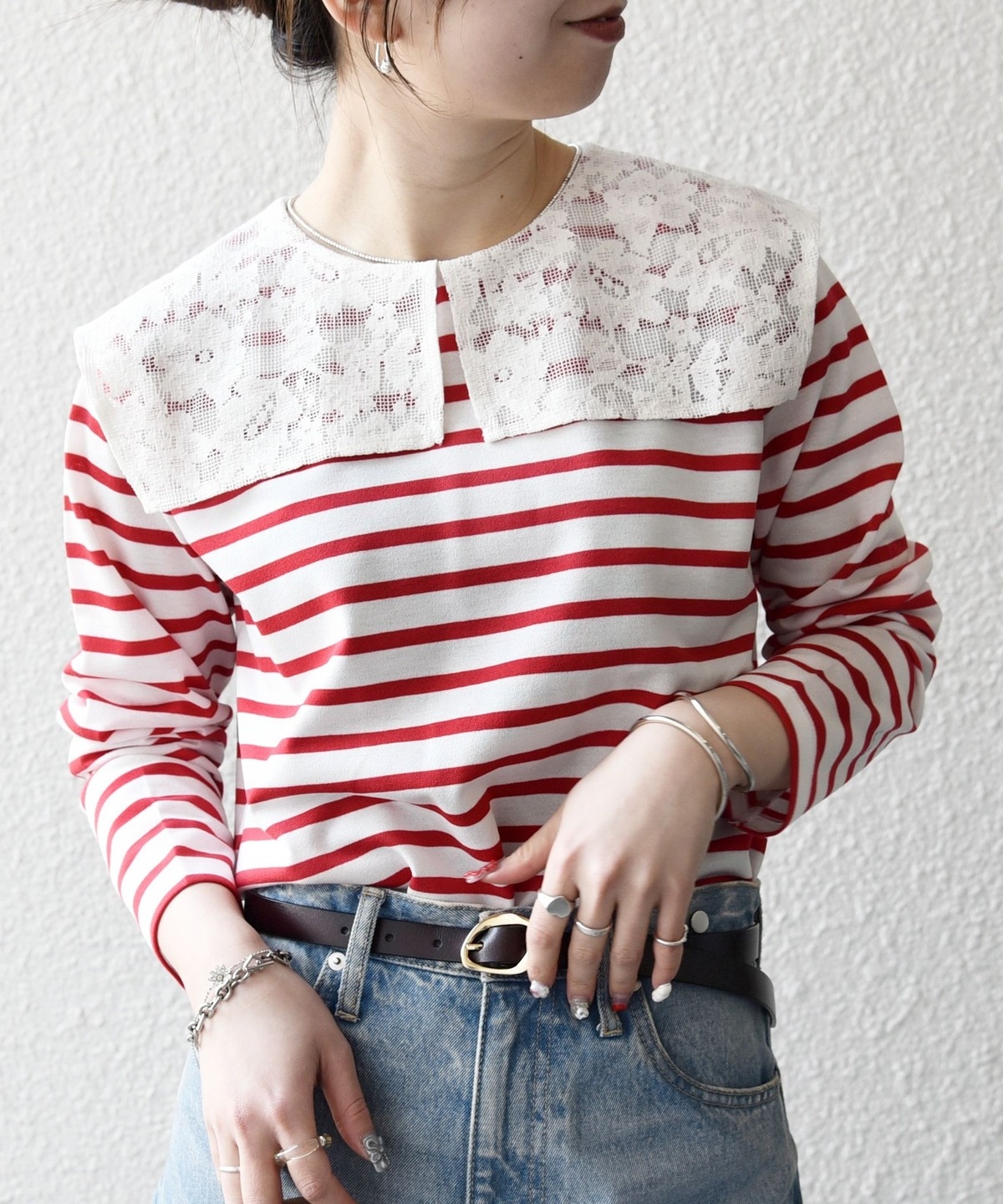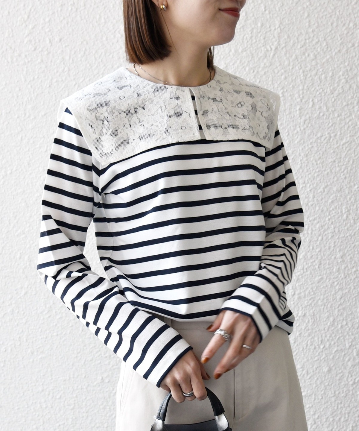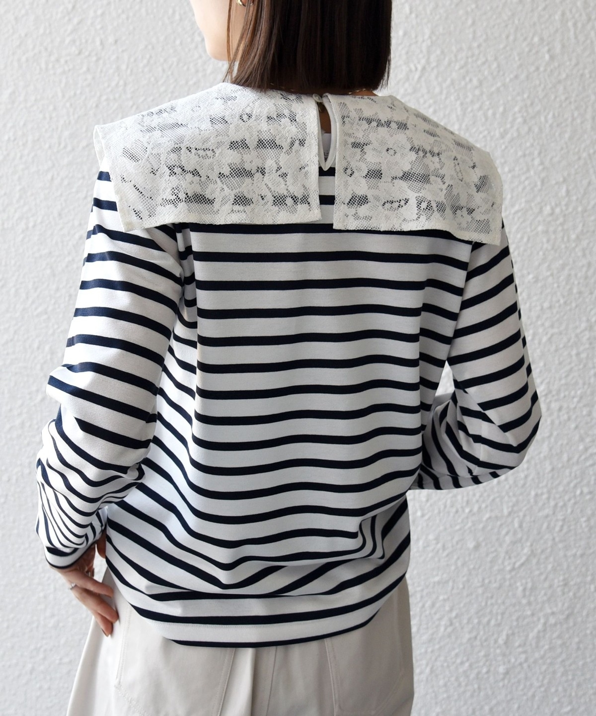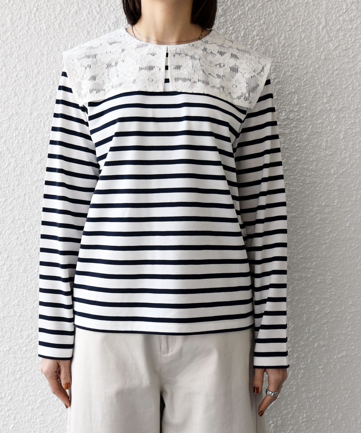 マリンボーダーにレースのセーラーカラーをあしらった、存在感のあるロンT。