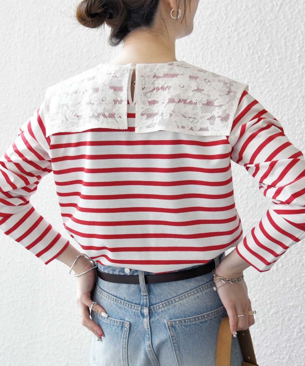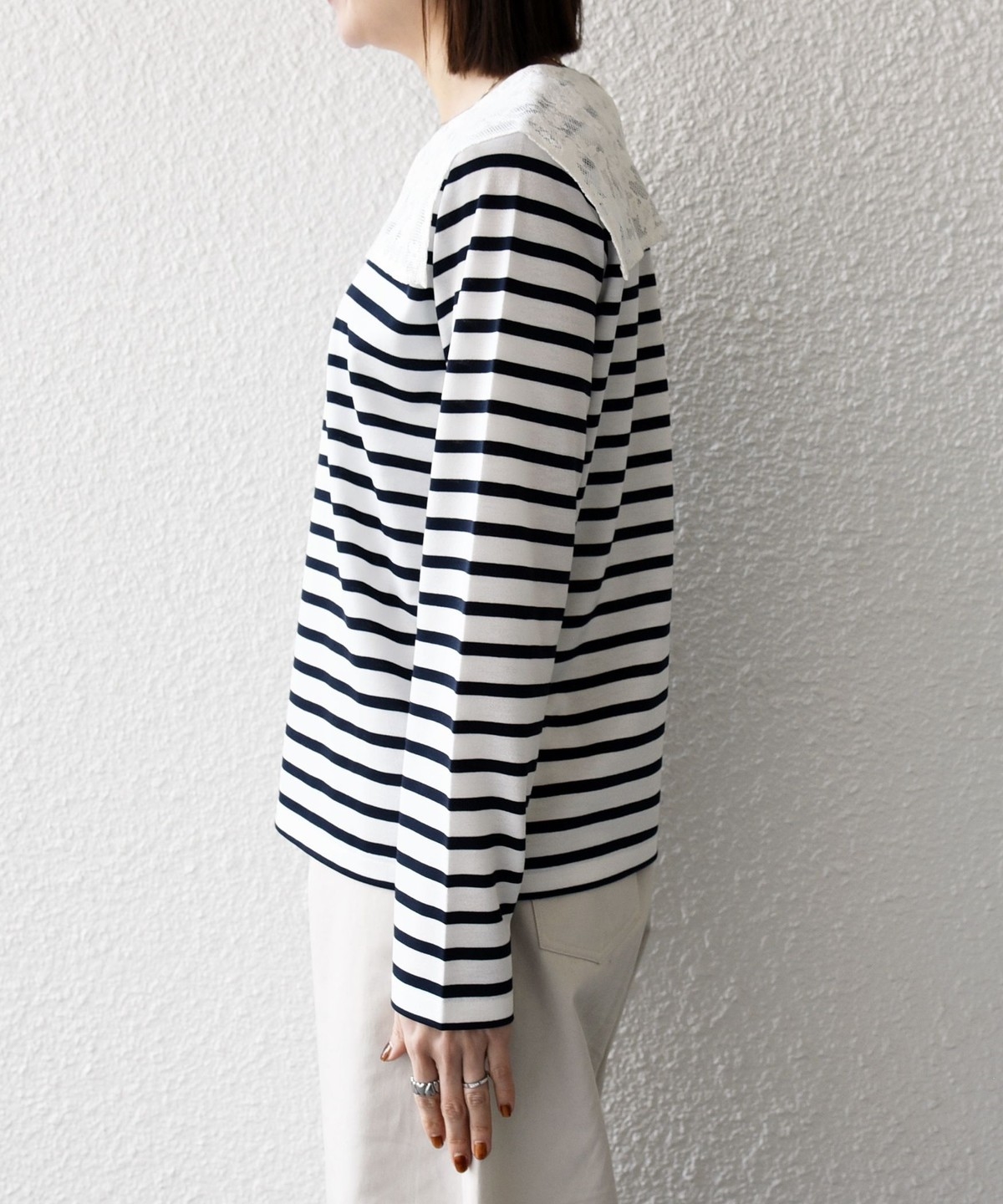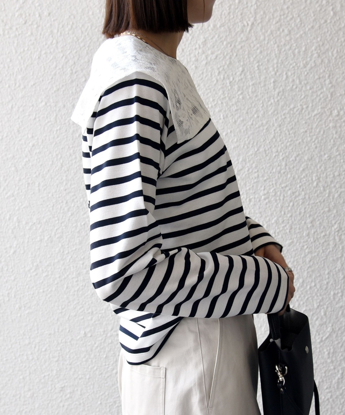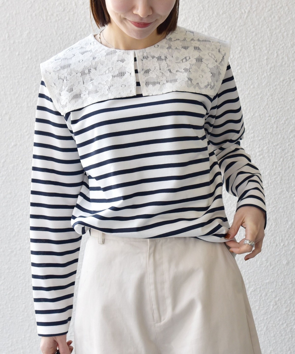 マリンボーダーにレースのセーラーカラーをあしらった、存在感のあるロンT。