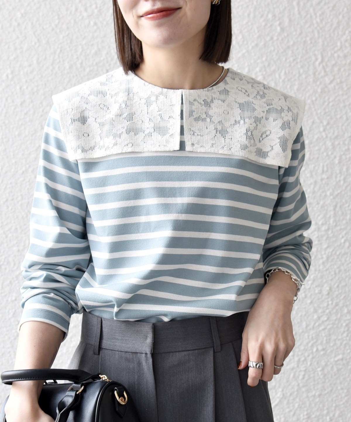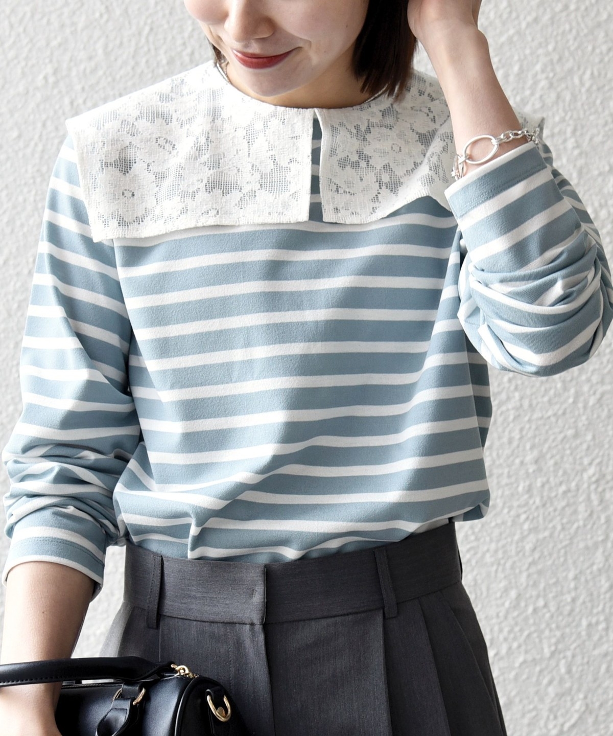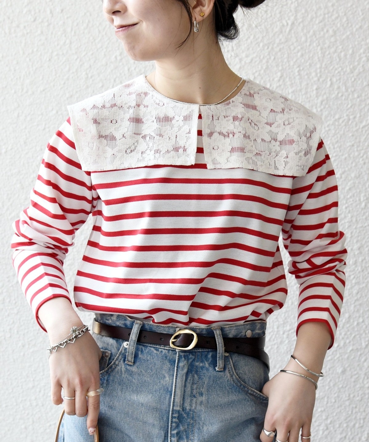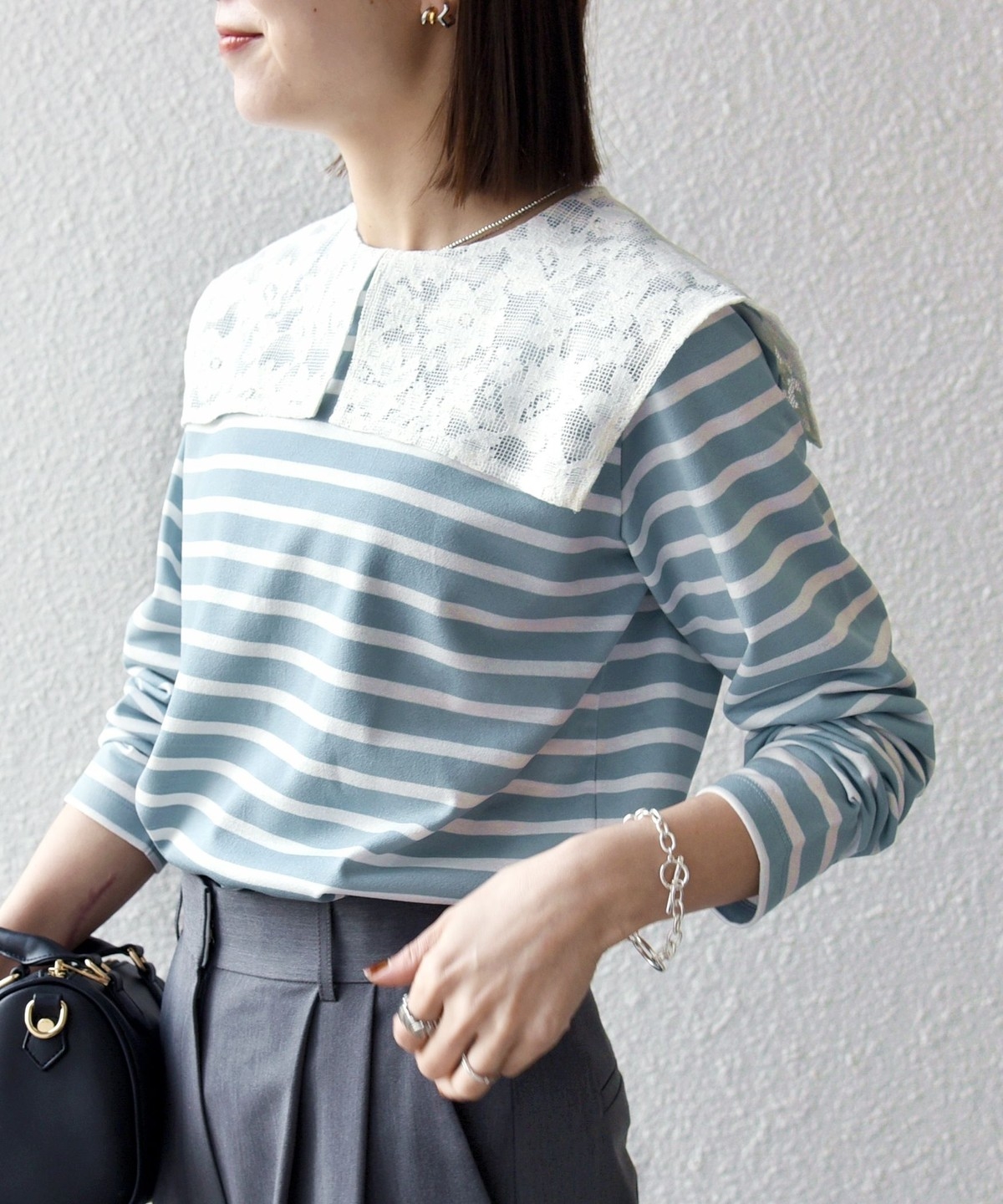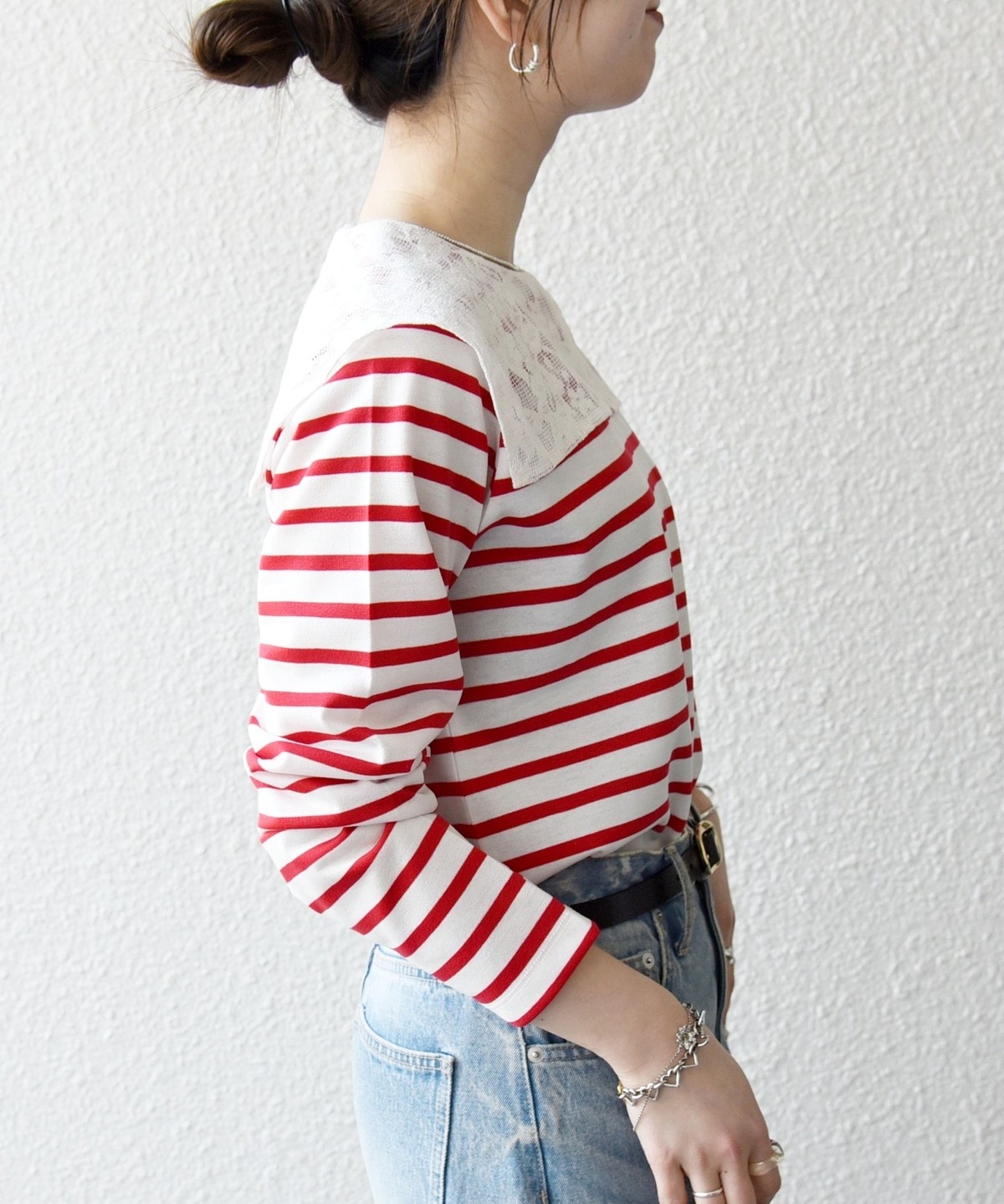 マリンボーダーにレースのセーラーカラーをあしらった、存在感のあるロンT。