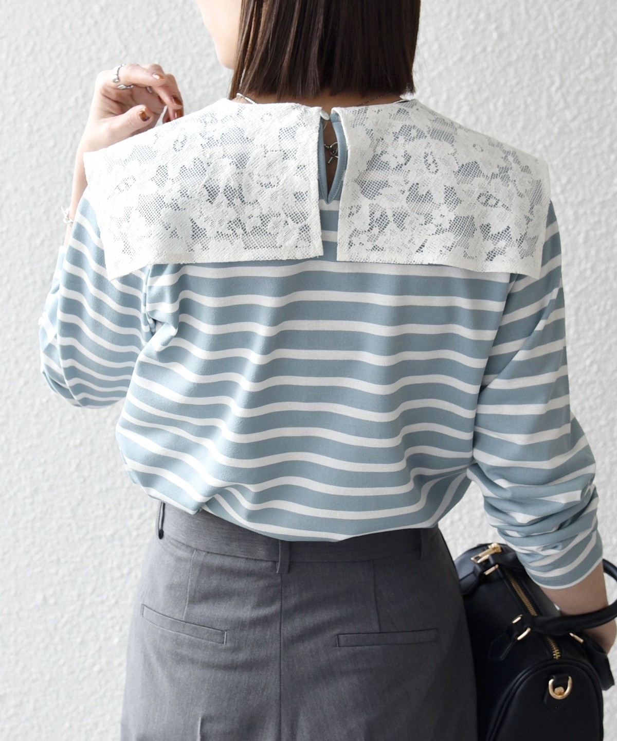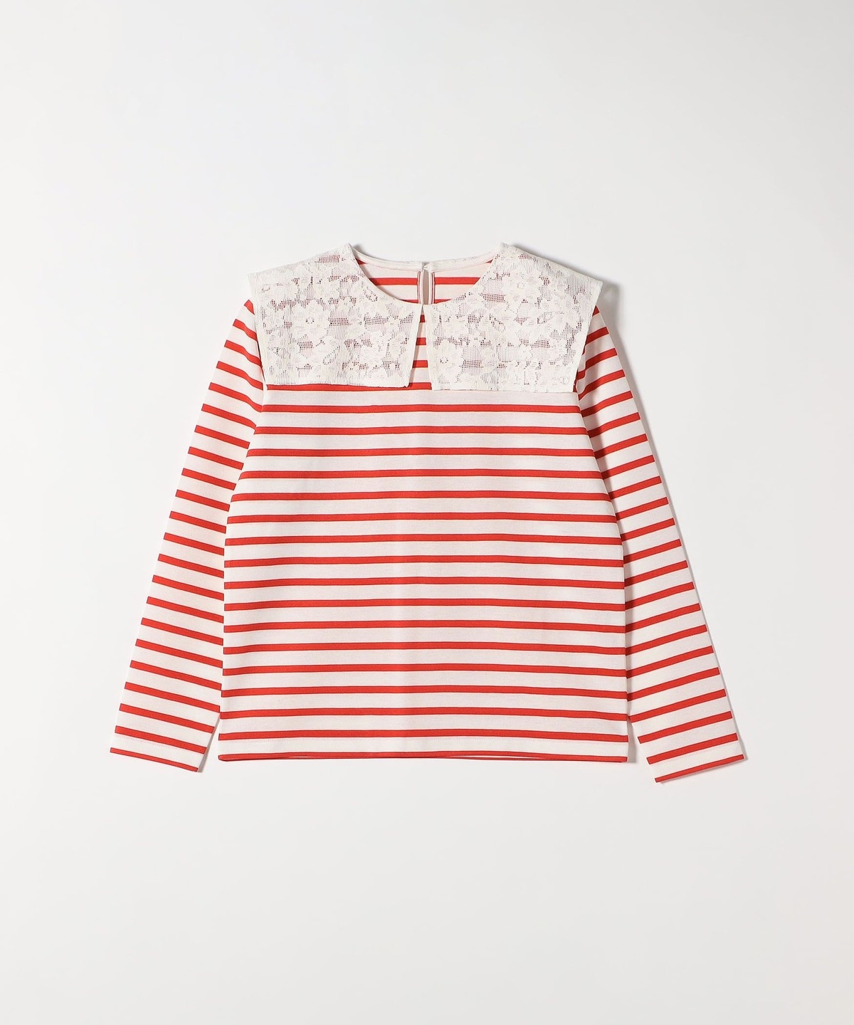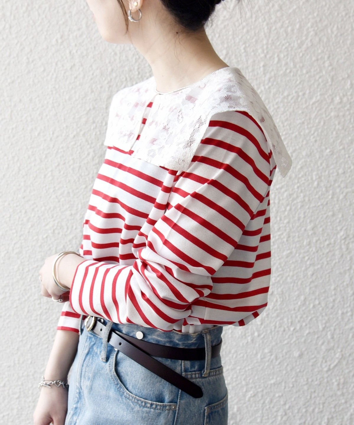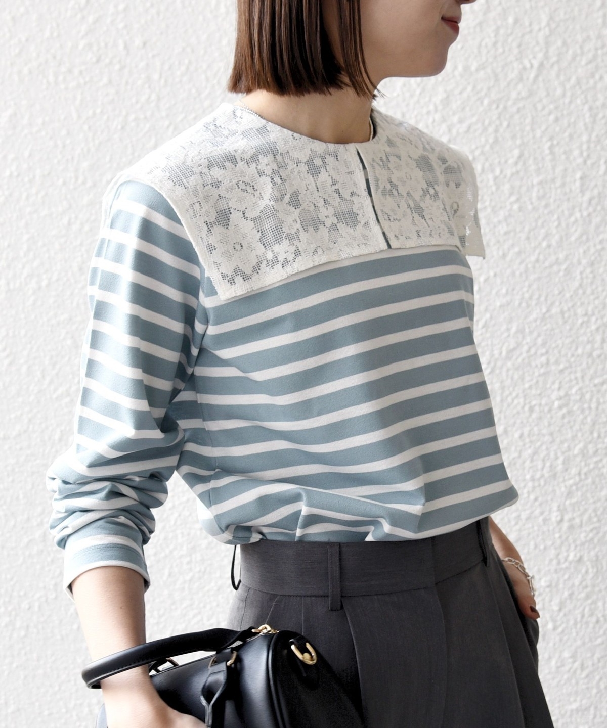 マリンボーダーにレースのセーラーカラーをあしらった、存在感のあるロンT。
