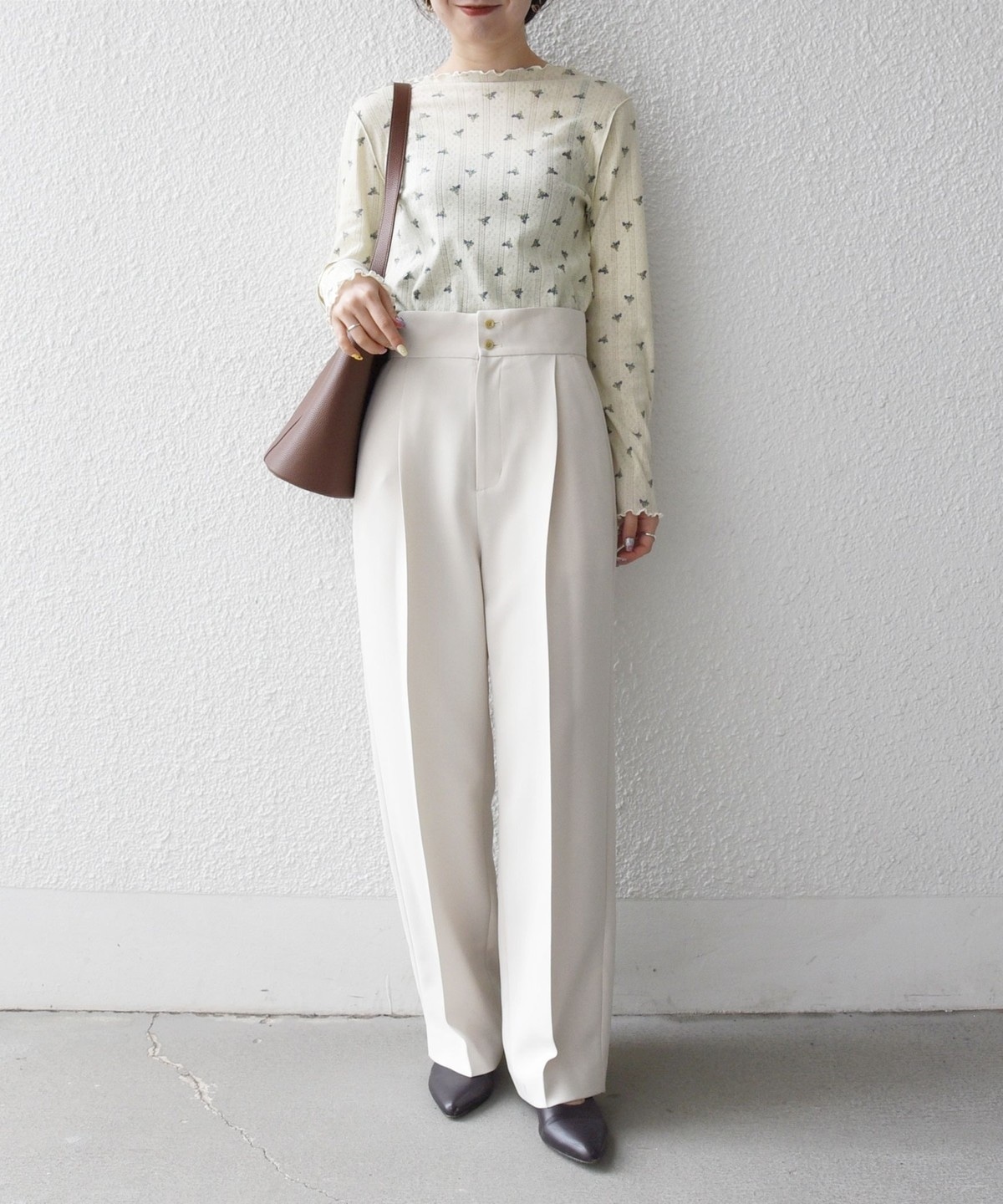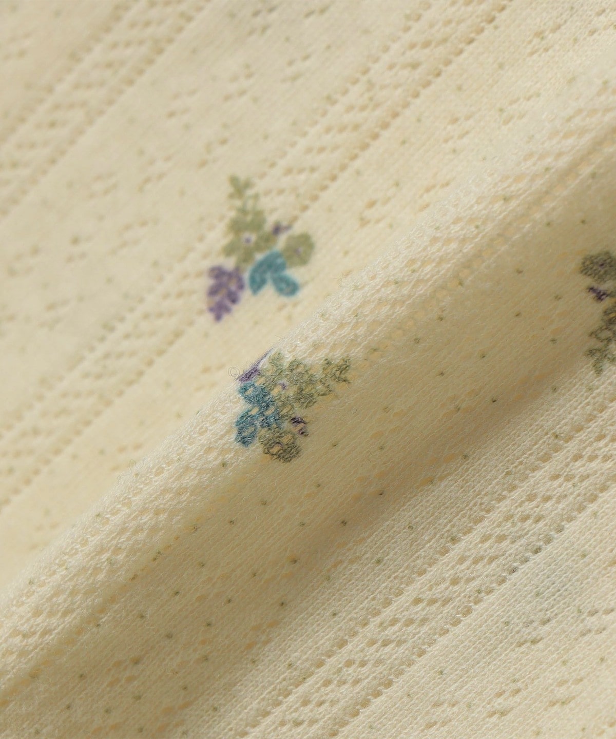 針抜きアイレット素材にフラワープリントをのせた、レトロな雰囲気が今季らしい素材。
