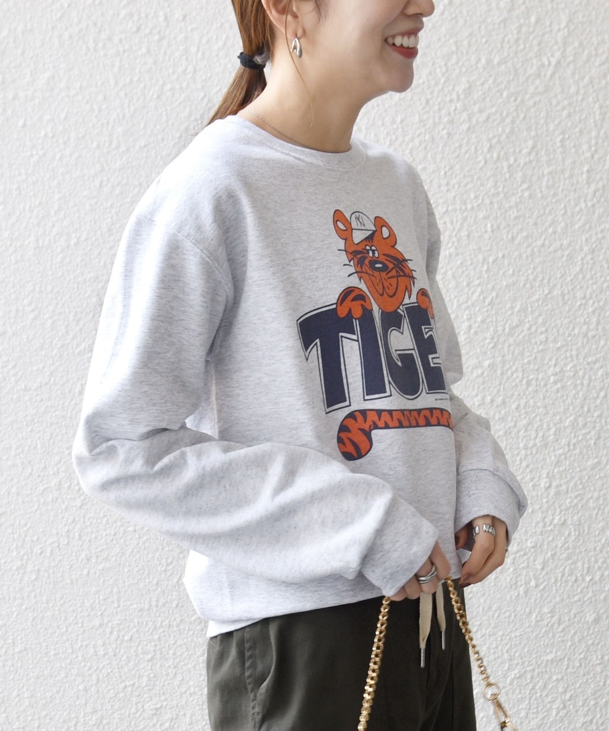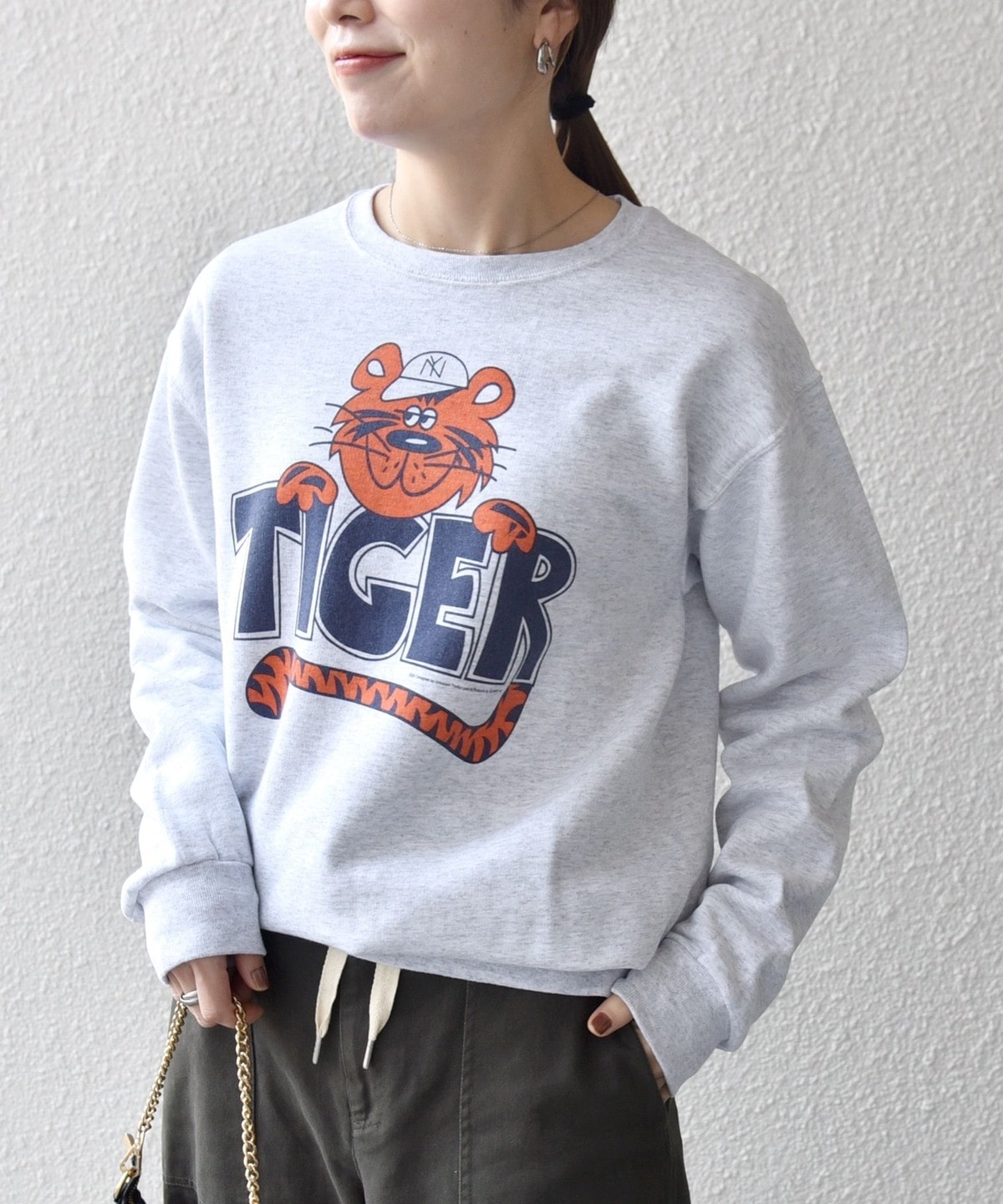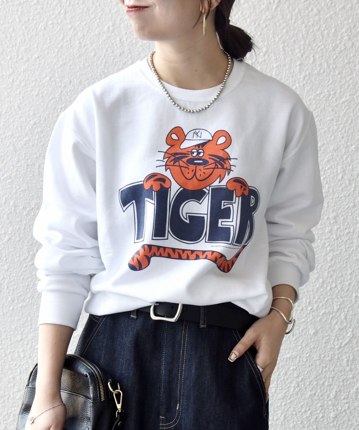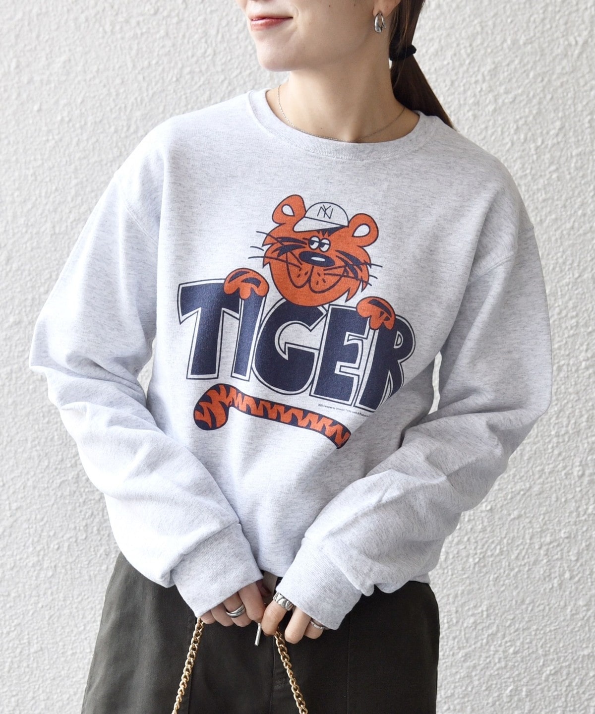 可愛らしいタイガープリントがアクセントになった、クルーネックスウェット。