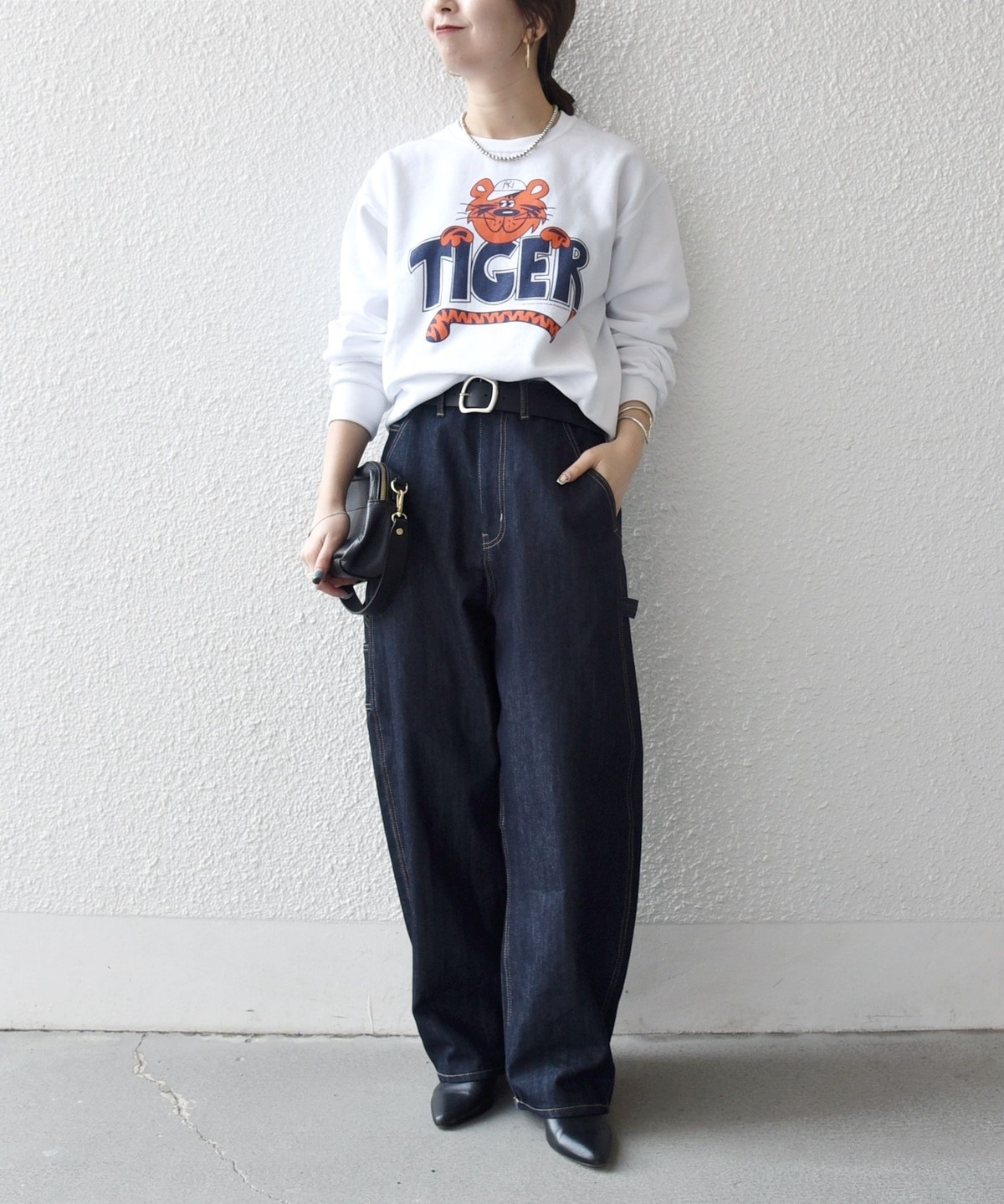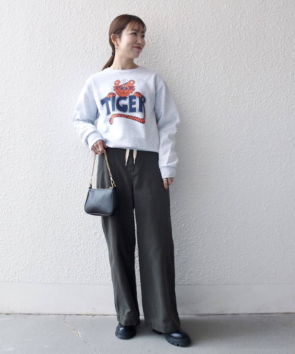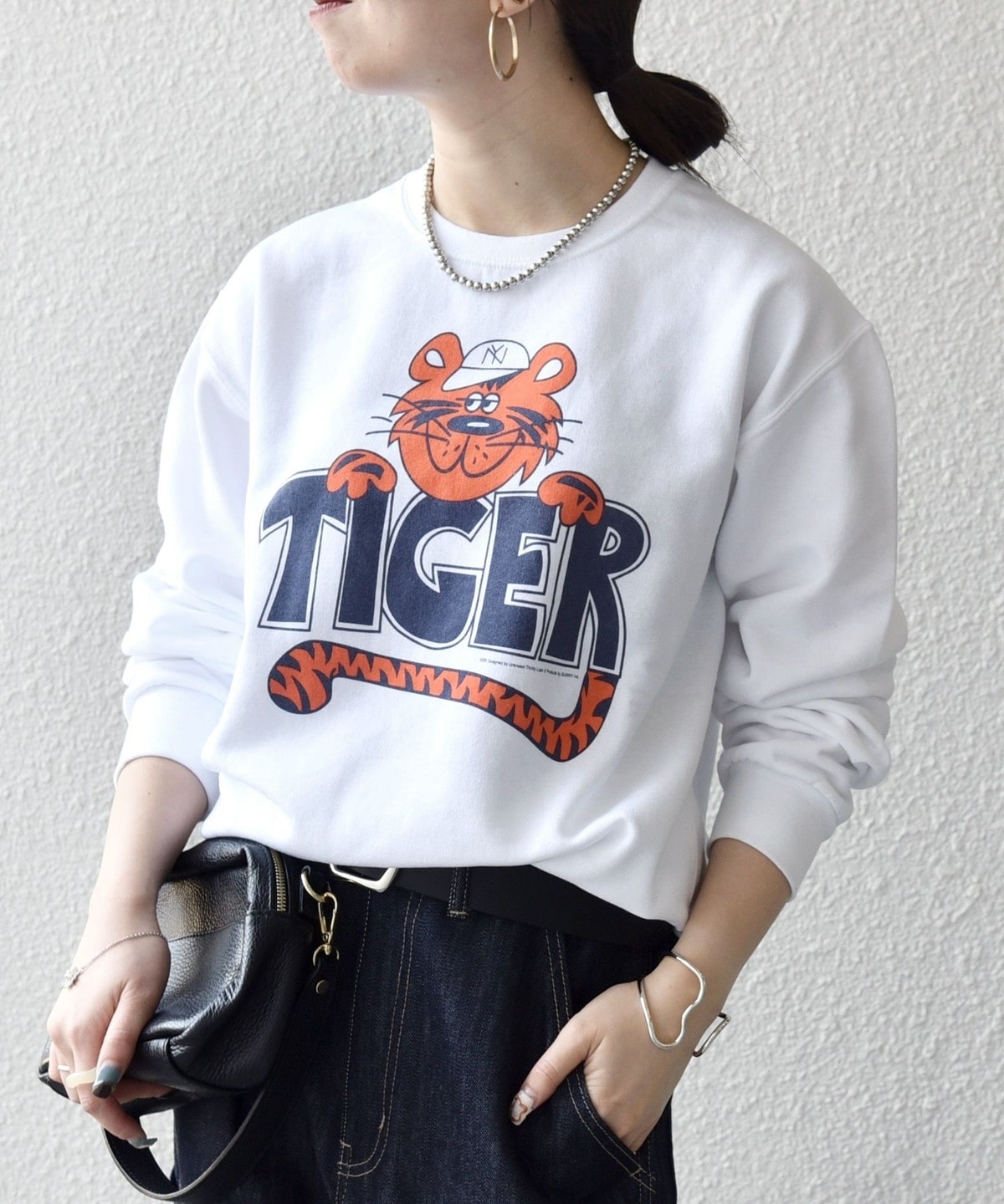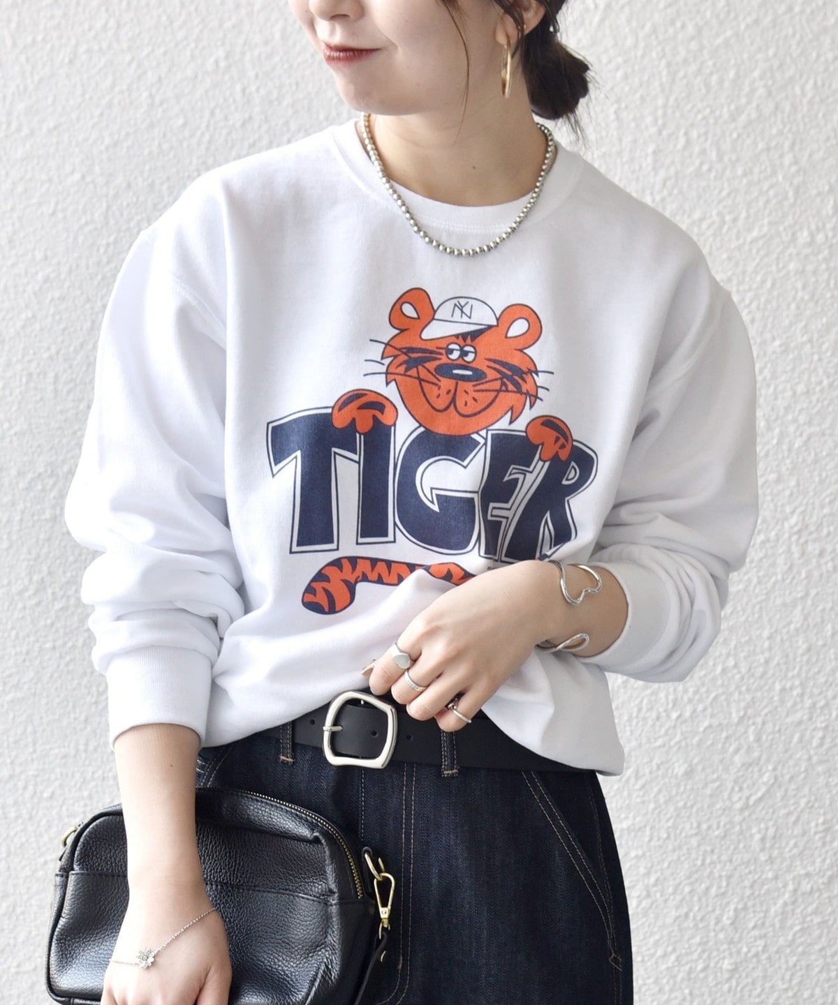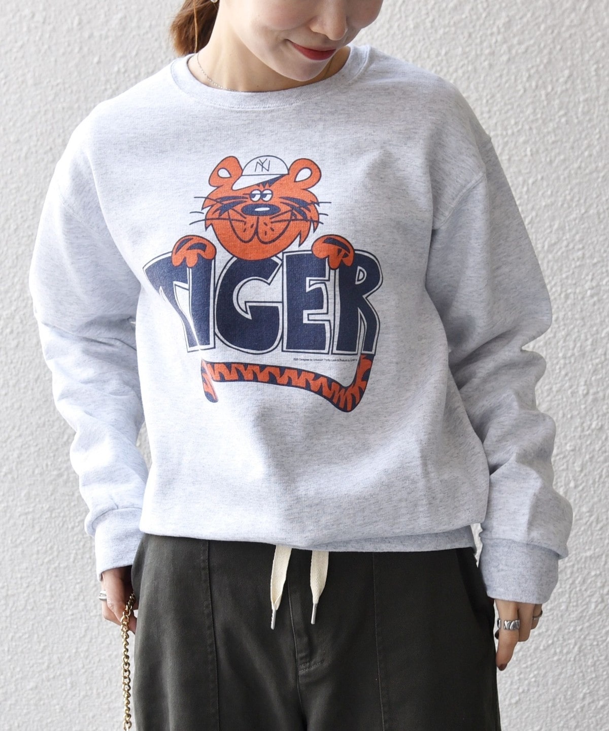 可愛らしいタイガープリントがアクセントになった、クルーネックスウェット。