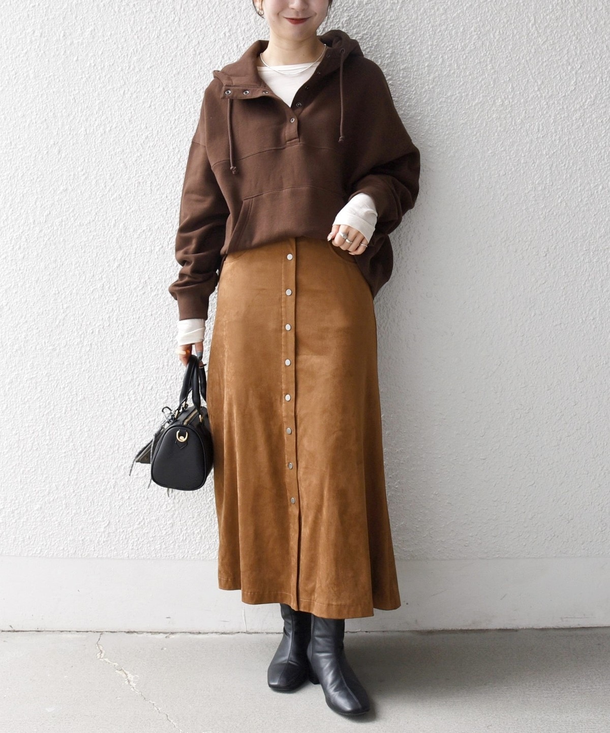 フードはドロスト仕様なので、少し絞って着こなすのもトレンド感があって◎