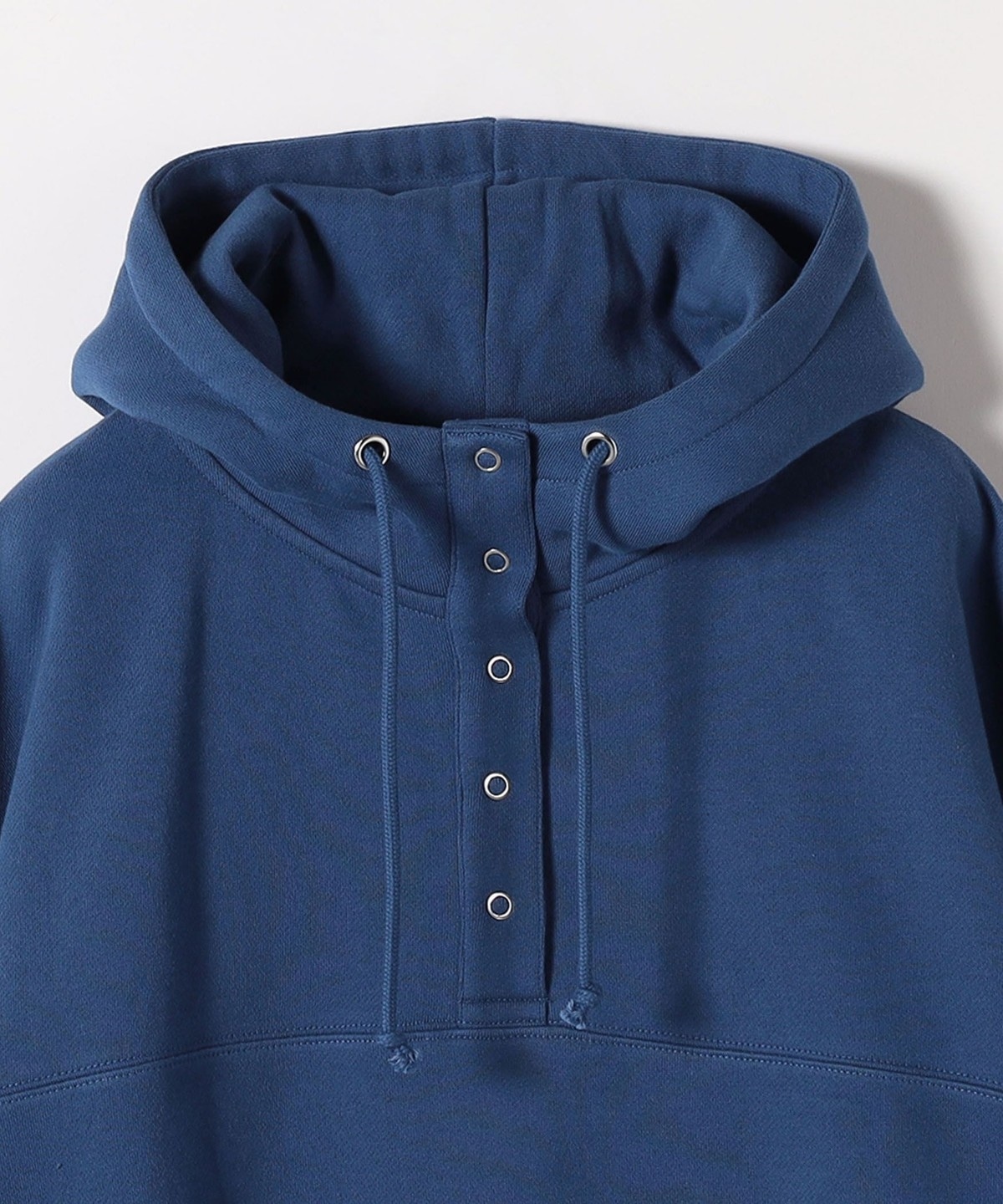 アノラックを思わせる前立てのスナップボタンと、フロントの大きめのポケットがポイント。