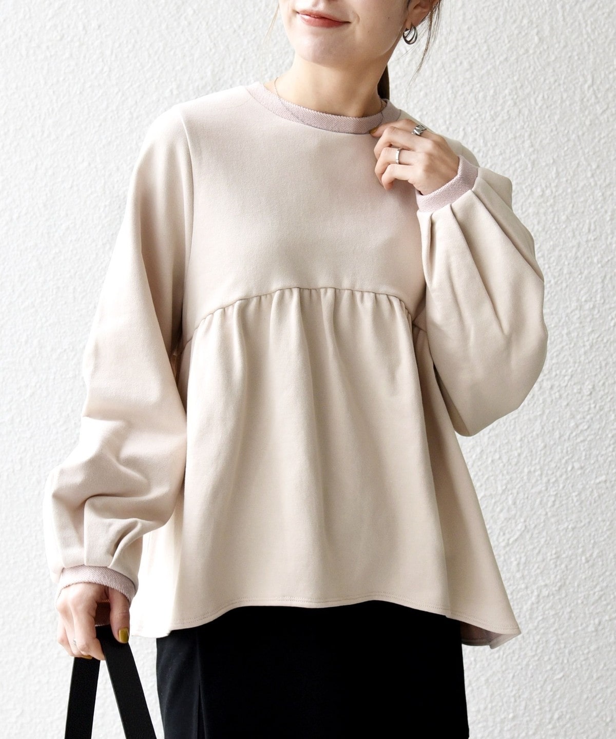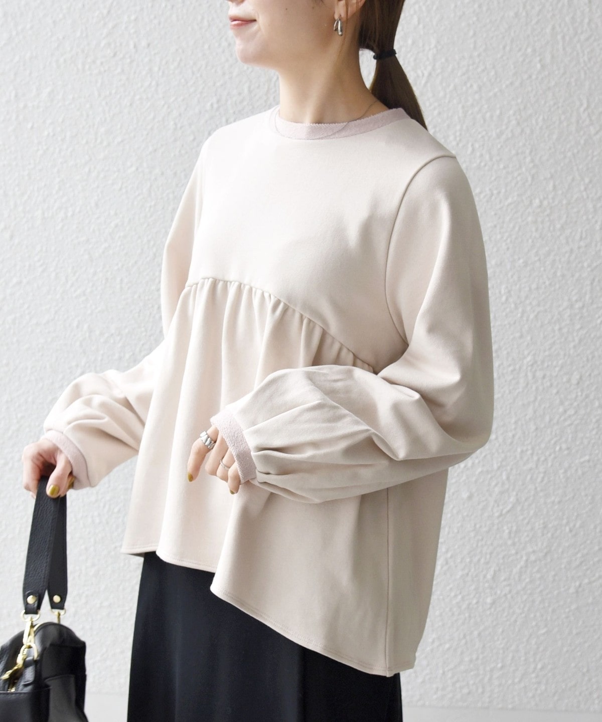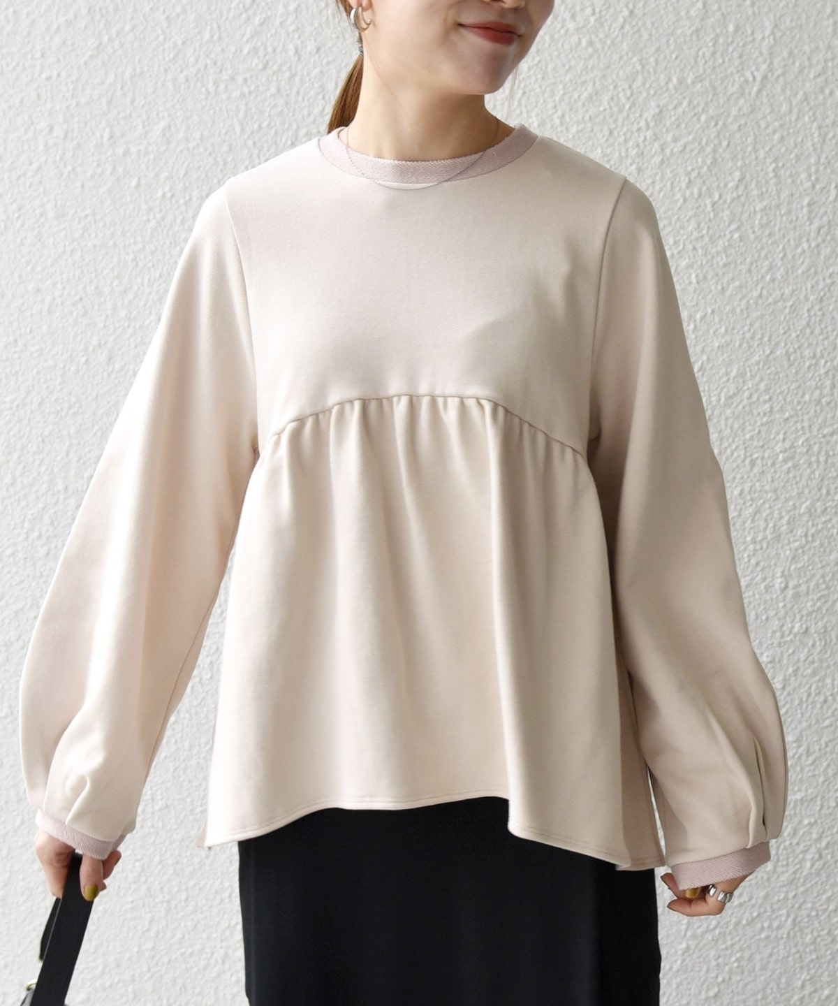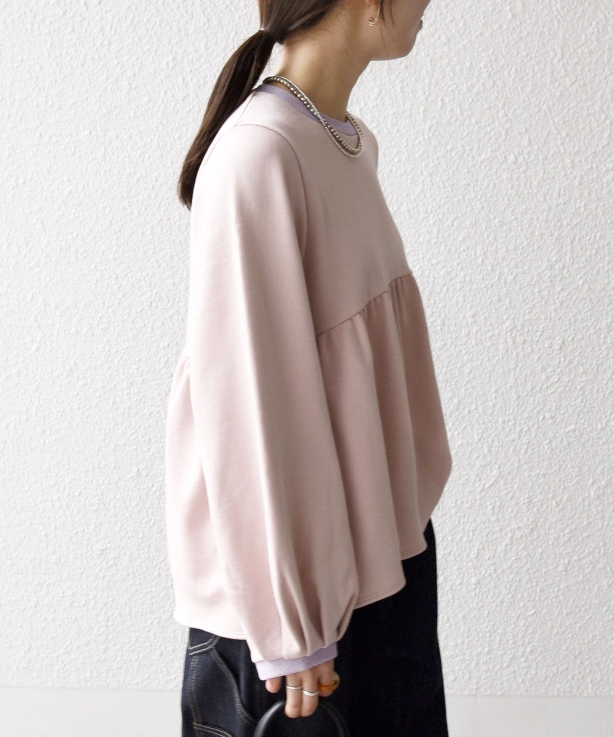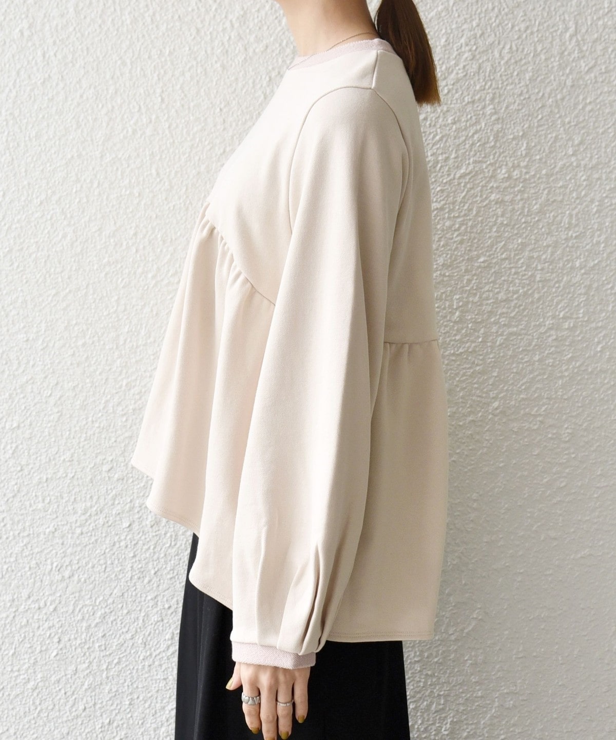 胸下の切り替えと袖口にたっぷり入ったギャザーが可愛い、ペプラムデザインのプルオーバー。