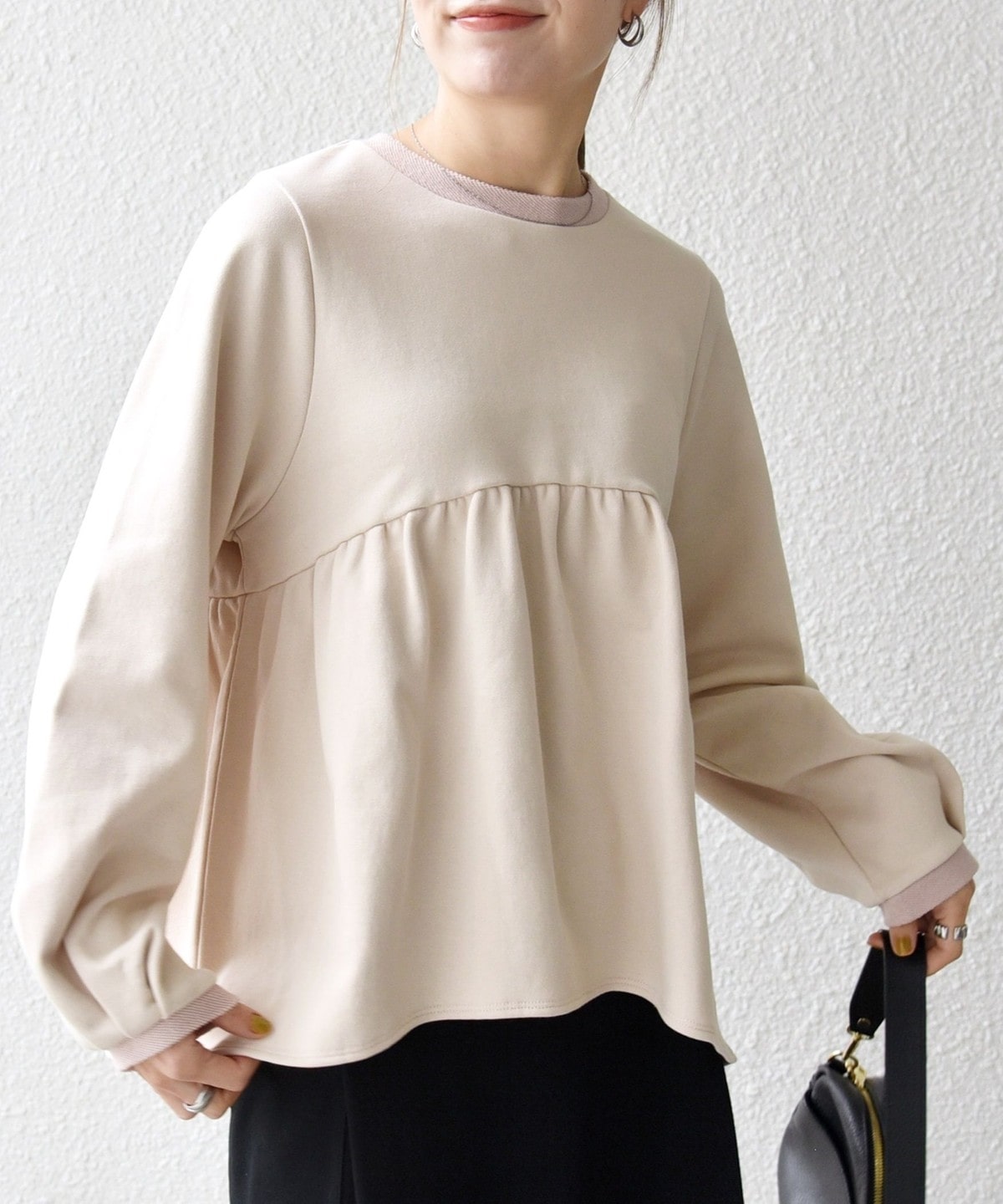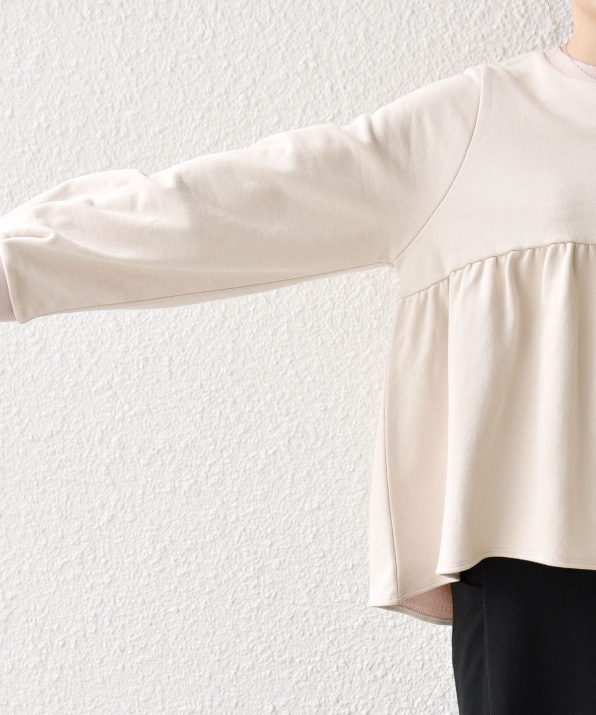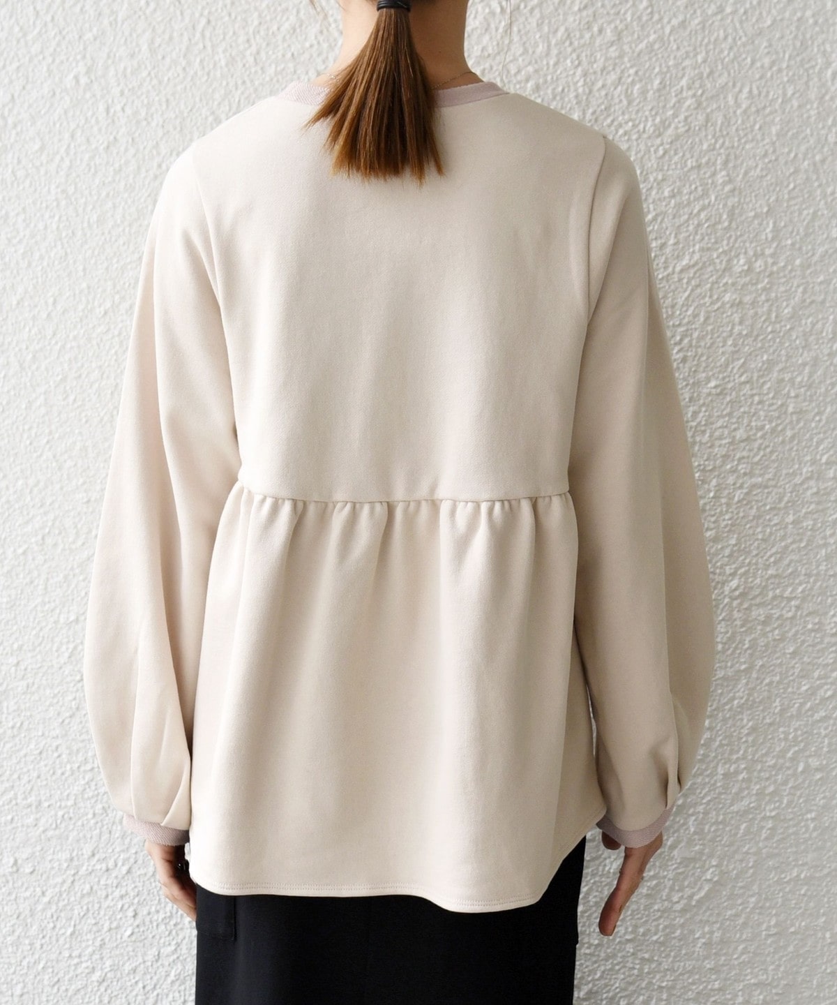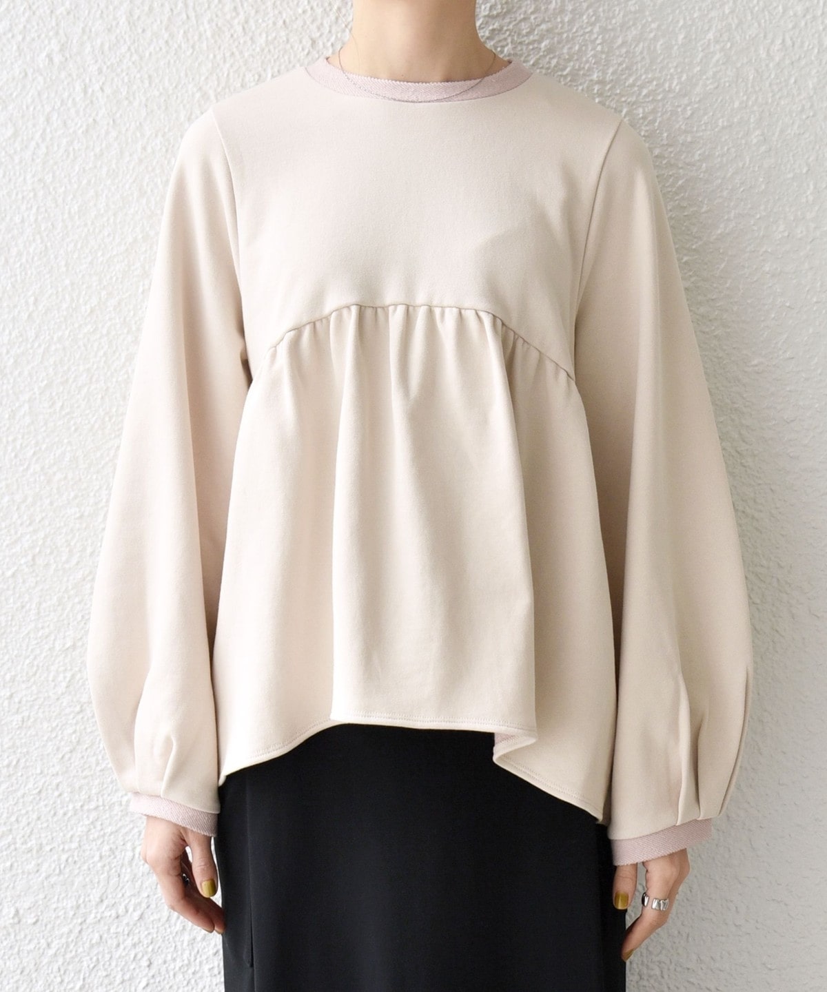 胸下の切り替えと袖口にたっぷり入ったギャザーが可愛い、ペプラムデザインのプルオーバー。