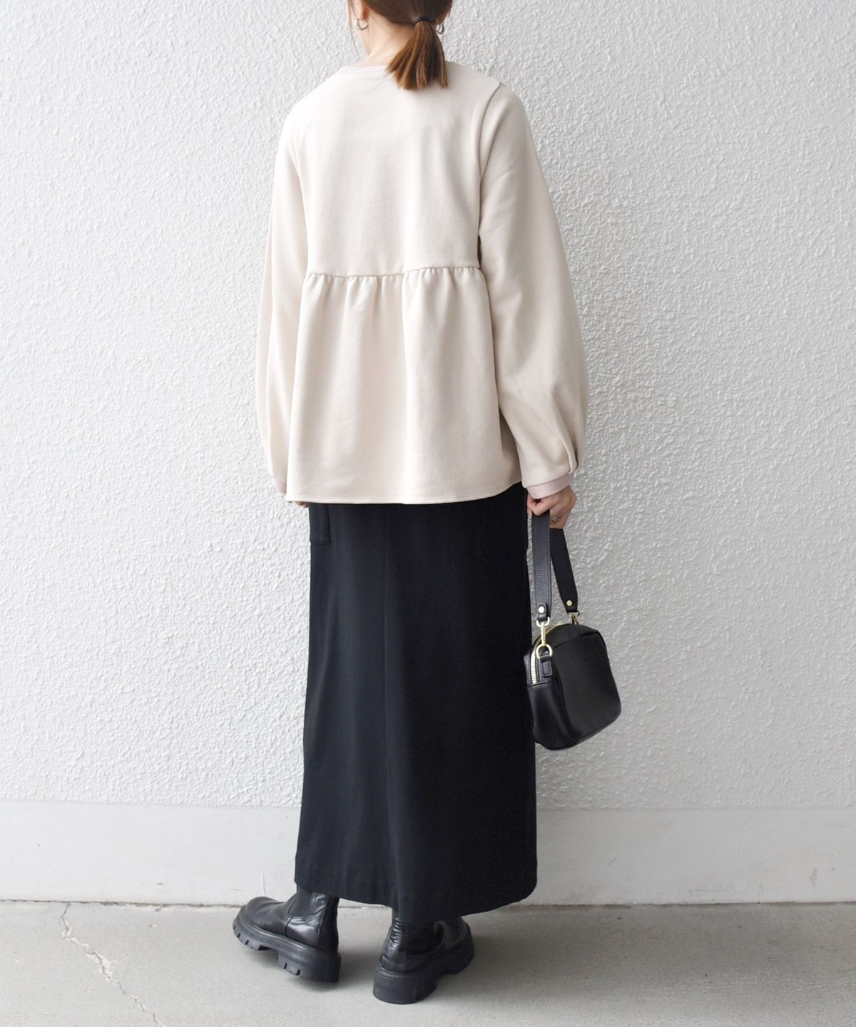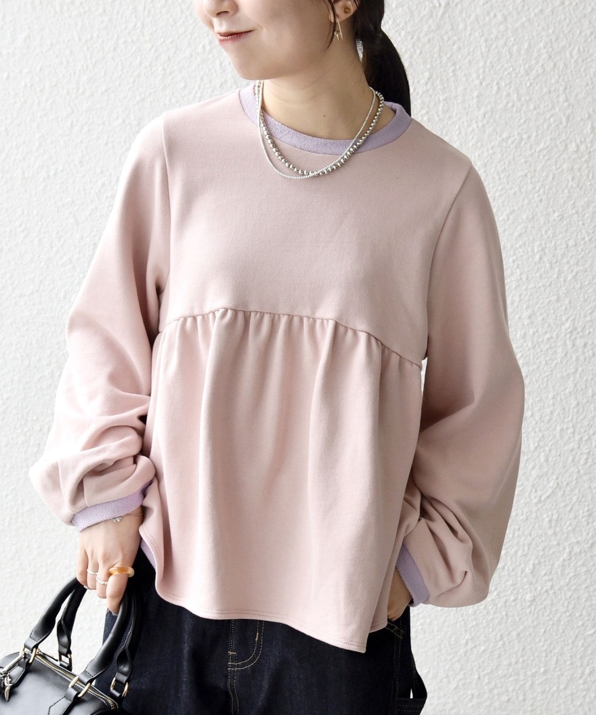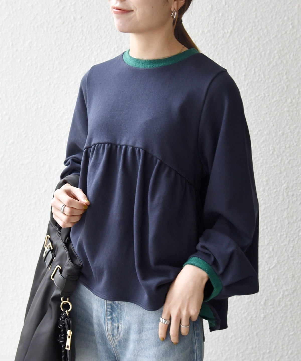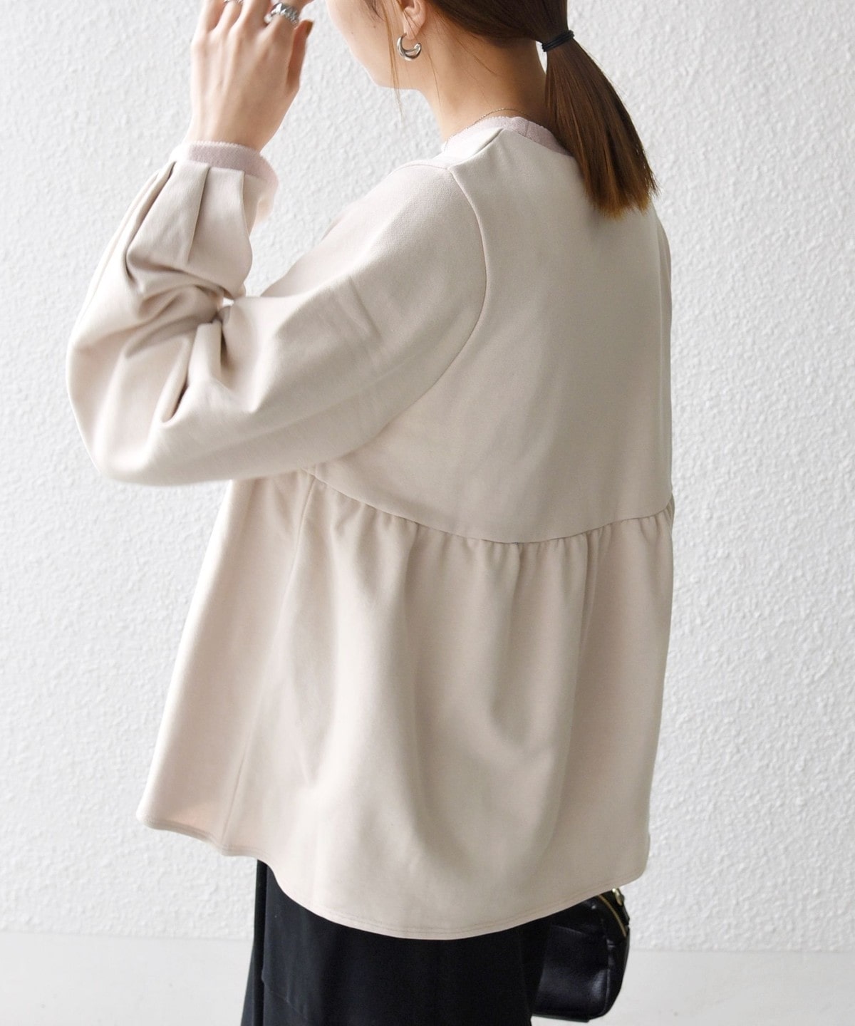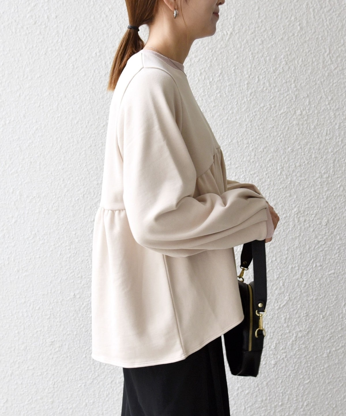 胸下の切り替えと袖口にたっぷり入ったギャザーが可愛い、ペプラムデザインのプルオーバー。