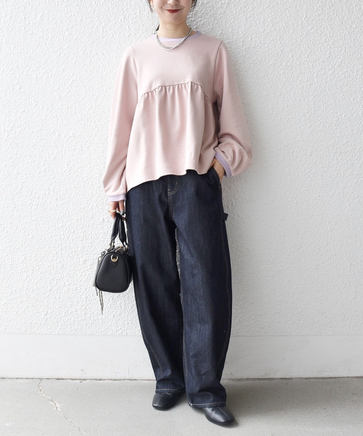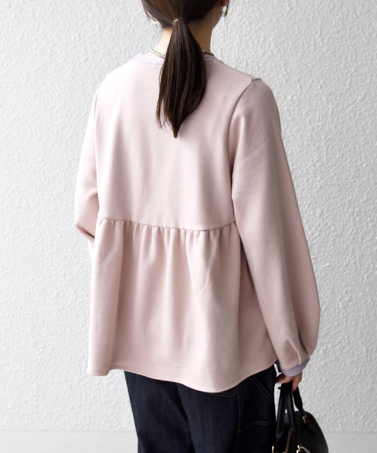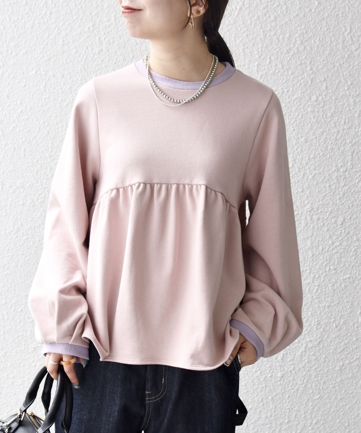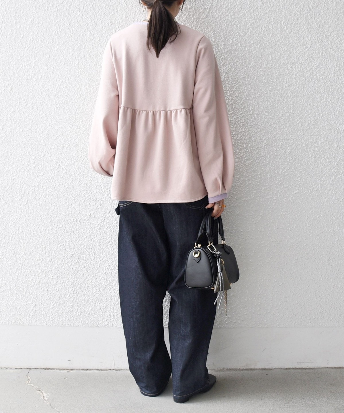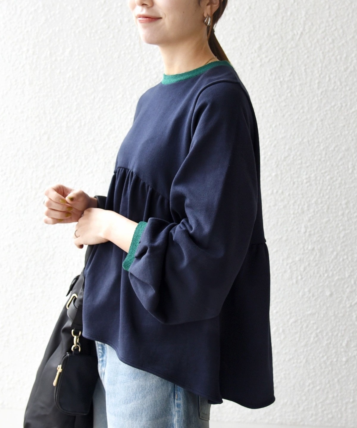 胸下の切り替えと袖口にたっぷり入ったギャザーが可愛い、ペプラムデザインのプルオーバー。
