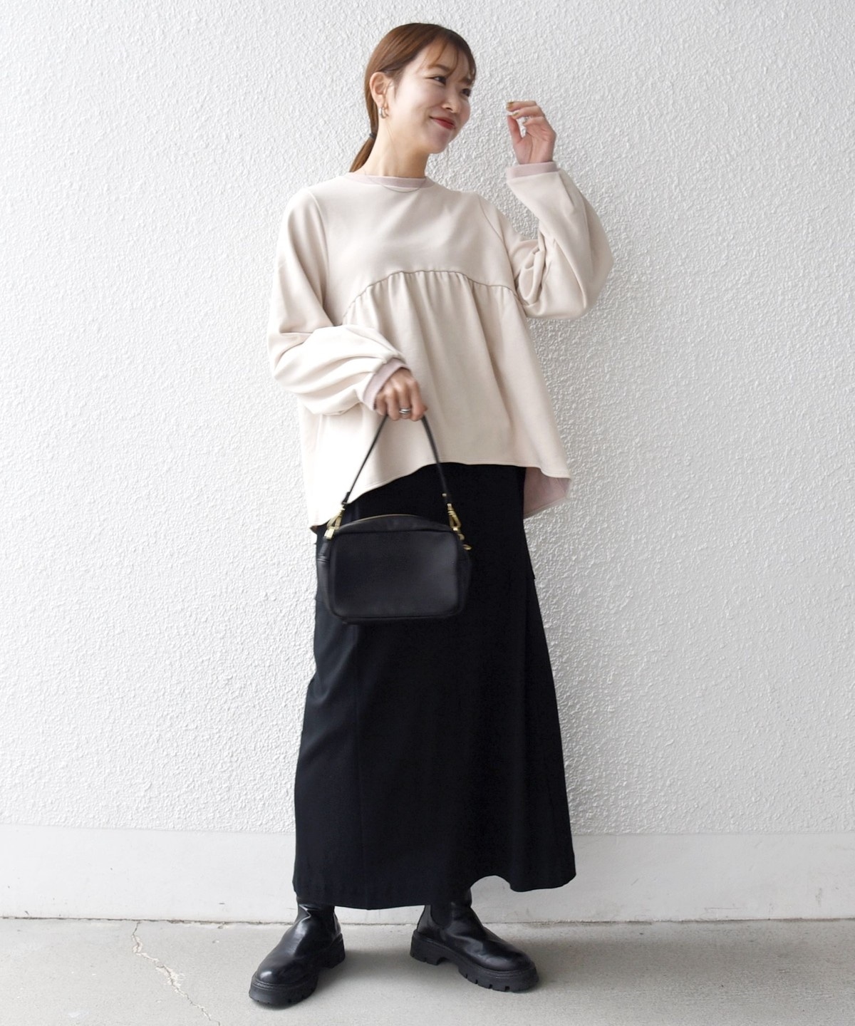切り替え位置が高いので、Iラインシルエットのボトムと合わせていただくと足長効果も◎。