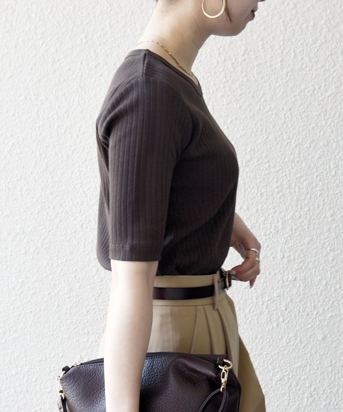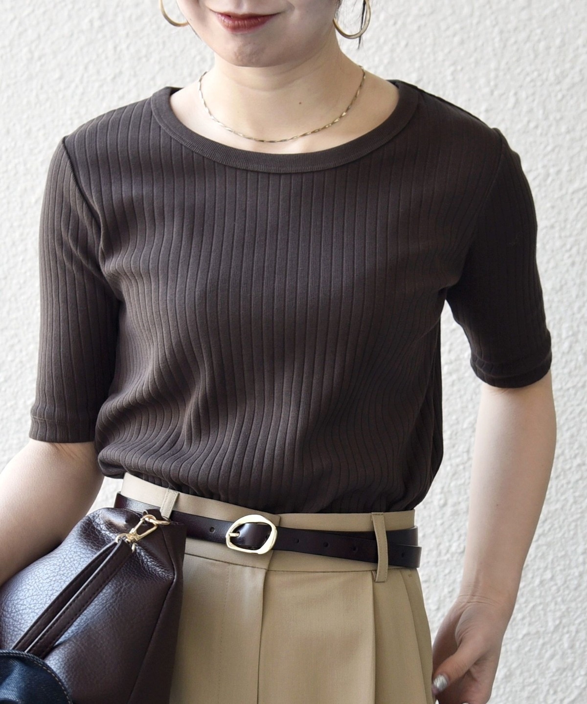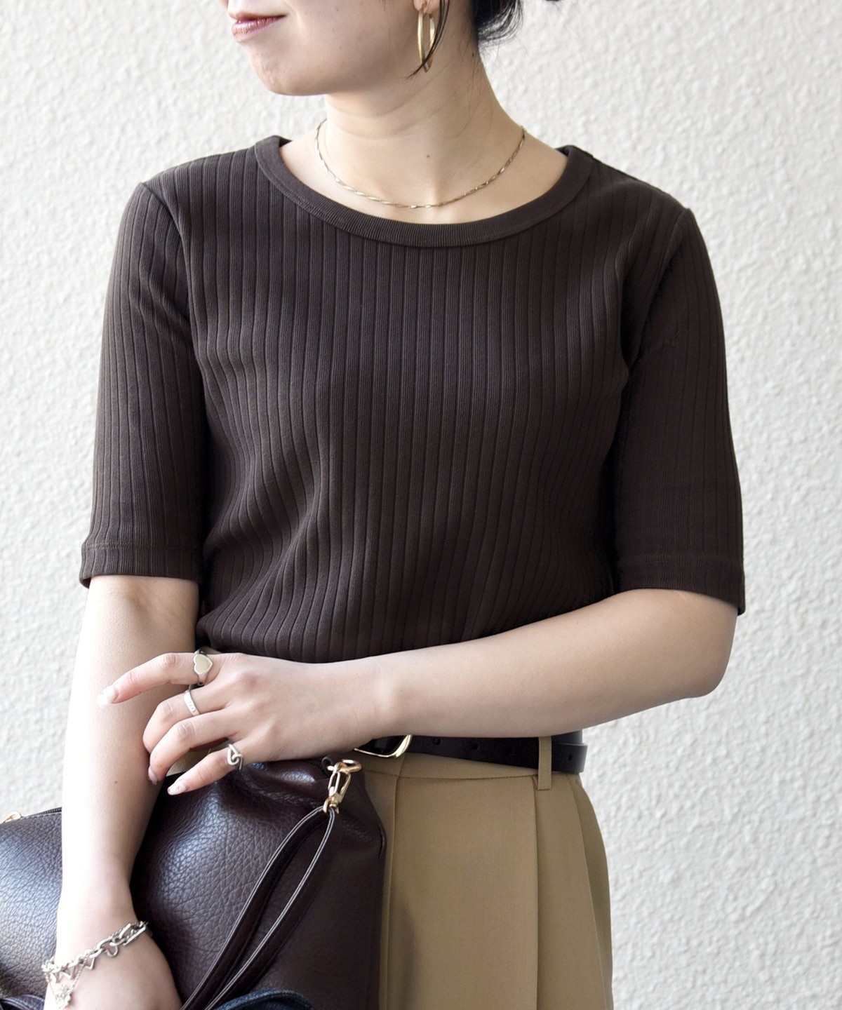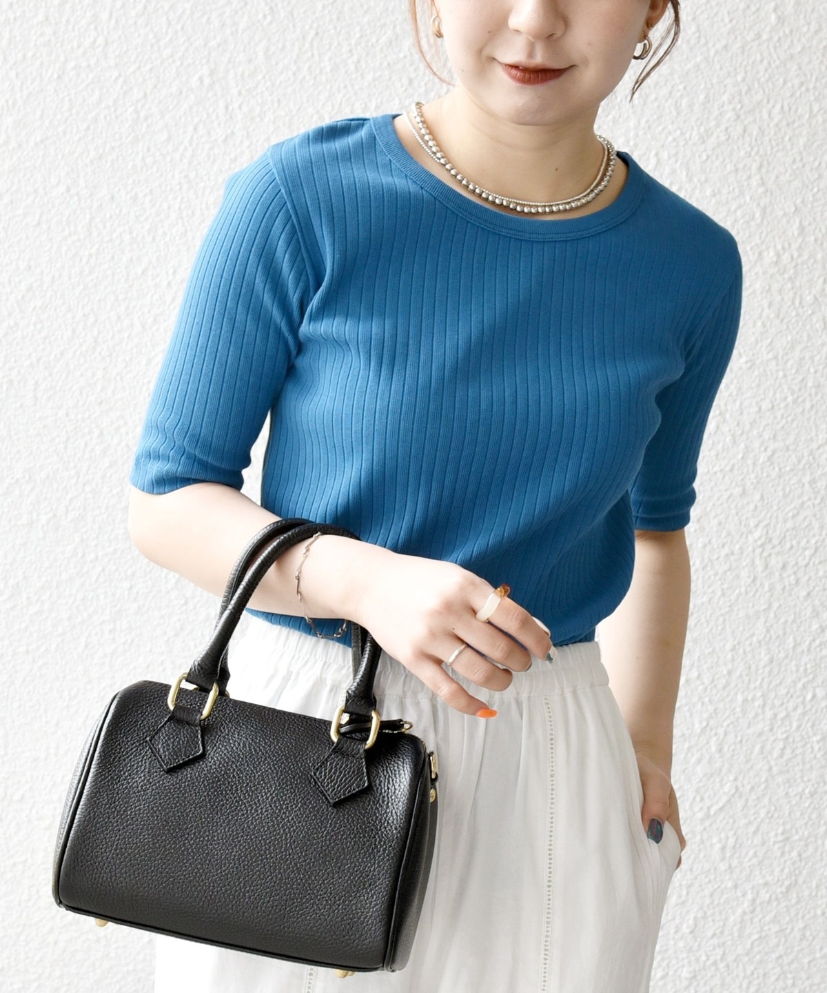 デコルテラインがすっきりと見えるクルーネックをセレクト。