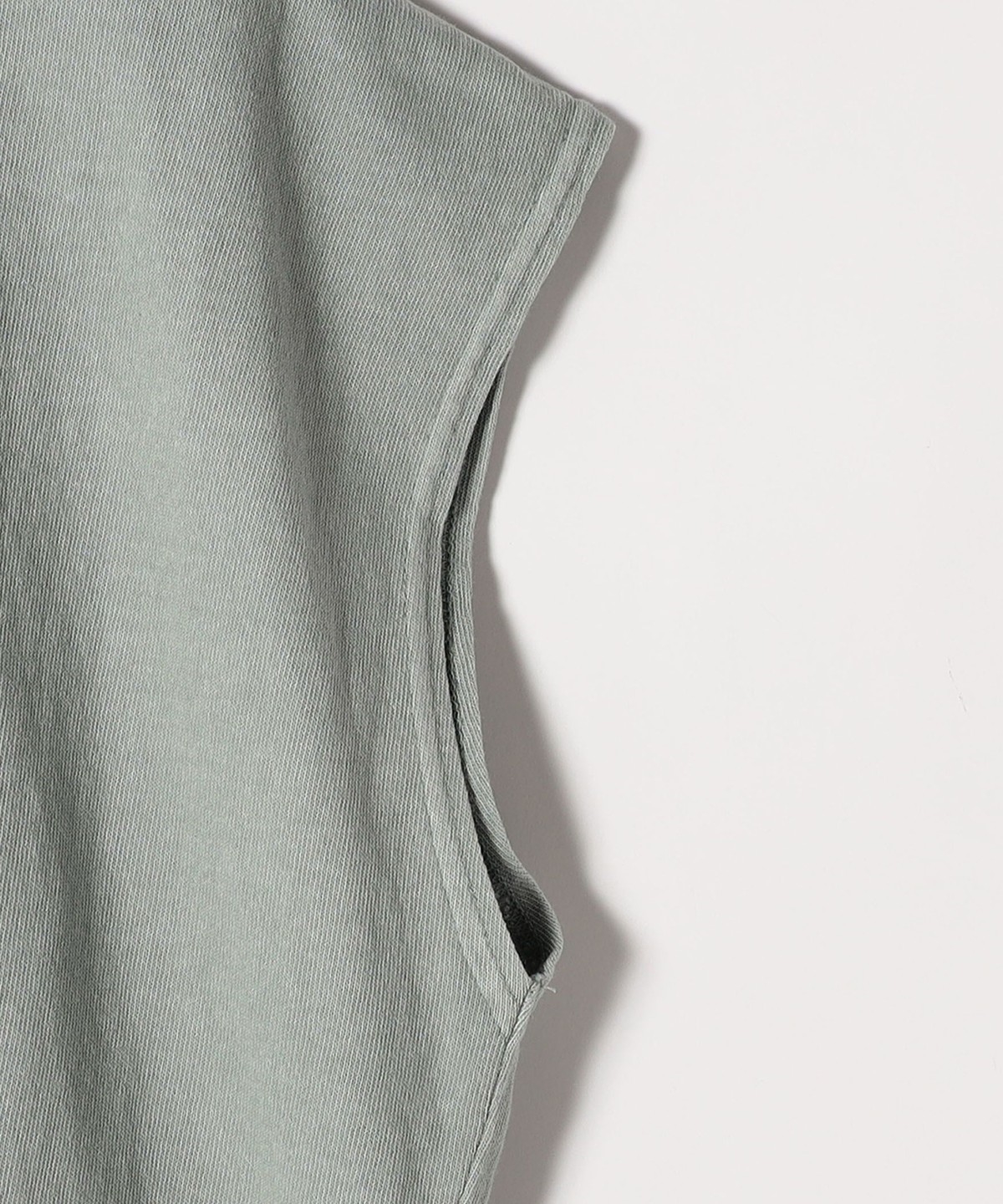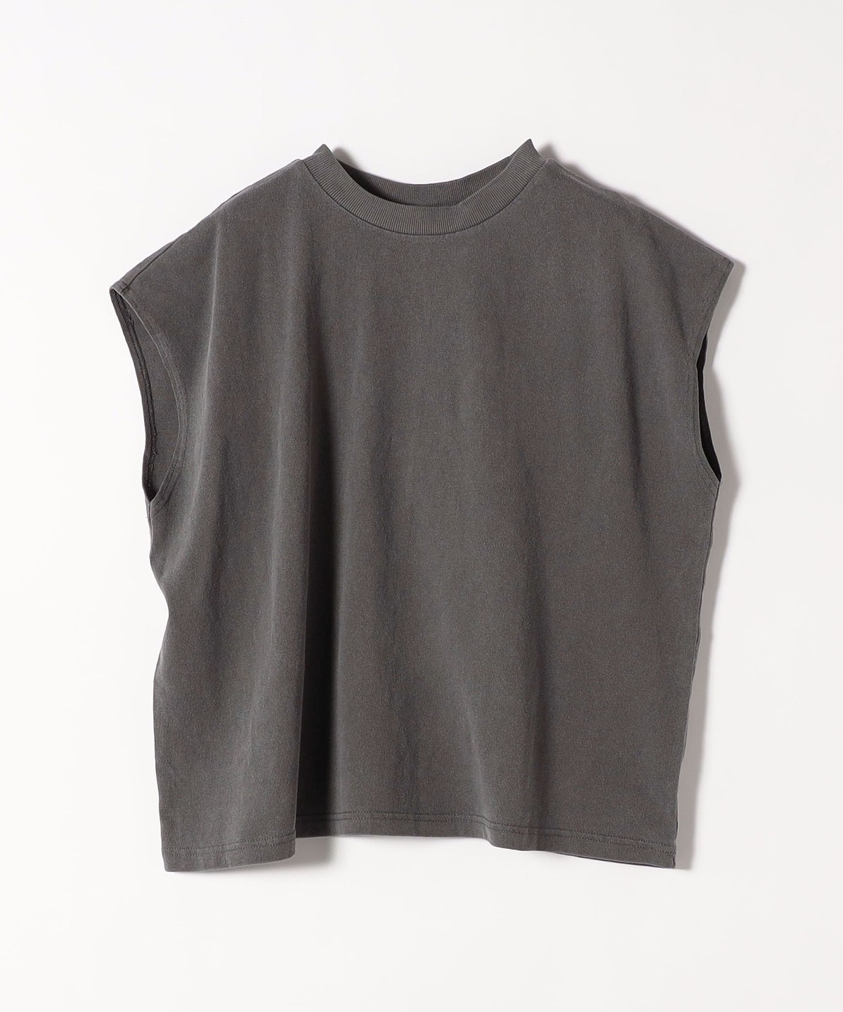 ヴィンテージライクな風合いのコットン素材を使用した、クルーネックノースリーブTシャツ。