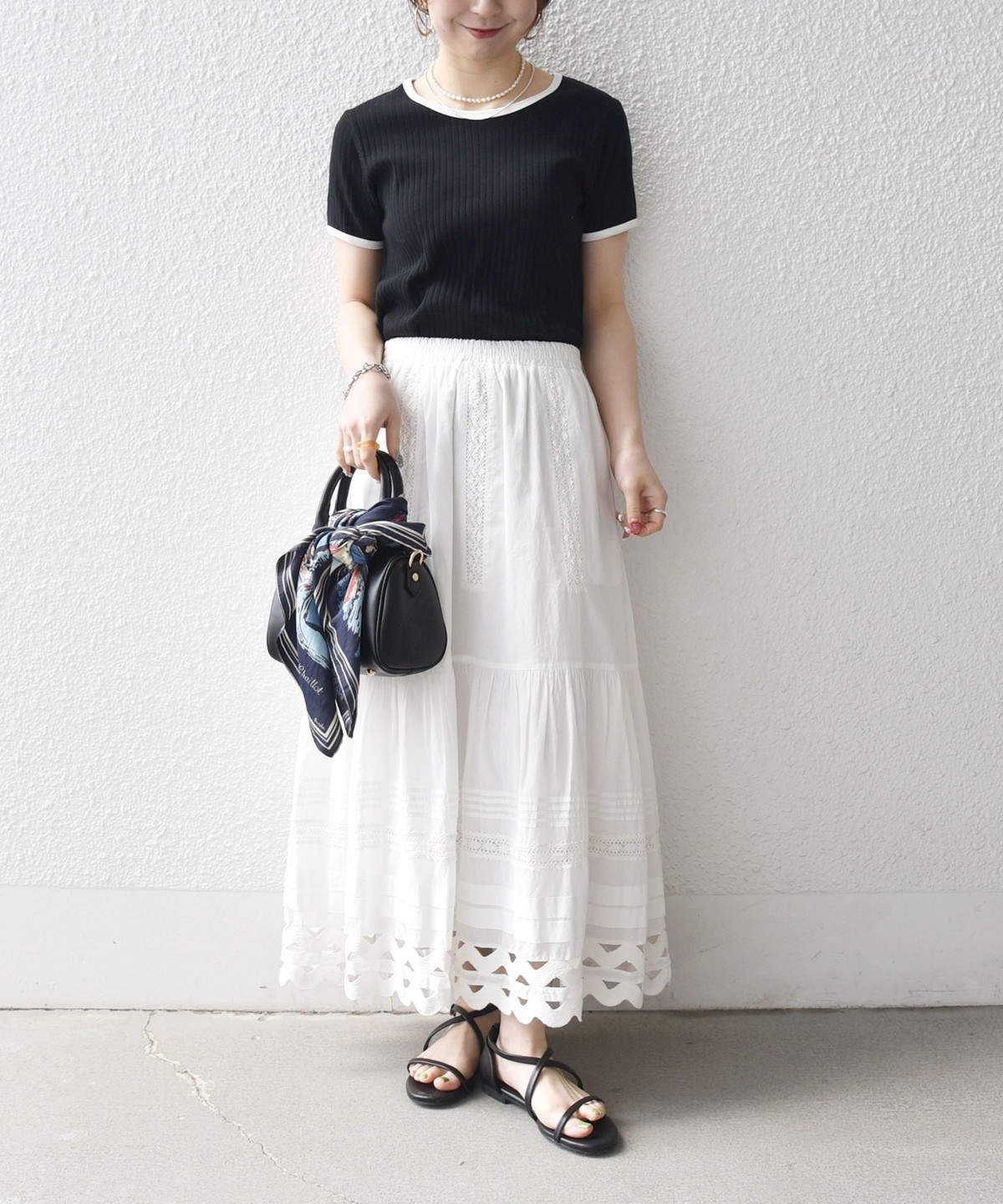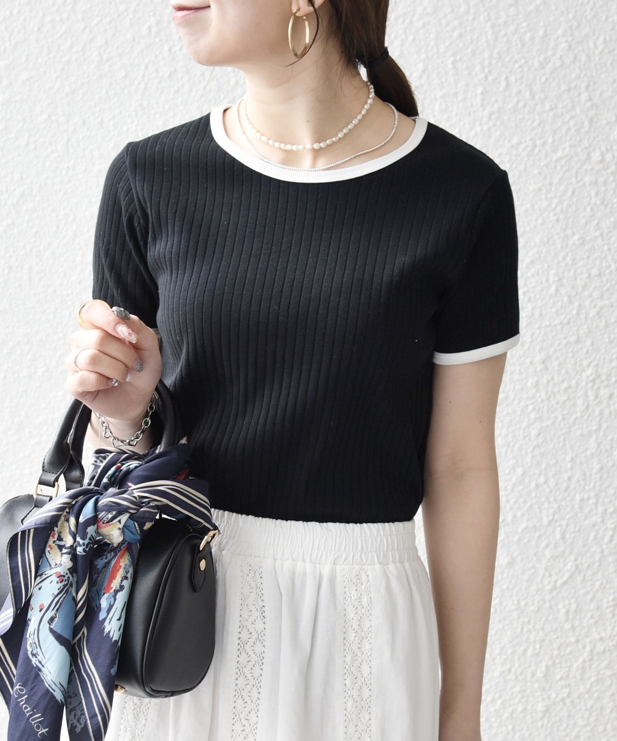 首まわりと袖口の配色パイピングも、シンプルなコーディネートにアクセントをプラスしてくれます。