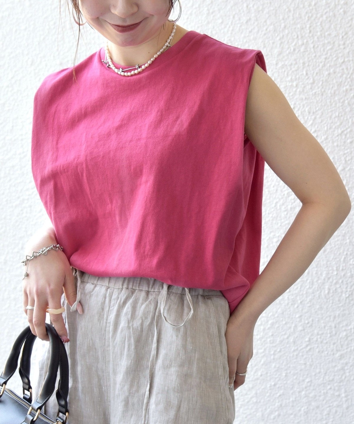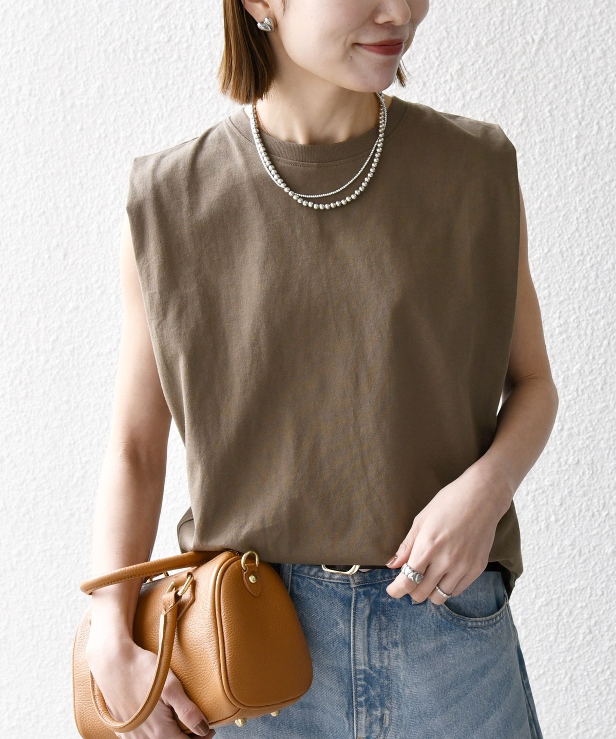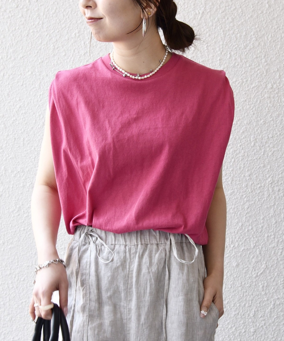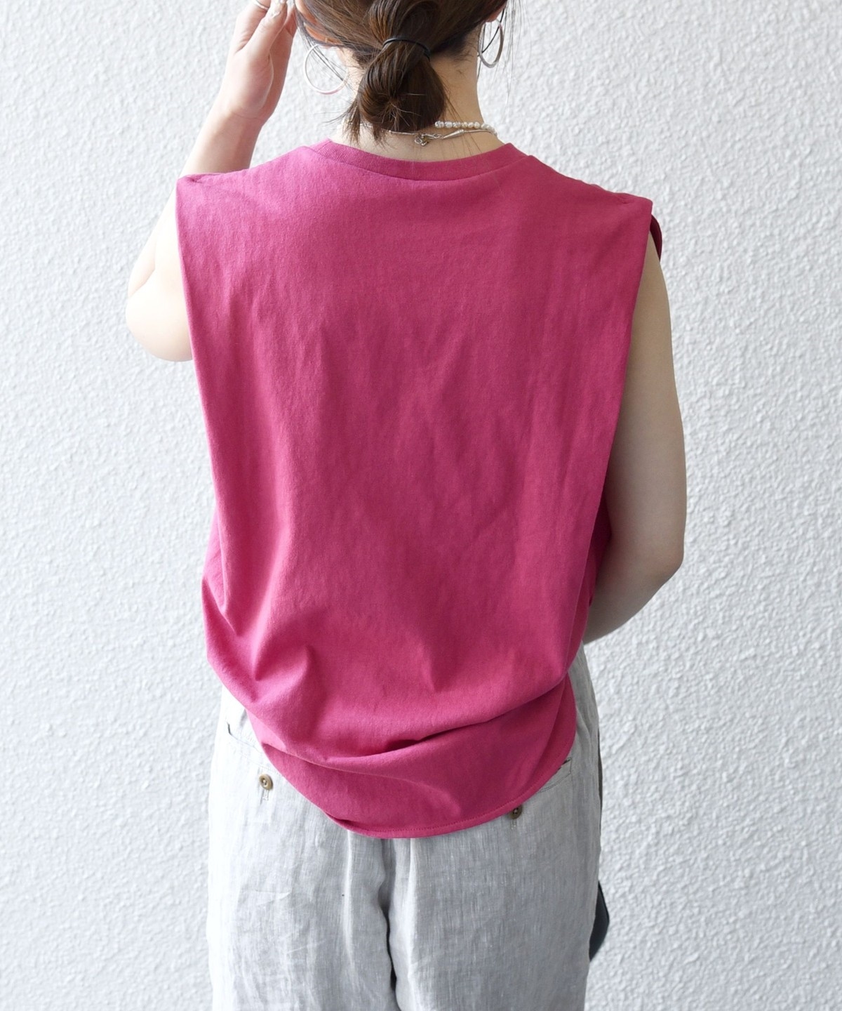 カジュアル過ぎないシンプルな大人のノースリーブカットソー。