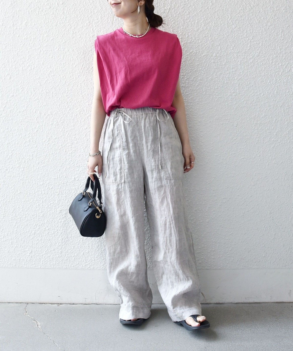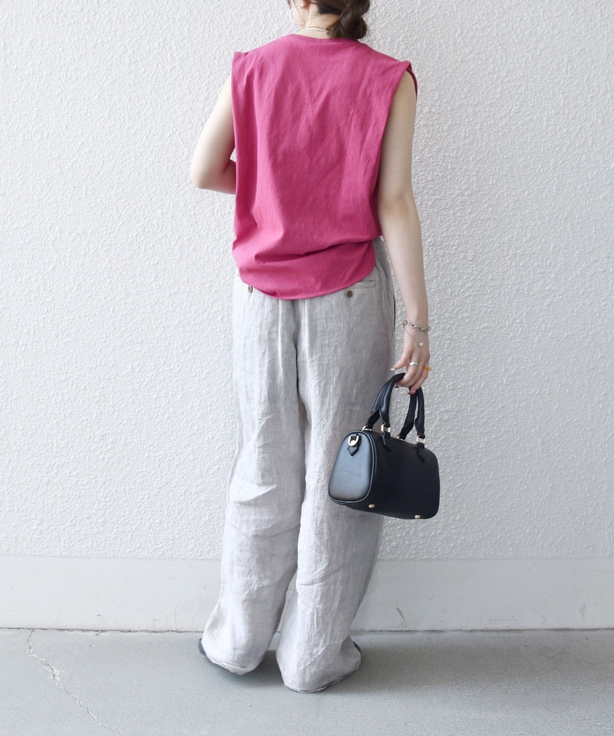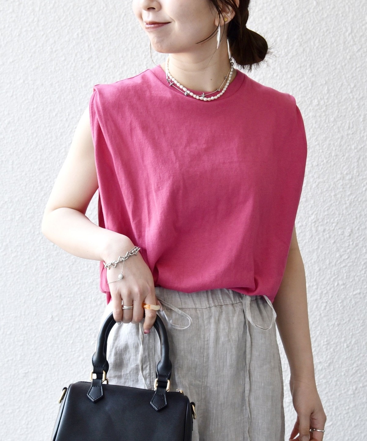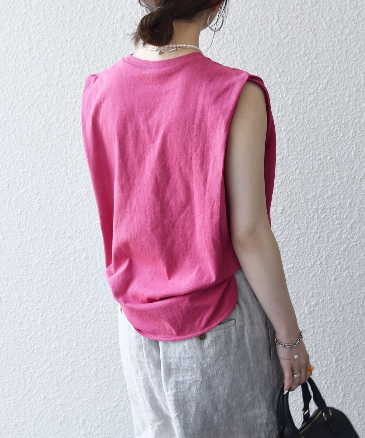 カジュアル過ぎないシンプルな大人のノースリーブカットソー。