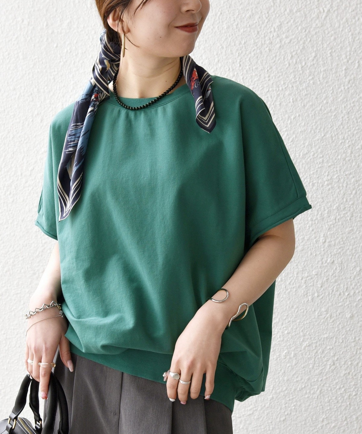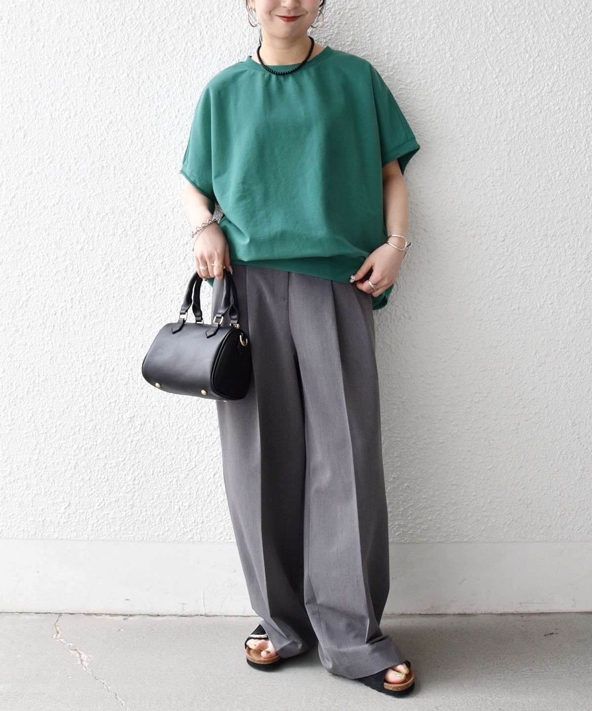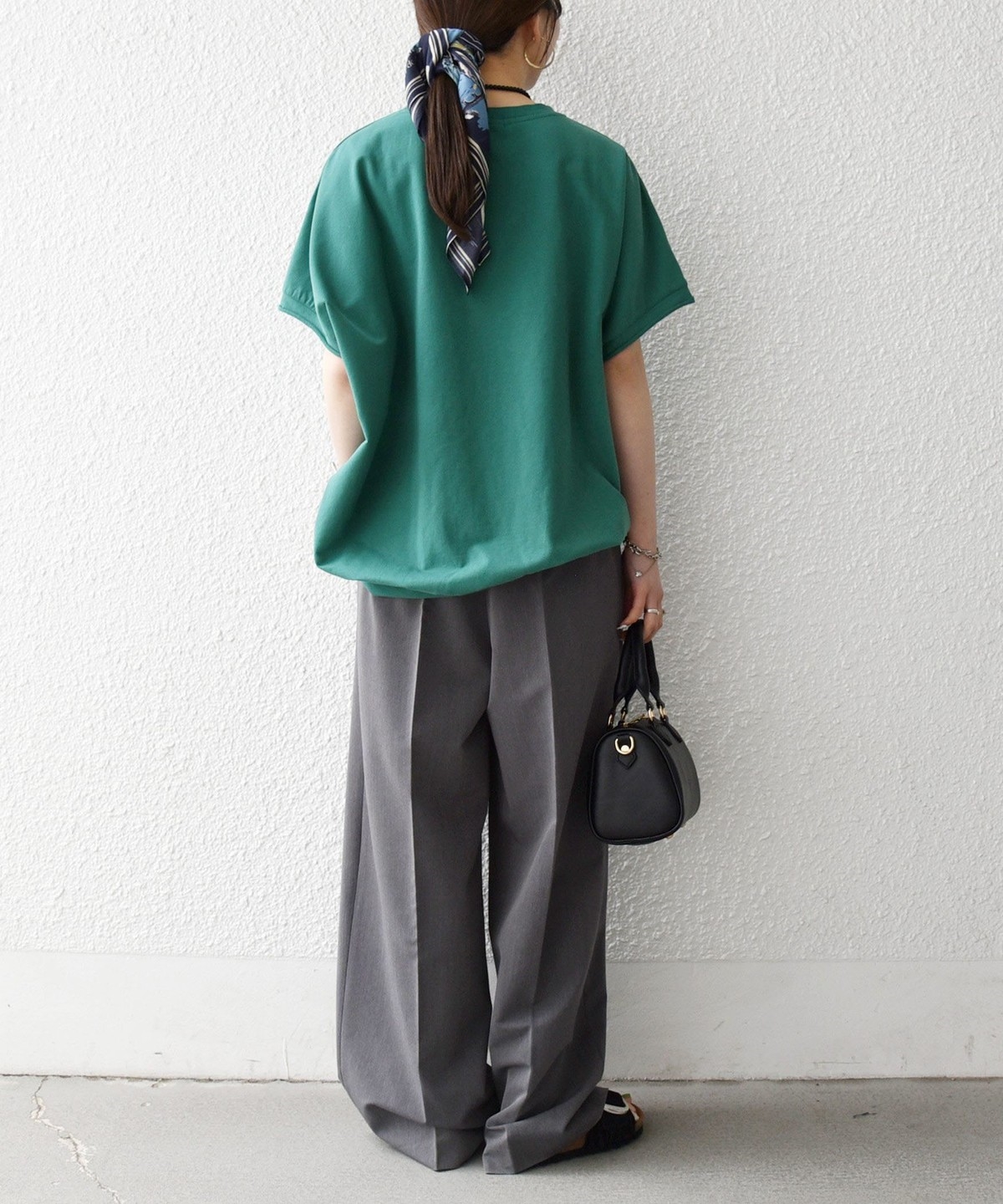 柔らかい生地感なので、ワイドパンツと合わせる時はタックインしてバランスを取るのがおすすめ。