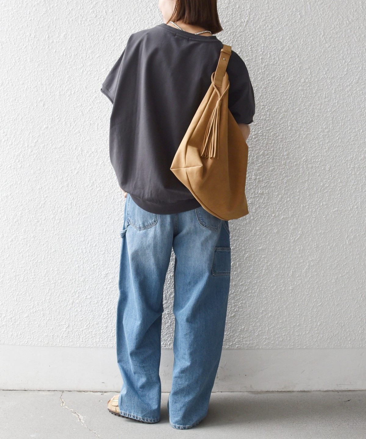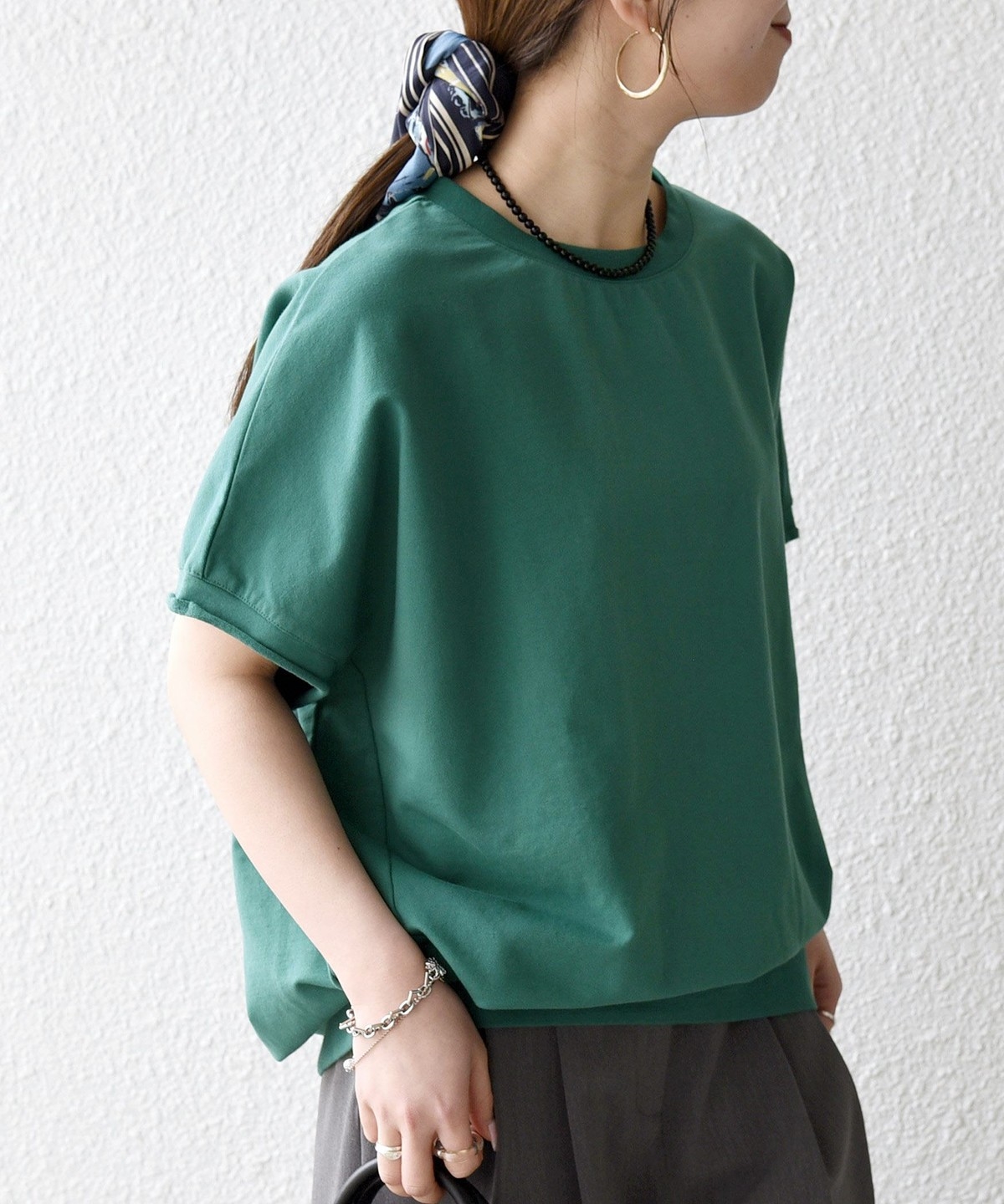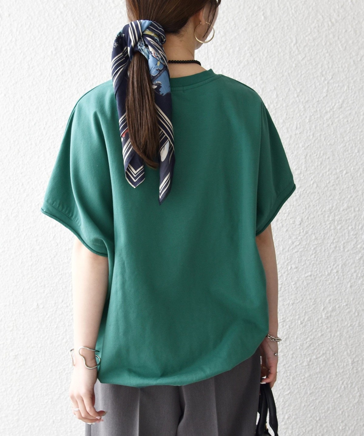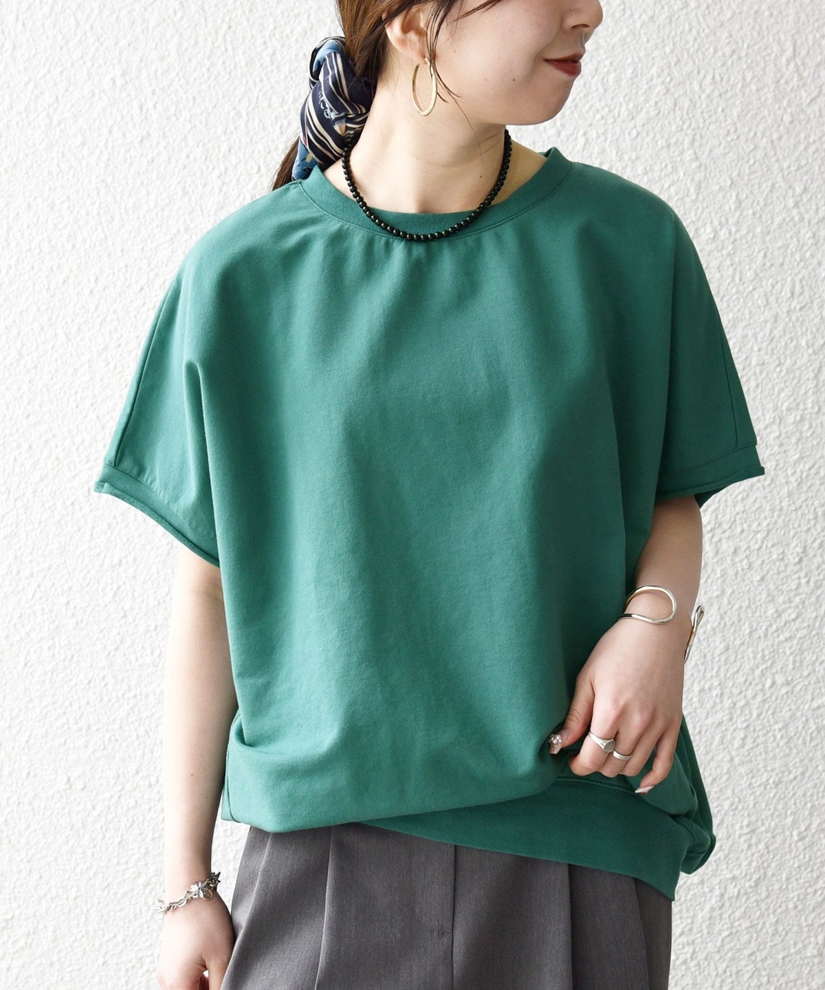 柔らかい生地感なので、ワイドパンツと合わせる時はタックインしてバランスを取るのがおすすめ。