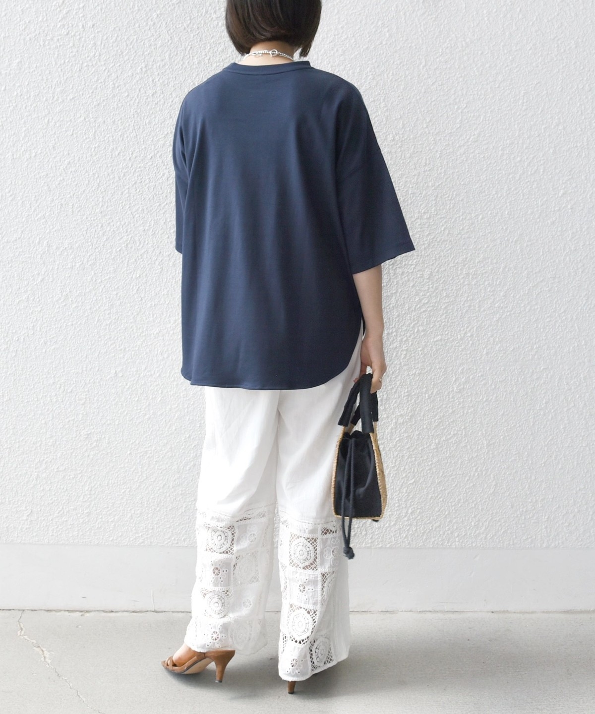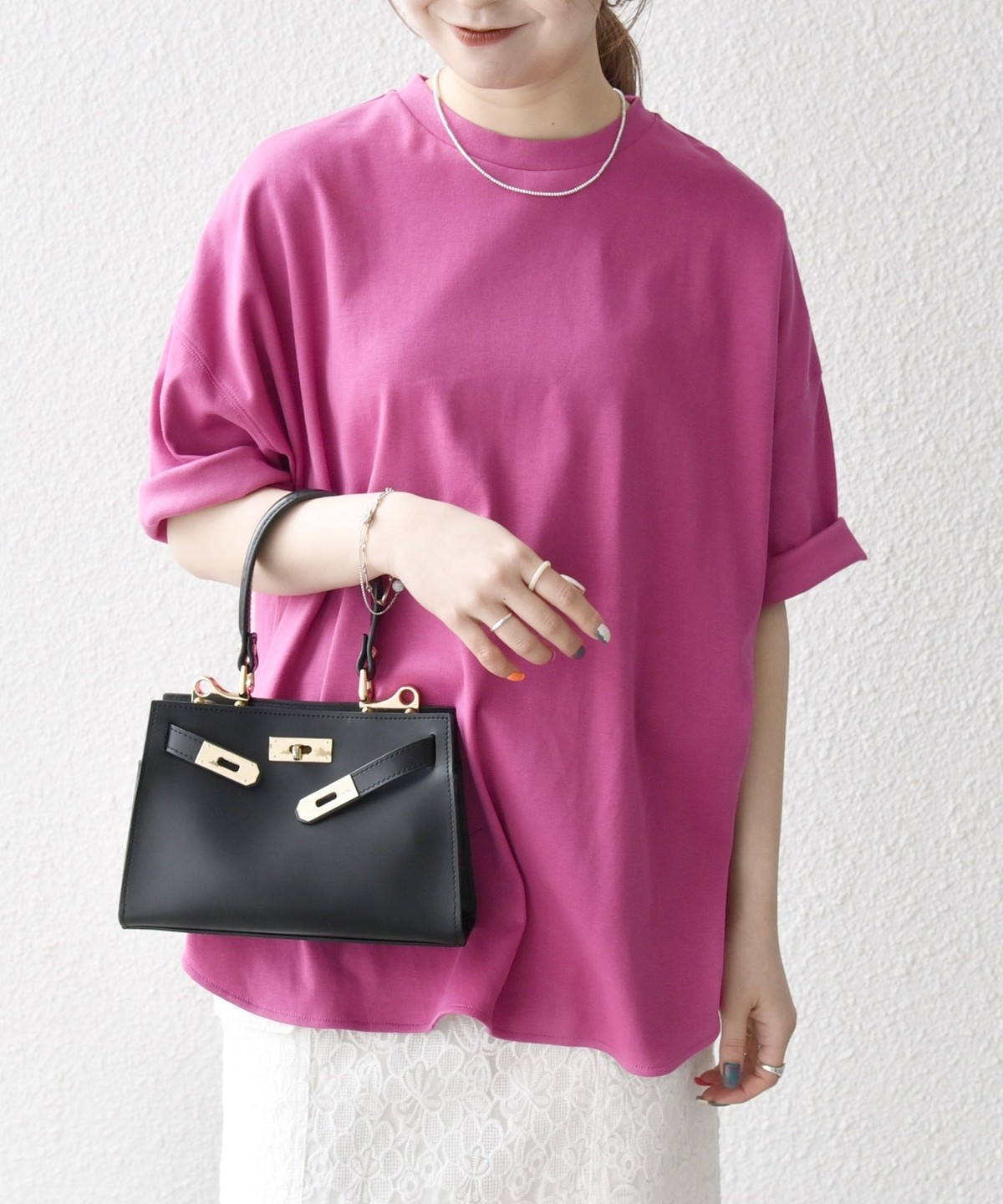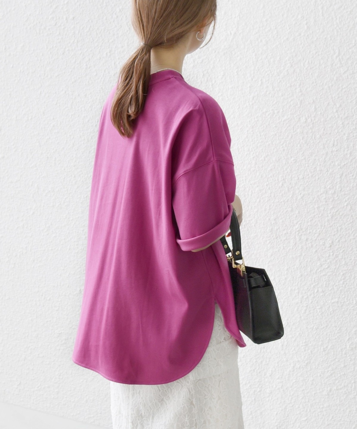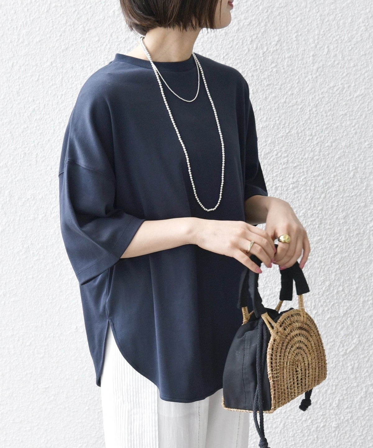 サイドにスリットが入っているので、ナロースカート等スッキリ目のボトムと合わせる際はタックインしなくてもバランス◎です。